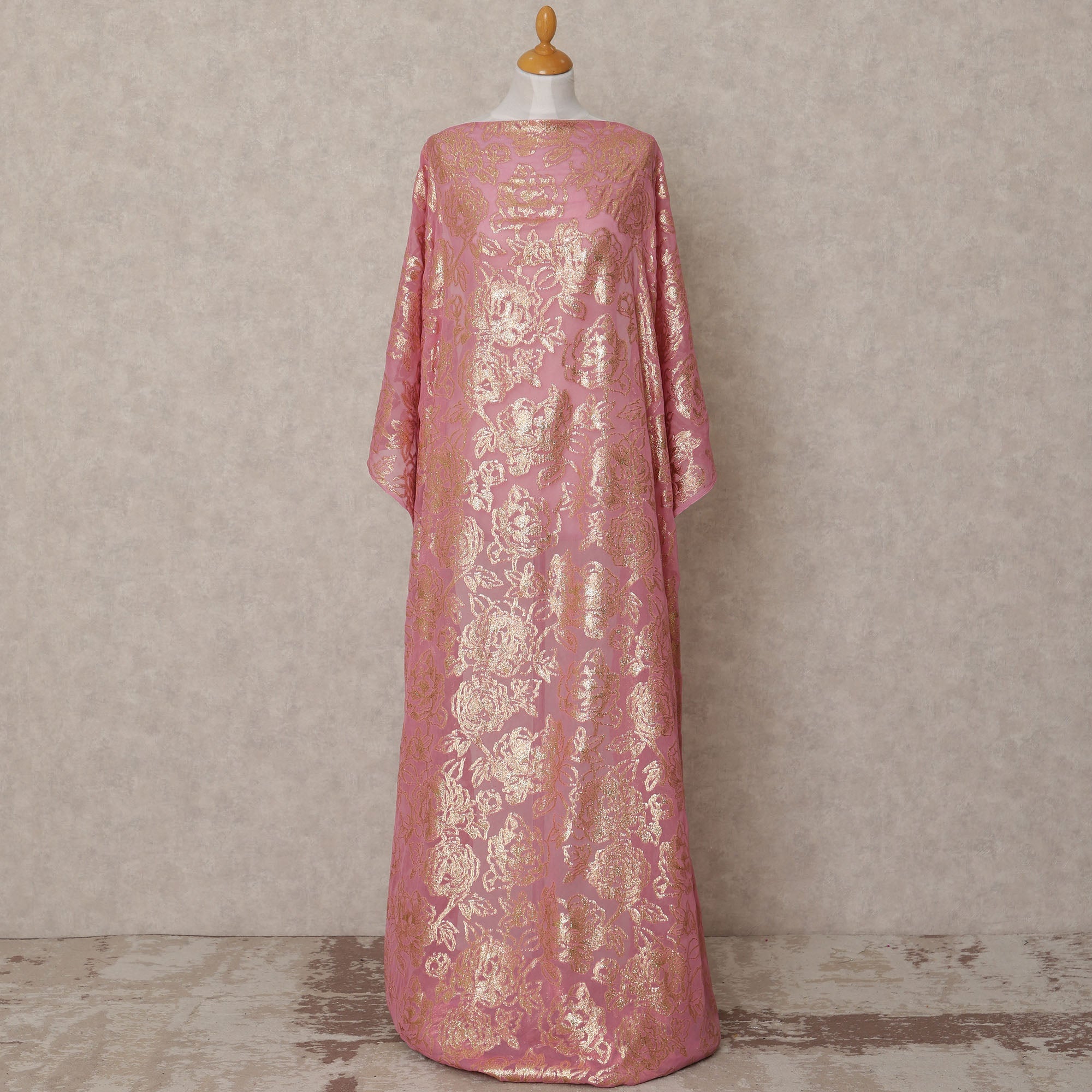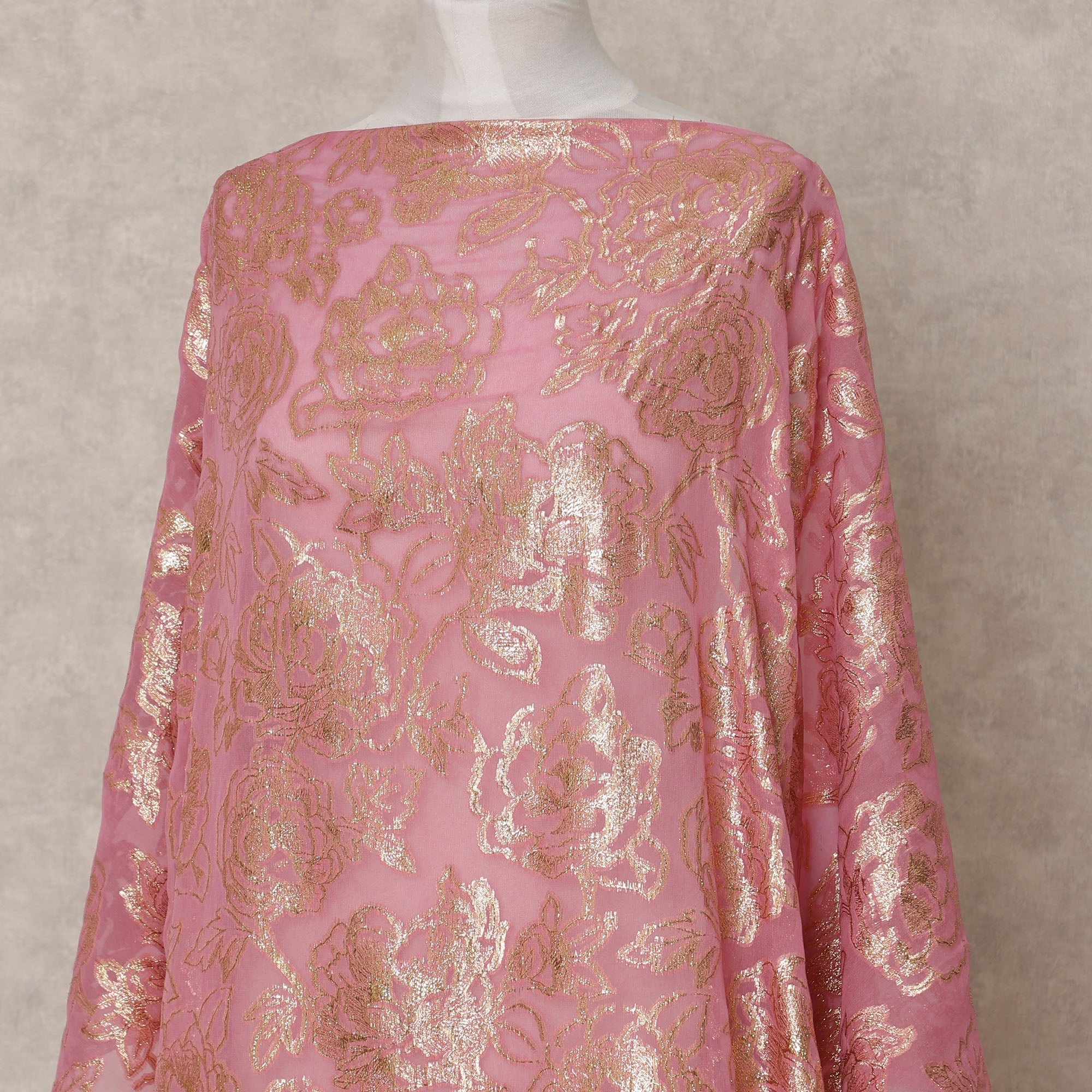 Rose Pink Somali Chiffon Dirac with Gold Floral Metallic Lurex Design, 3.5 Mtrs, Width 140 Cms, Made in South Korea-D24044