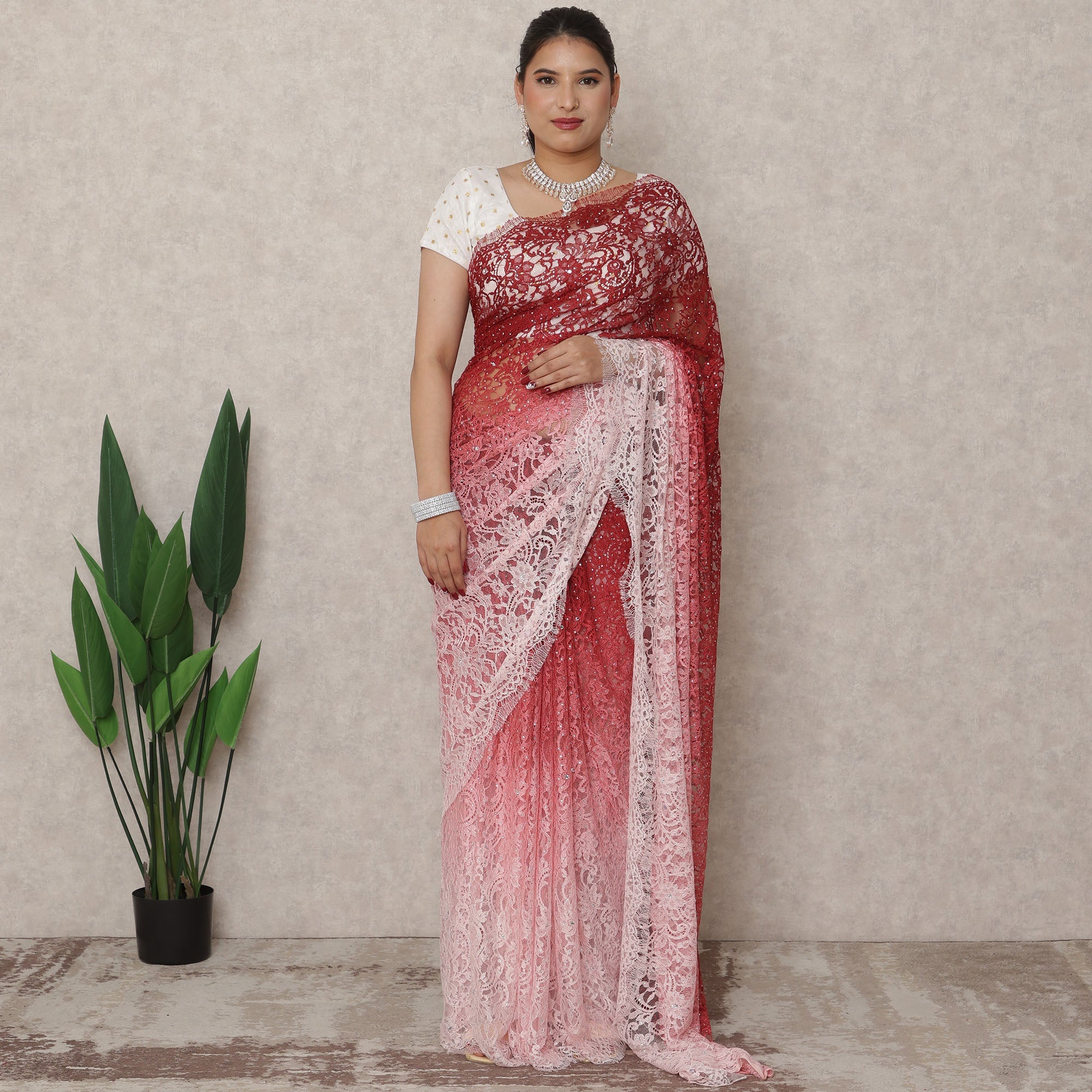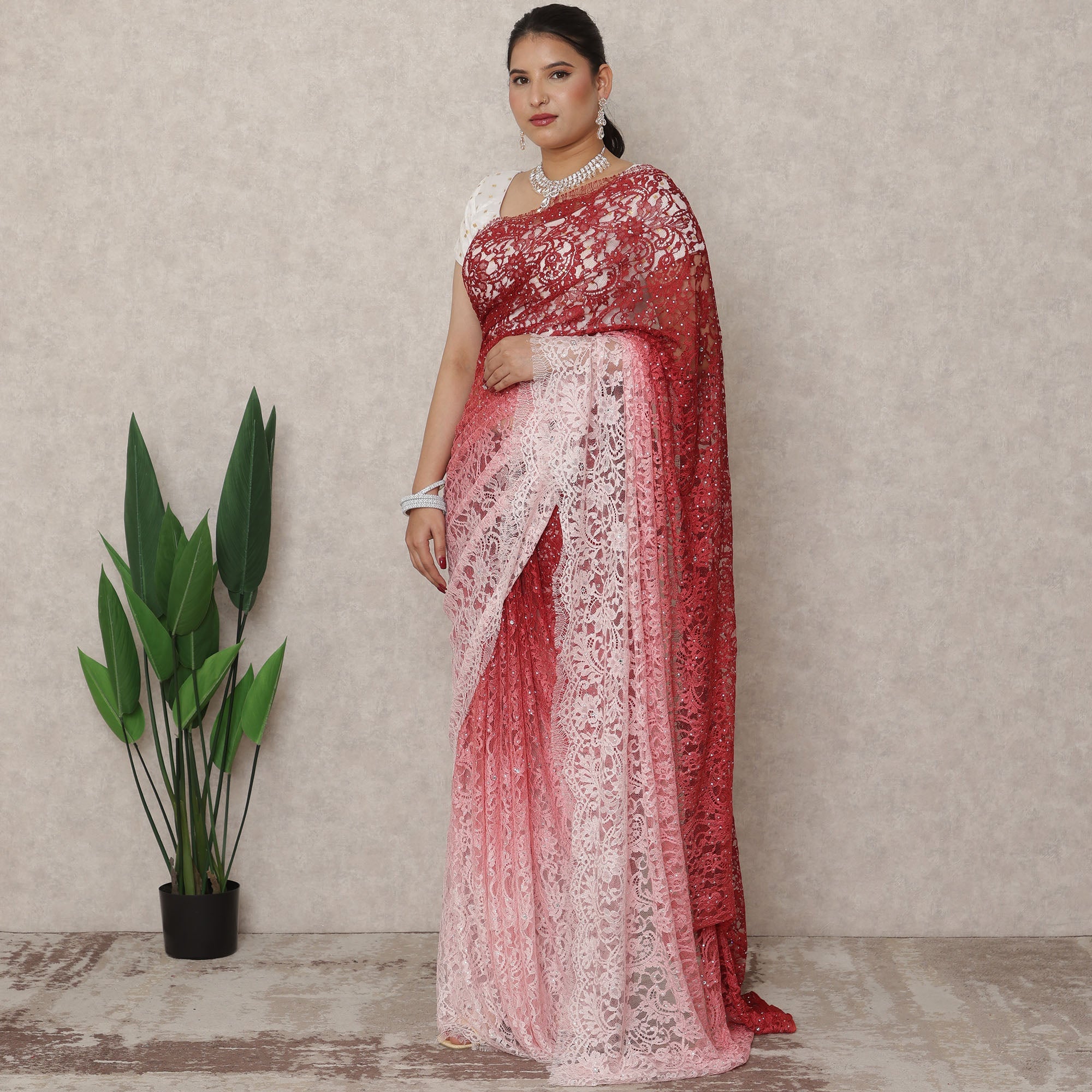 Rose Pink to Deep Red Ombre Premium French Chantilly Lace Saree with Stone Work, 5.5 Mtrs Length, 110 Cms Width, Made in France-D24415
