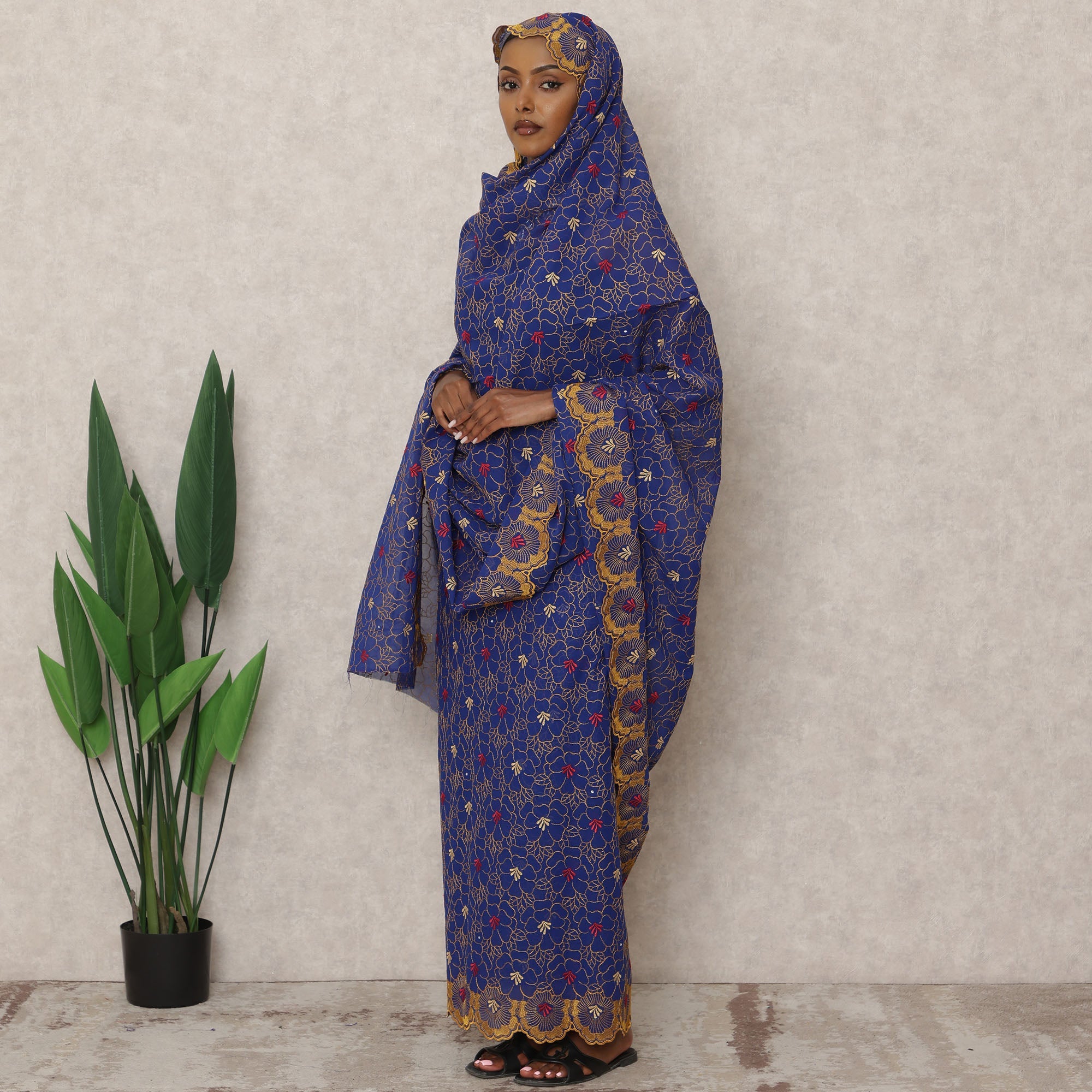 Embrace royal elegance with this regal royal blue Sudanese thobe, meticulously crafted from pure Swiss cotton voile to ensure superior softness, breathability, and drape. Measuring 4.5 meters in length and 140 cm in width, this premium traditional wear is richly adorned with intricate floral embroidery in vibrant mustard and red threads, enhanced with delicate shimmering stones and scalloped edges for a luxe ethnic appeal. The blend of Swiss precision and Sudanese artistry gives this piece timeless beauty and cultural significance, making it ideal for weddings, festivals, or formal gatherings. Shop online today to experience authentic tradition wrapped in world-class comfort and craftsmanship.
