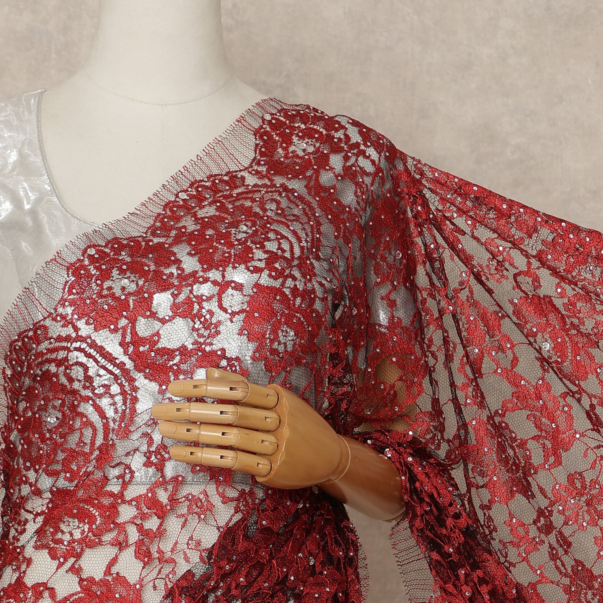 This Ruby Red Premium French 2 Tone Chantilly saree lace with stone work is a bold and luxurious imported fabric from France, designed for women who love statement elegance and rich detailing. Crafted with intricate two tone Chantilly lace patterns and enhanced with delicate stone embellishments, this 5.5 meter piece with a 110 cm width offers a dramatic drape and captivating shimmer that elevates the saree silhouette. The deep ruby red hue combined with subtle tonal contrast and sparkle makes it ideal for weddings, bridal events, receptions, and grand festive occasions. Lightweight yet richly ornate, this premium lace delivers comfort, durability, and couture-level sophistication, making it perfect for designers, boutiques, and bespoke saree creations. Blouse fabric is not included, allowing complete styling freedom.