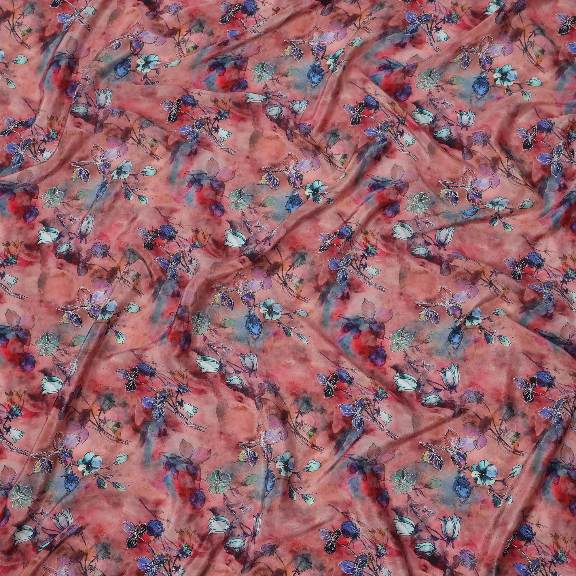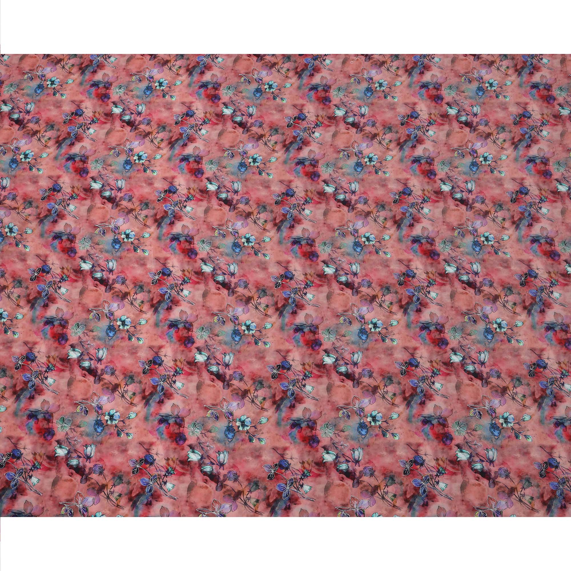 Rust red base viscose fabric with watercolor-style multicolor floral print, 110 Cms, India-D23851