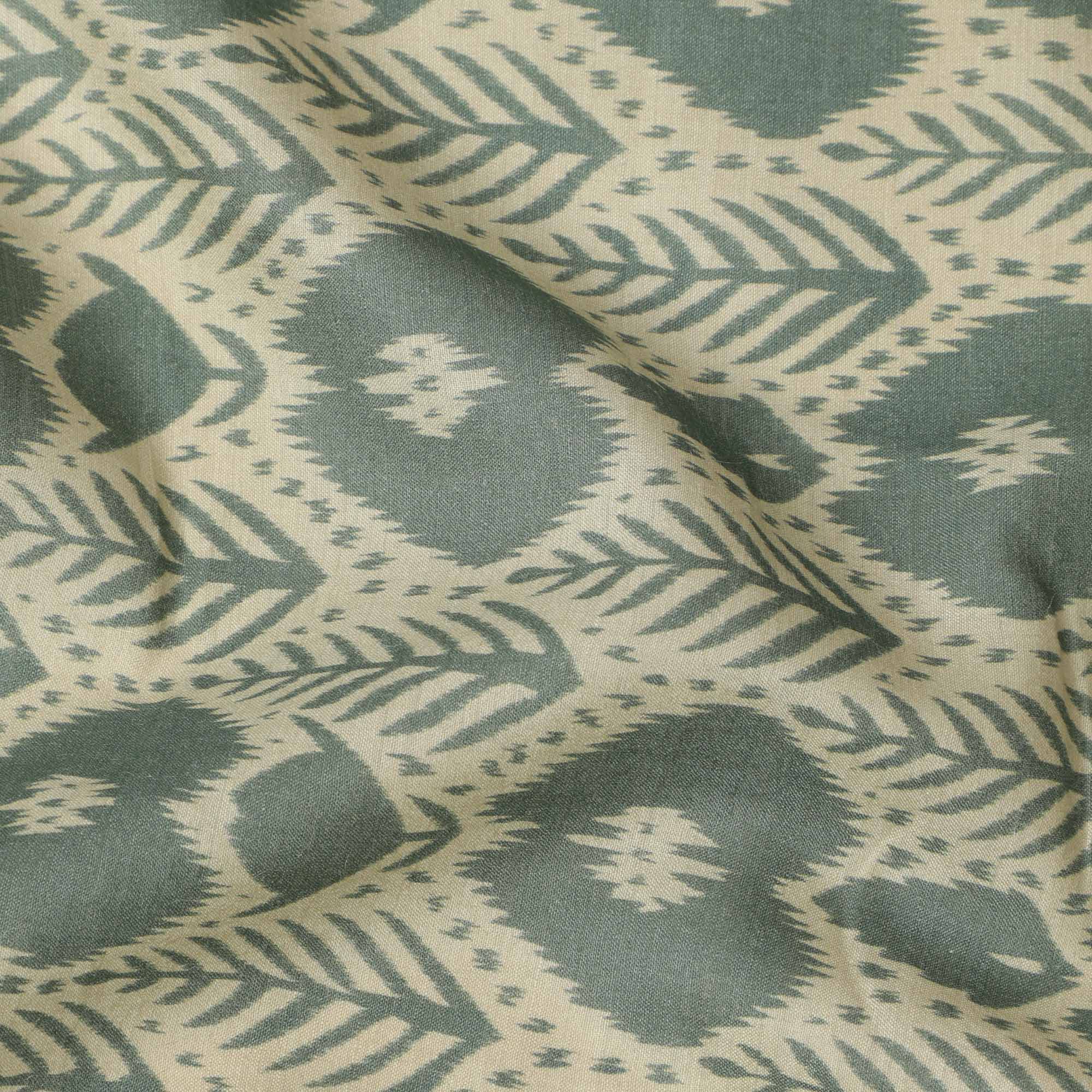 Sage green floral and geometric ikat motifs on a soothing beige background