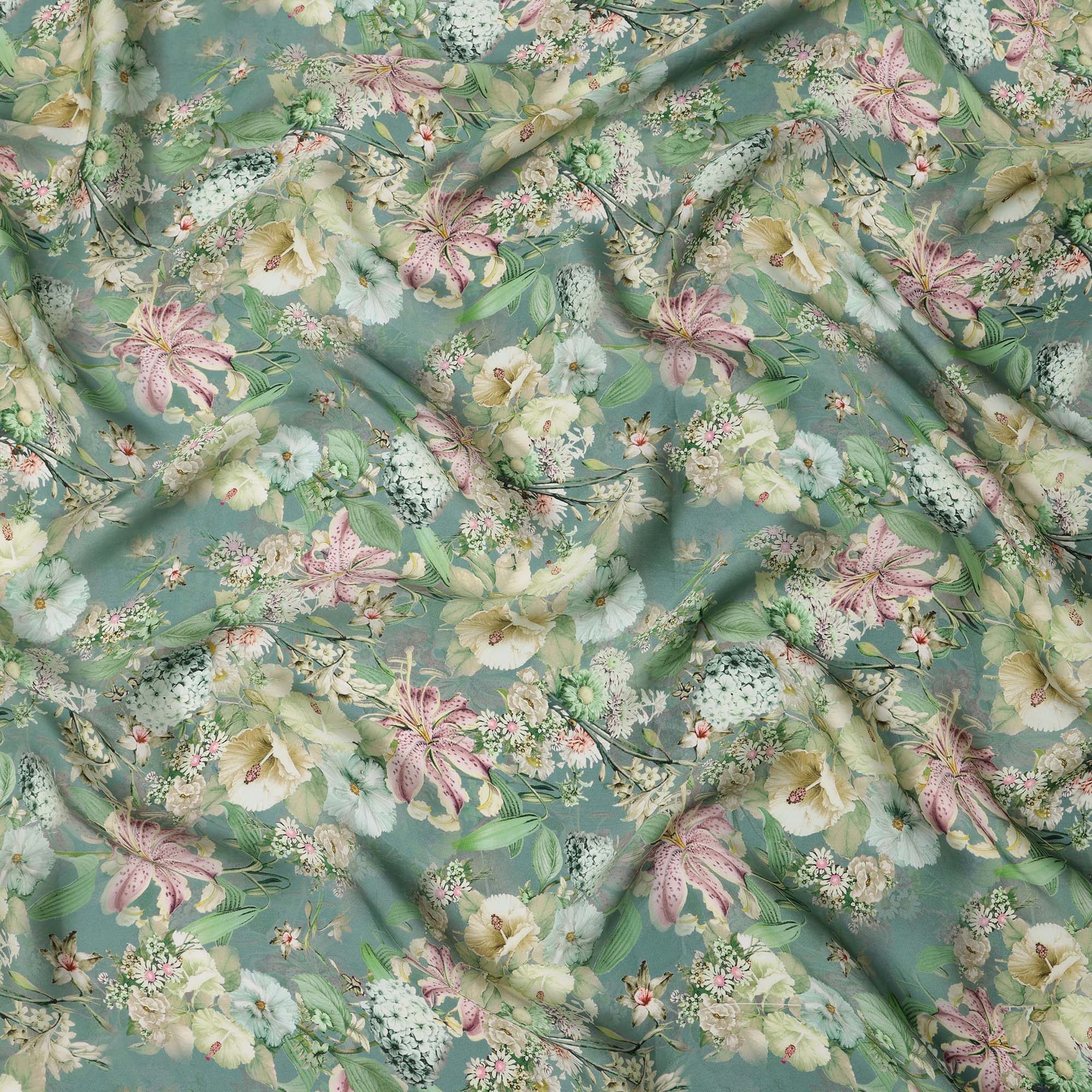 Elevate your fashion and décor projects with this sage green and multicolor floral synthetic satin fabric, featuring a stunning array of delicate flowers in shades of pink, cream, and green set against a soft sage green background. The 110 cm wide fabric offers a luxurious sheen and a smooth, silky texture, making it perfect for elegant dresses, scarves, blouses, and stylish home décor. Its lightweight and breathable quality ensures comfort while maintaining a graceful drape. Whether used for fashionable outfits or creative décor projects, this high-quality satin fabric adds sophistication, versatility, and a flawless finish.