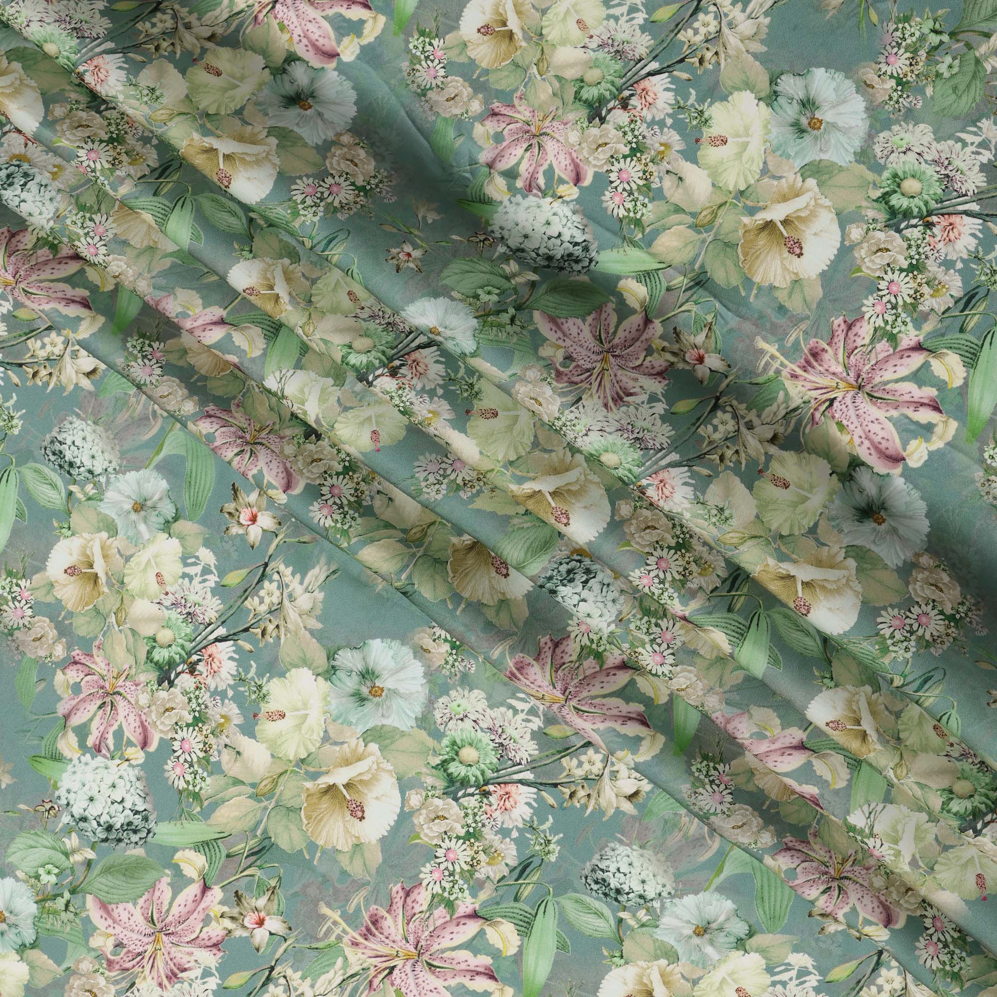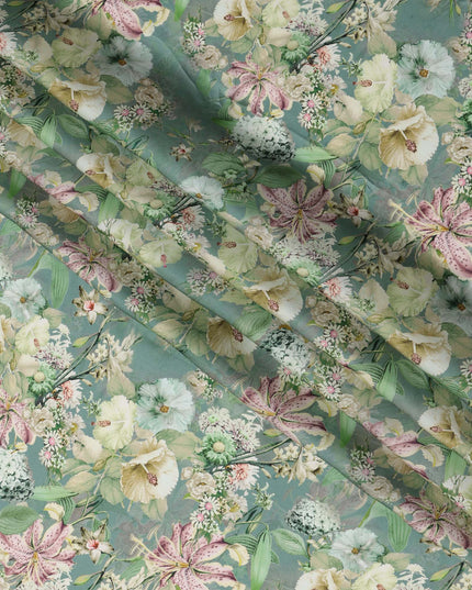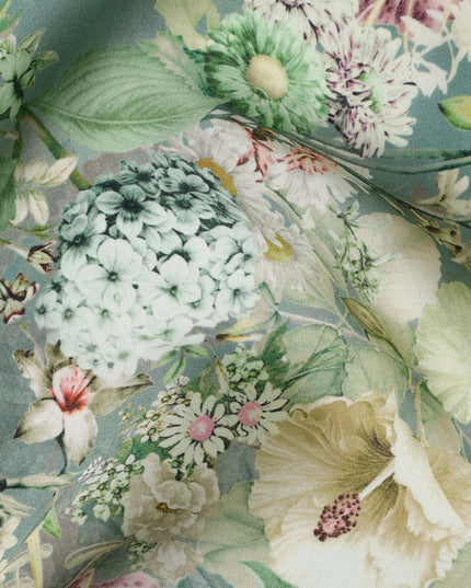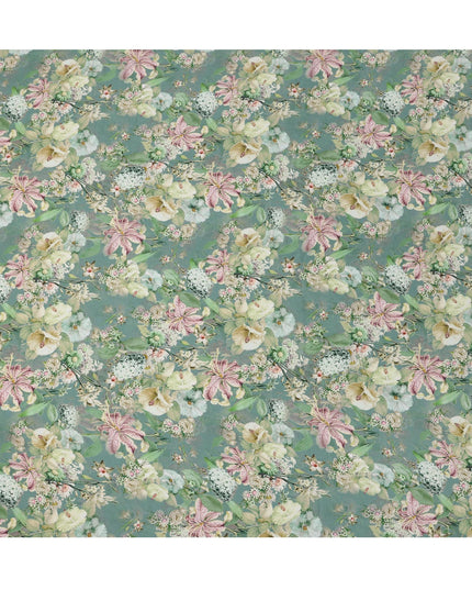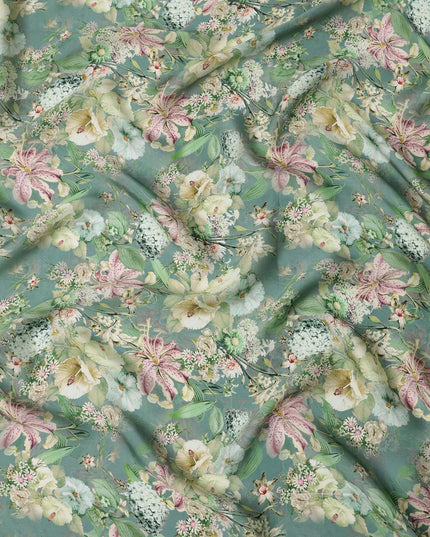 Sage Green and Multicolor Floral Synthetic Satin Fabric – 110 cm Width, Soft & Lustrous-D21910