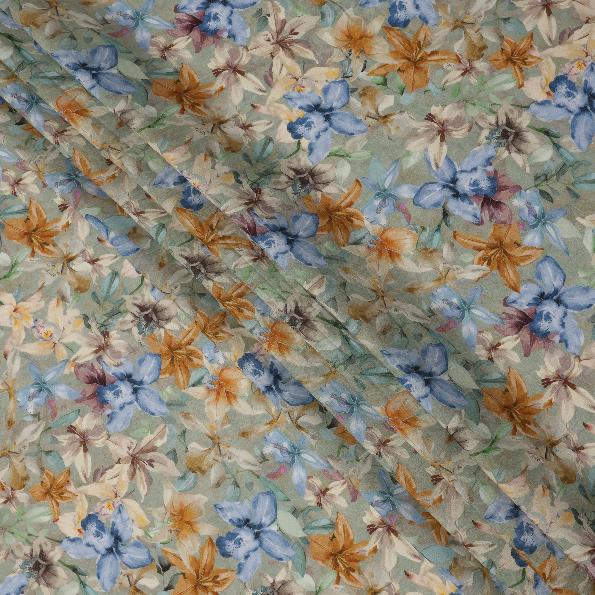 Sage Green Base Multicolor Tropical Bloom Floral Printed Viscose Crepe Fabric, 110 Cms Width, Made in India-D23979