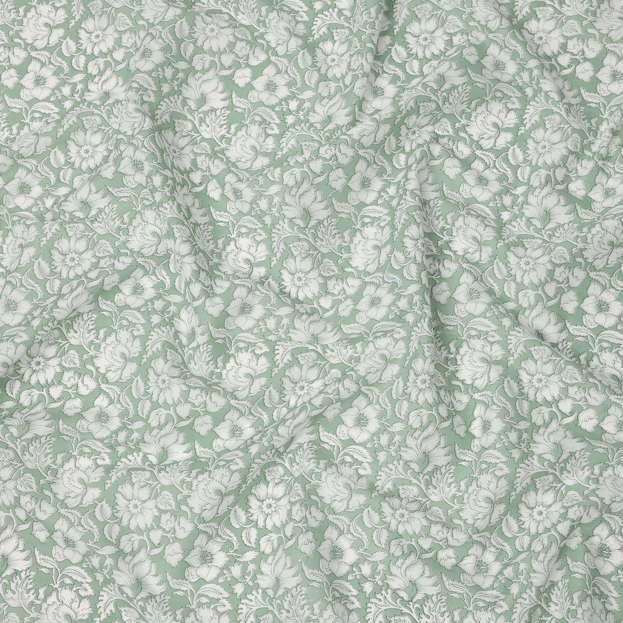Sage Green Base White Traditional Floral Printed Cotton Lawn Fabric with Intricate Outline Detailing, 110 Cms Width, Made in India-D24276