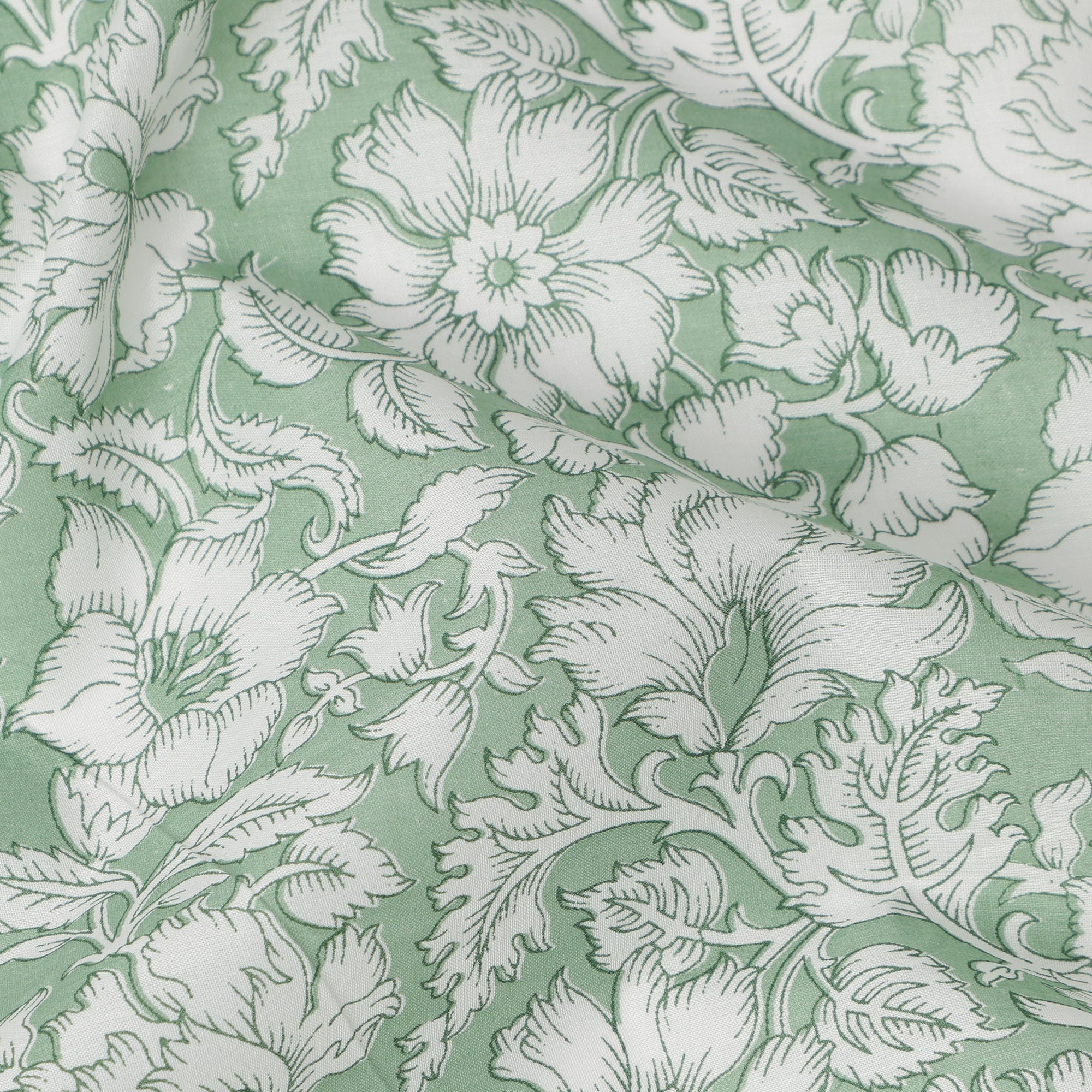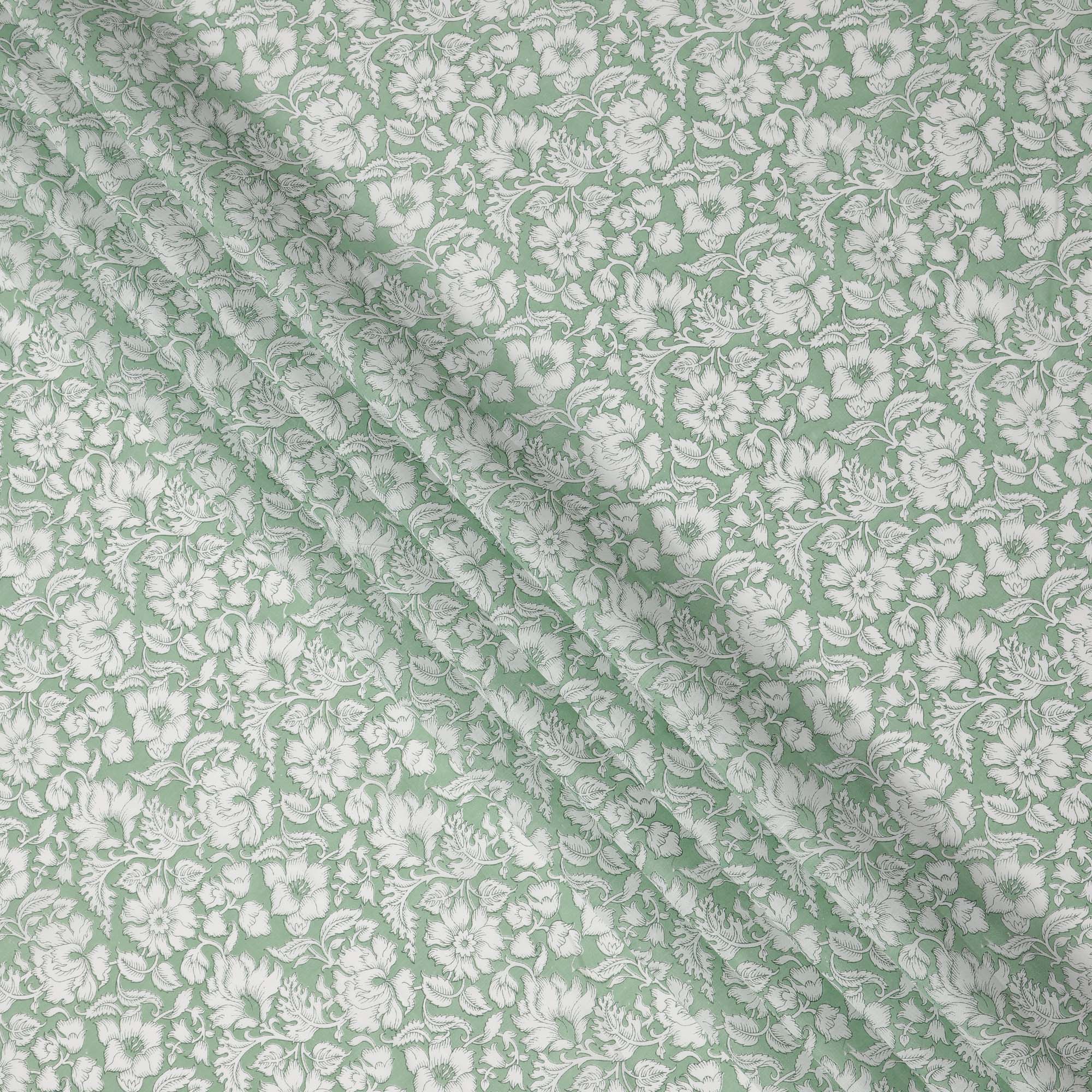 Bring home the charm of refined tradition with this sage green base cotton lawn fabric adorned in classic white floral prints outlined with intricate precision. The subtle pastel green tone offers a soothing, earthy aesthetic perfect for both everyday and occasion wear, while the detailed floral motifs evoke timeless Indian artistry. Woven from lightweight and breathable cotton lawn, it ensures supreme comfort and elegant drape for dresses, blouses, kurtis, and flowy garments. The 110 cms width gives ample flexibility for versatile tailoring needs. Proudly made in India, this fabric seamlessly blends traditional design with modern practicality, making it a must-have for fabric lovers looking to shop online for soft and graceful styles.