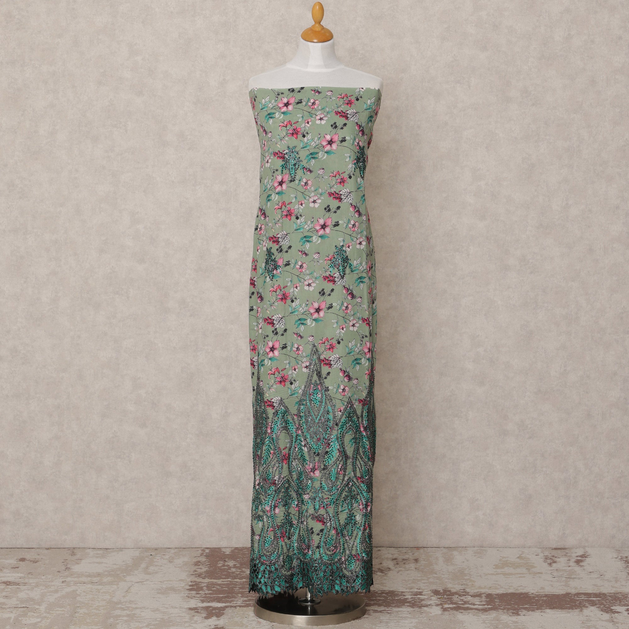 Immerse yourself in nature-inspired beauty with this sage green blended cotton fabric, adorned with a delightful spread of pink, teal, and white floral motifs, making it an exquisite choice for ethnic and fusion wear. Crafted from premium quality blended cotton, the fabric ensures both breathability and softness, ideal for year-round styling. The bottom edge features an elaborate ornamental lace-style border in dark teal and black, elevating the entire aesthetic with a touch of grandeur. Measuring 130 cms in width and 3.0 meters in length, this piece provides ample material for sarees, kurtis, or designer suits. Made in India, it beautifully blends traditional textile elements with modern design sensibilities, making it a versatile addition to any wardrobe. Whether you're designing festive attire or elegant everyday outfits, this fabric delivers comfort and style in equal measure. Shop online now and buy this stunning fabric to redefine your ethnic collection with effortless charm.