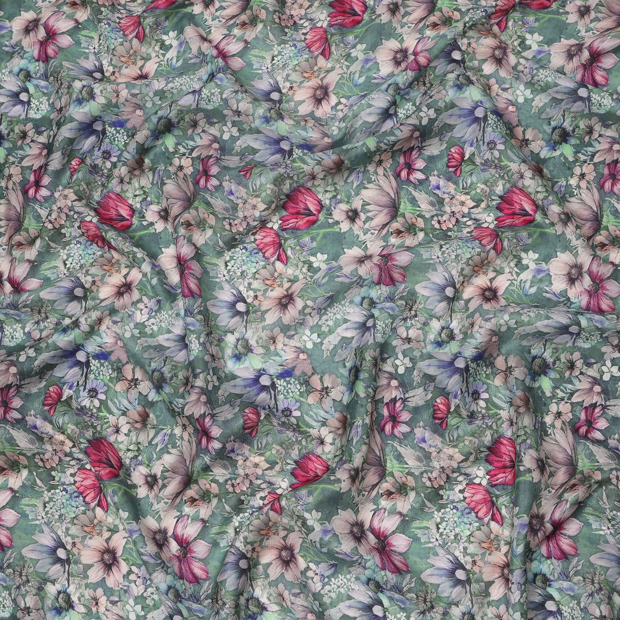 Sage Green Multicolor Botanical Floral Print Silk Crepe Fabric, Soft Digital Pattern, 110 Cms Width, Made in India-D23746
