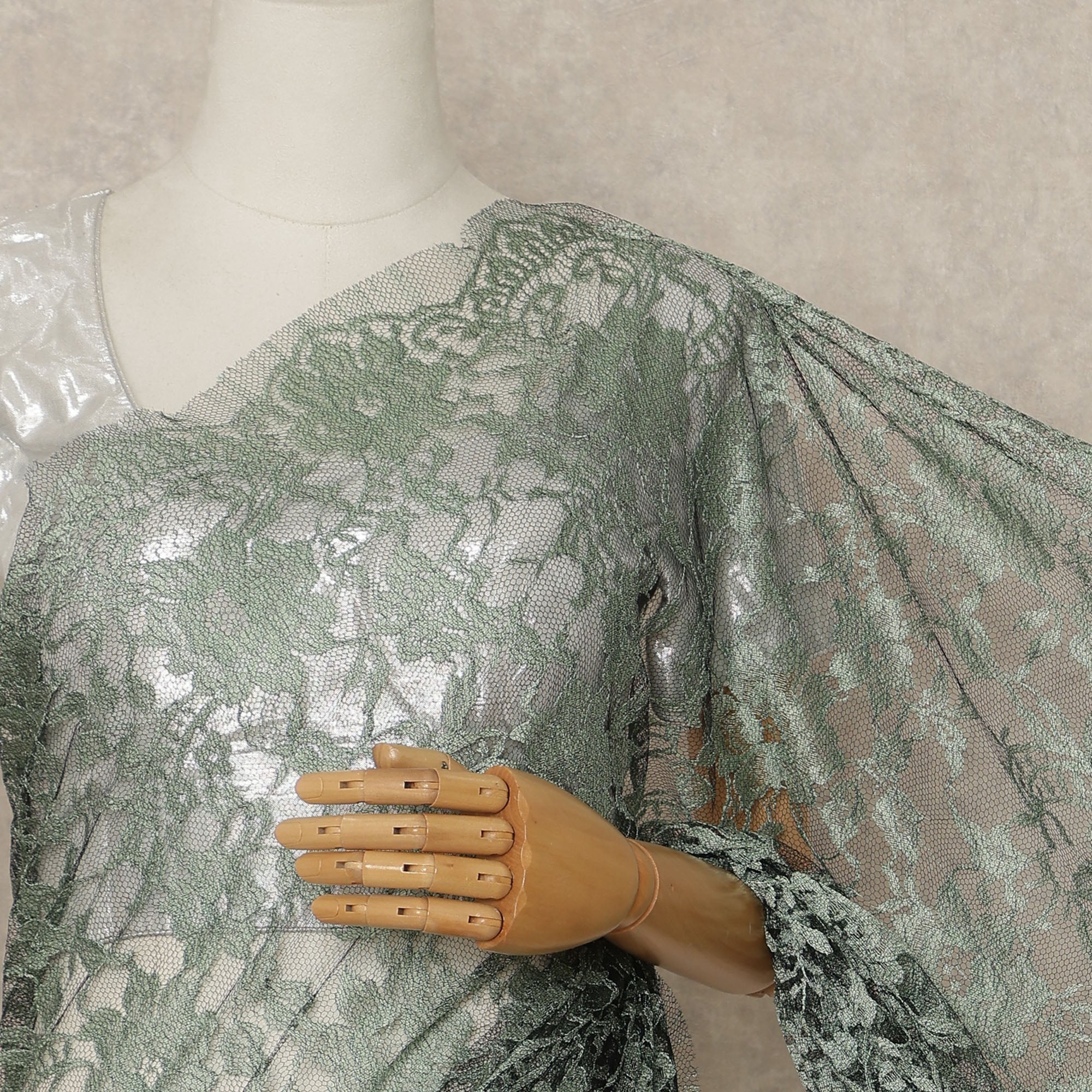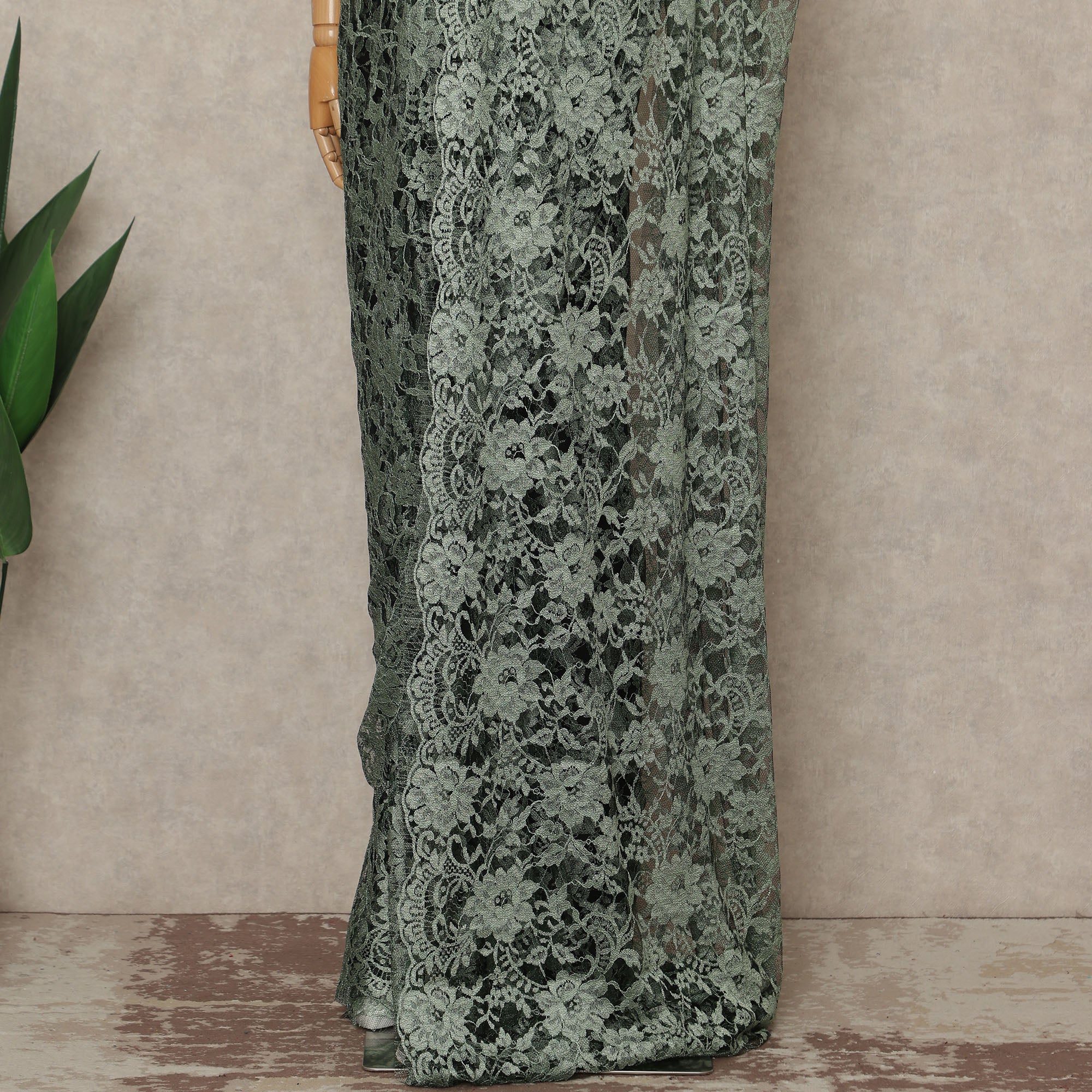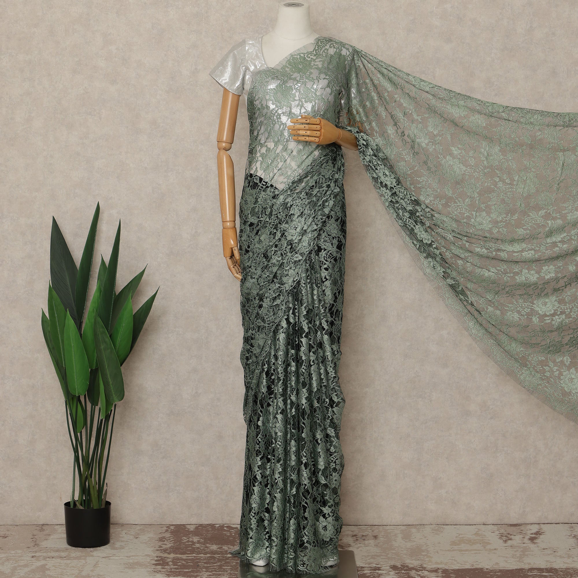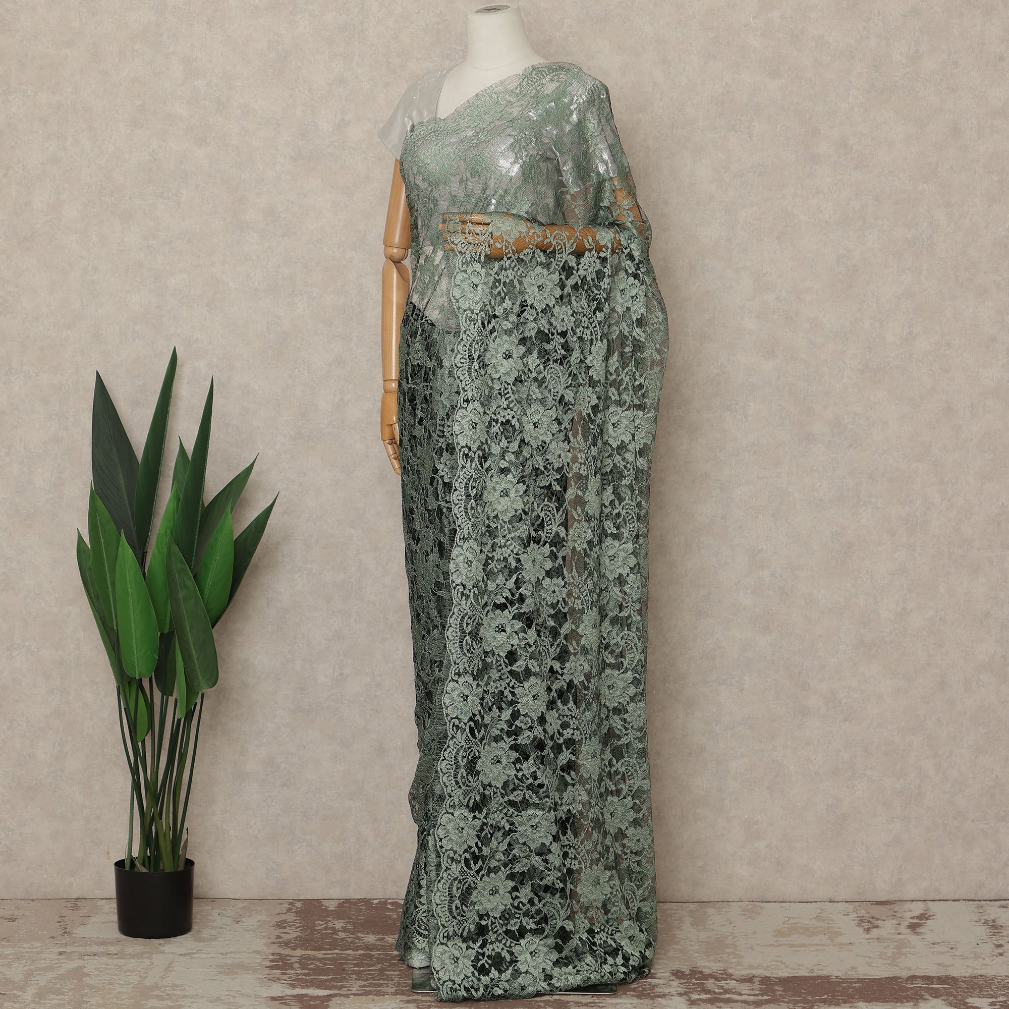 Sage Green Premium French Chantilly Saree Lace Fabric 110 Cms Width 5.5 Meters Piece Elegant Floral Net Lace From France For Designer Sarees And Couture Draping-D27682