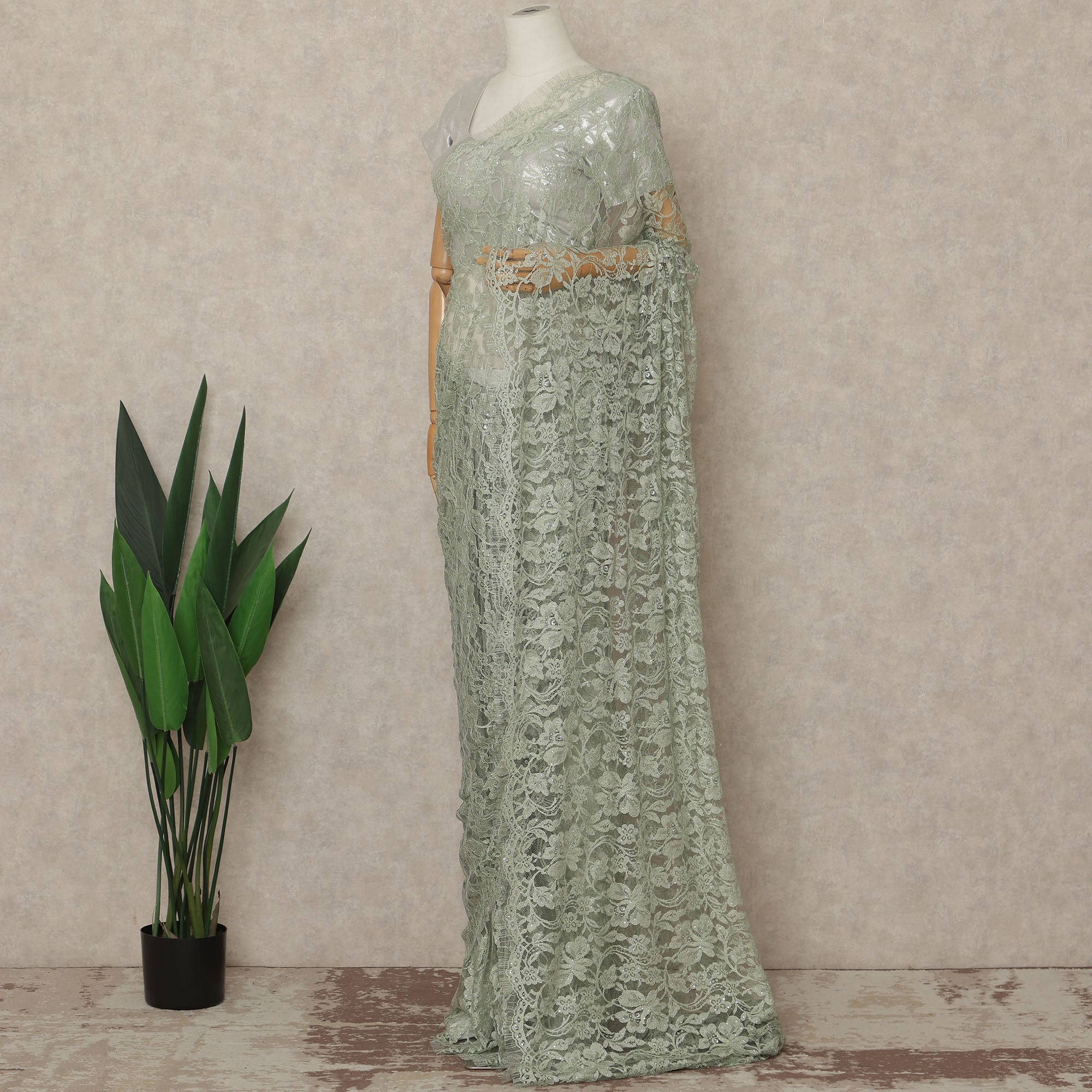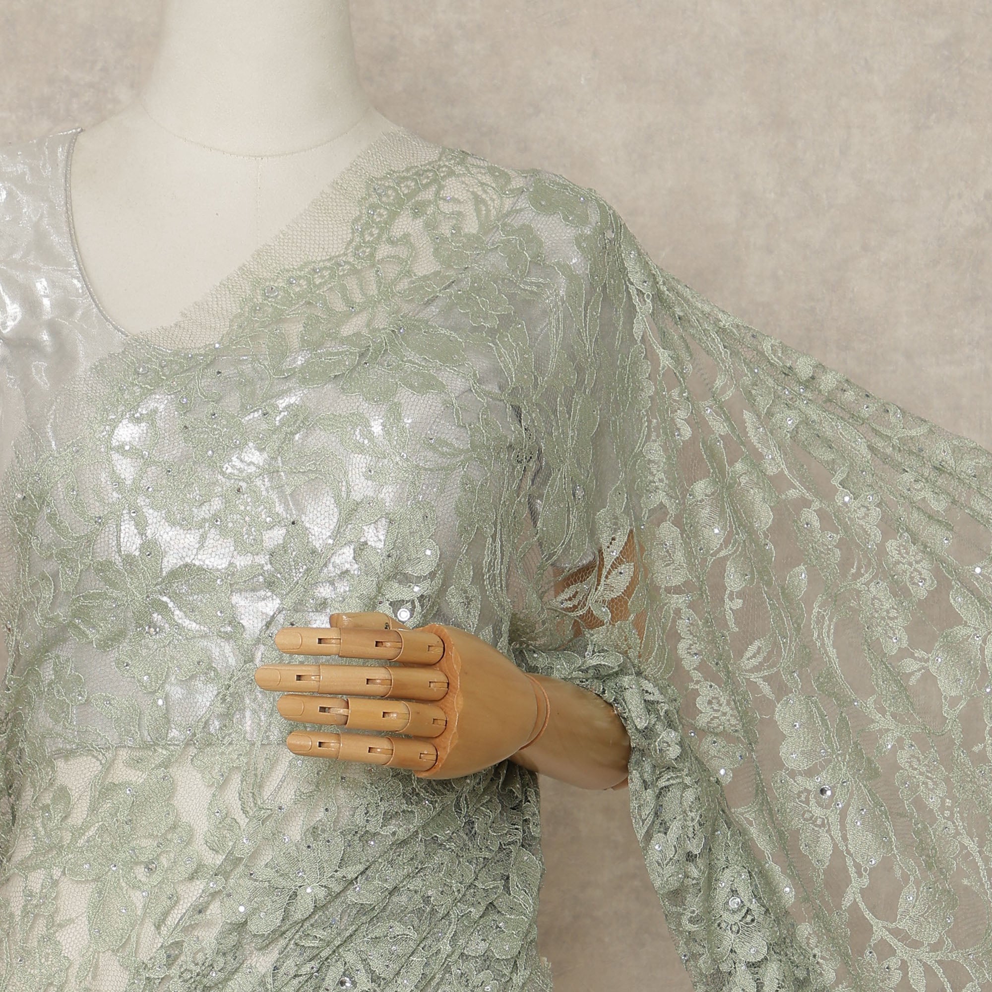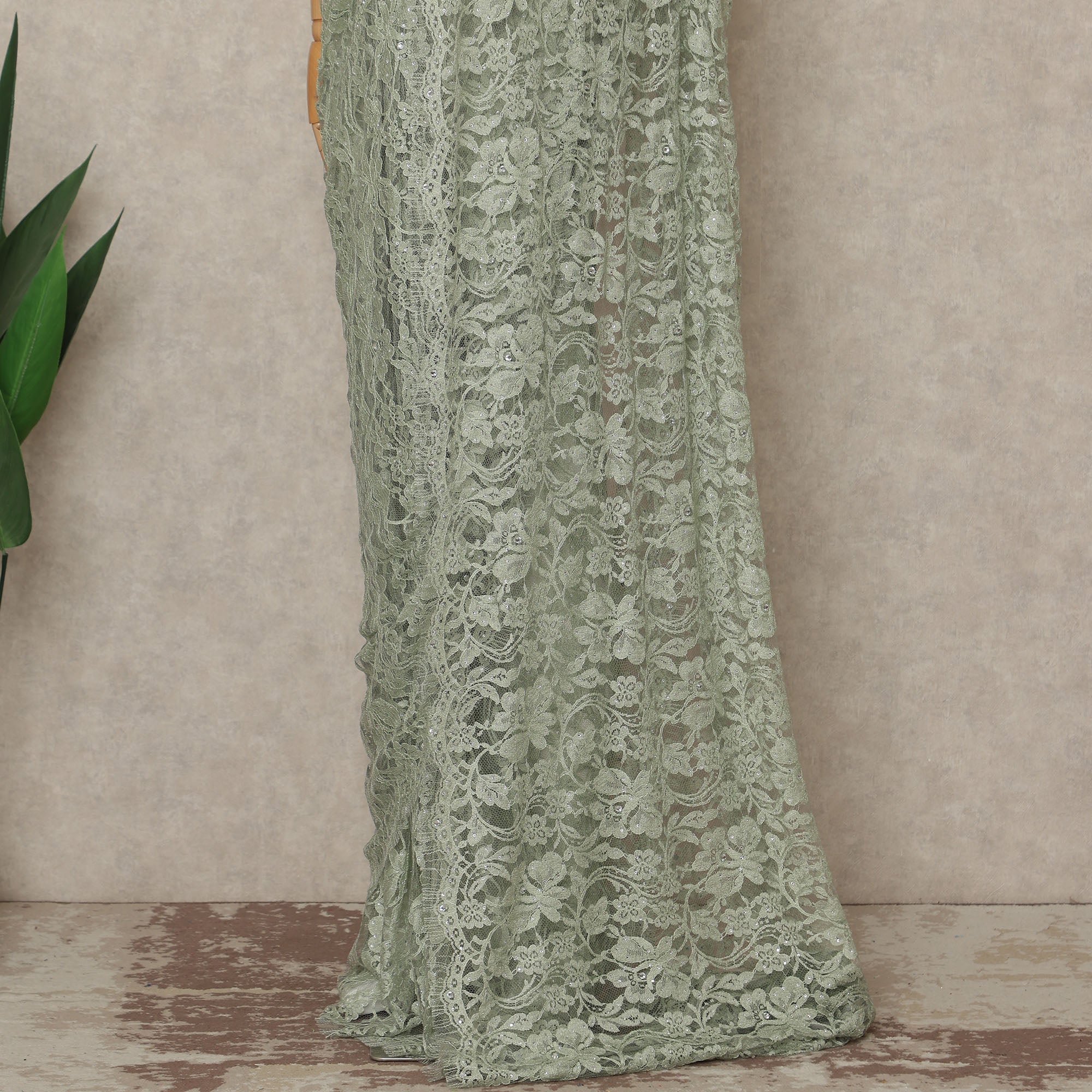 Sage Green Premium French Chantilly Saree Lace With Stone Work 110 Cms Width 5.5 Meters Piece Elegant Floral Net Lace From France For Designer Sarees And Couture Draping-D27693