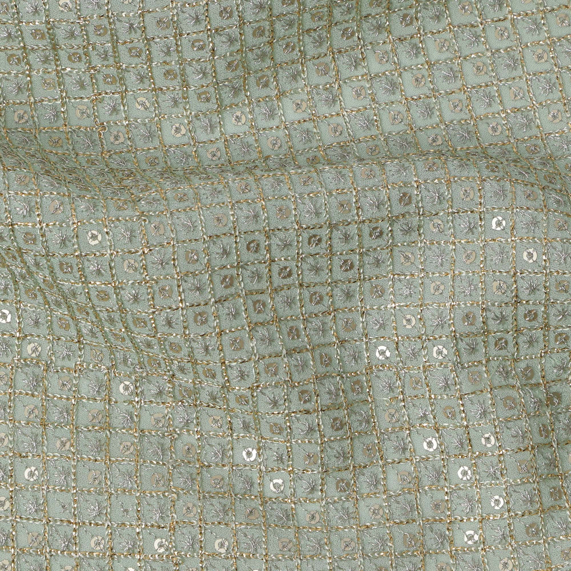 Sage green fabric highlighted with embroidered square floral motifs and mirror embellishments