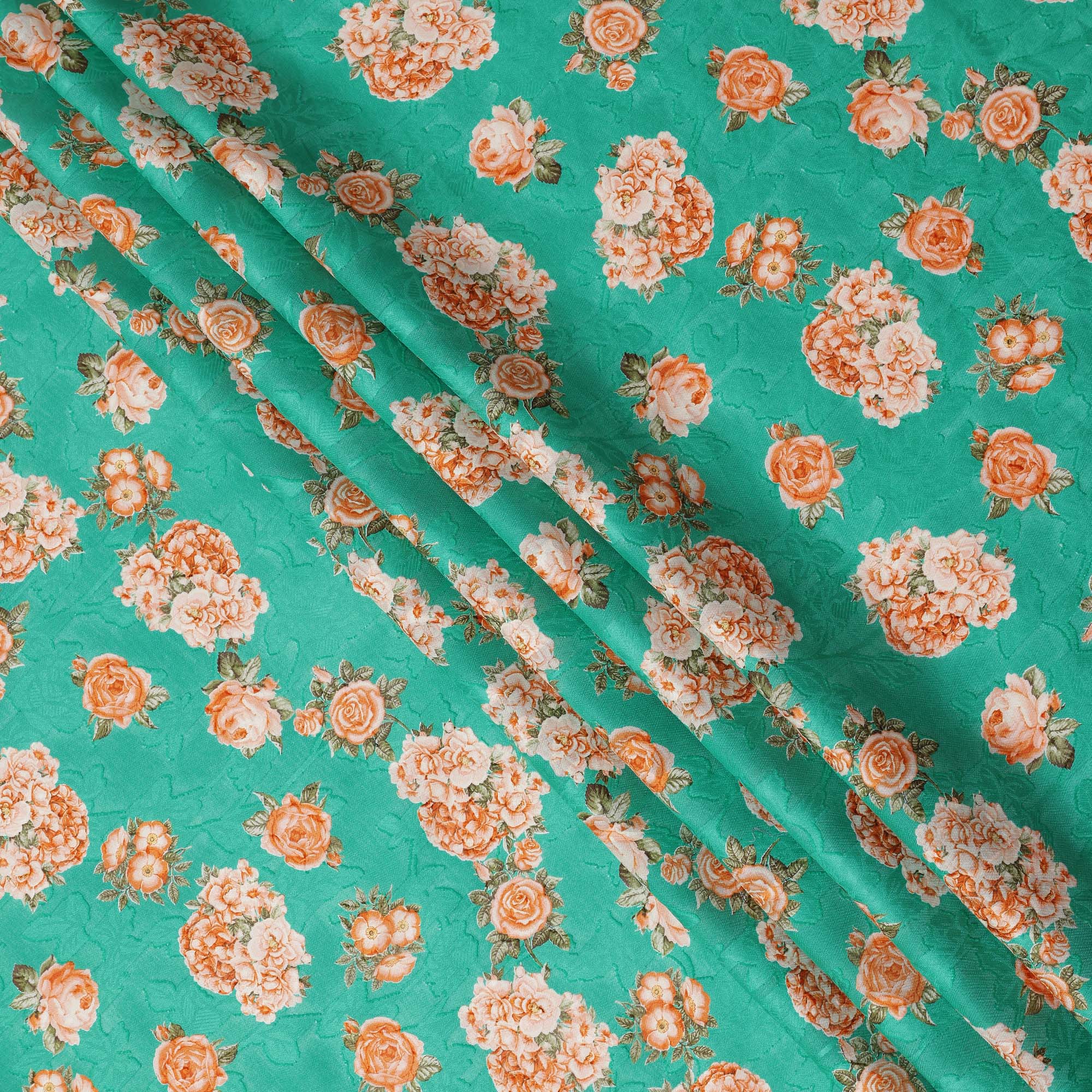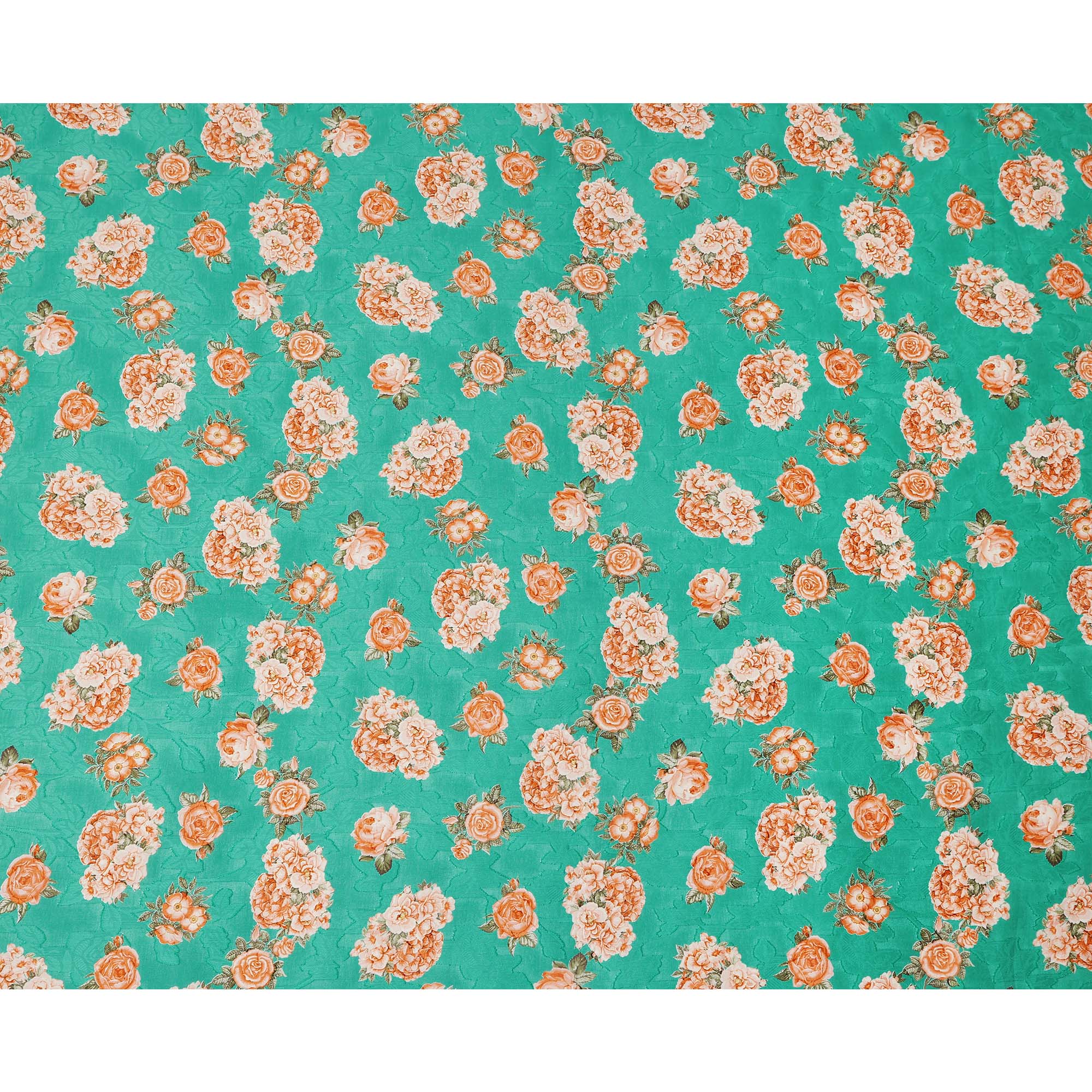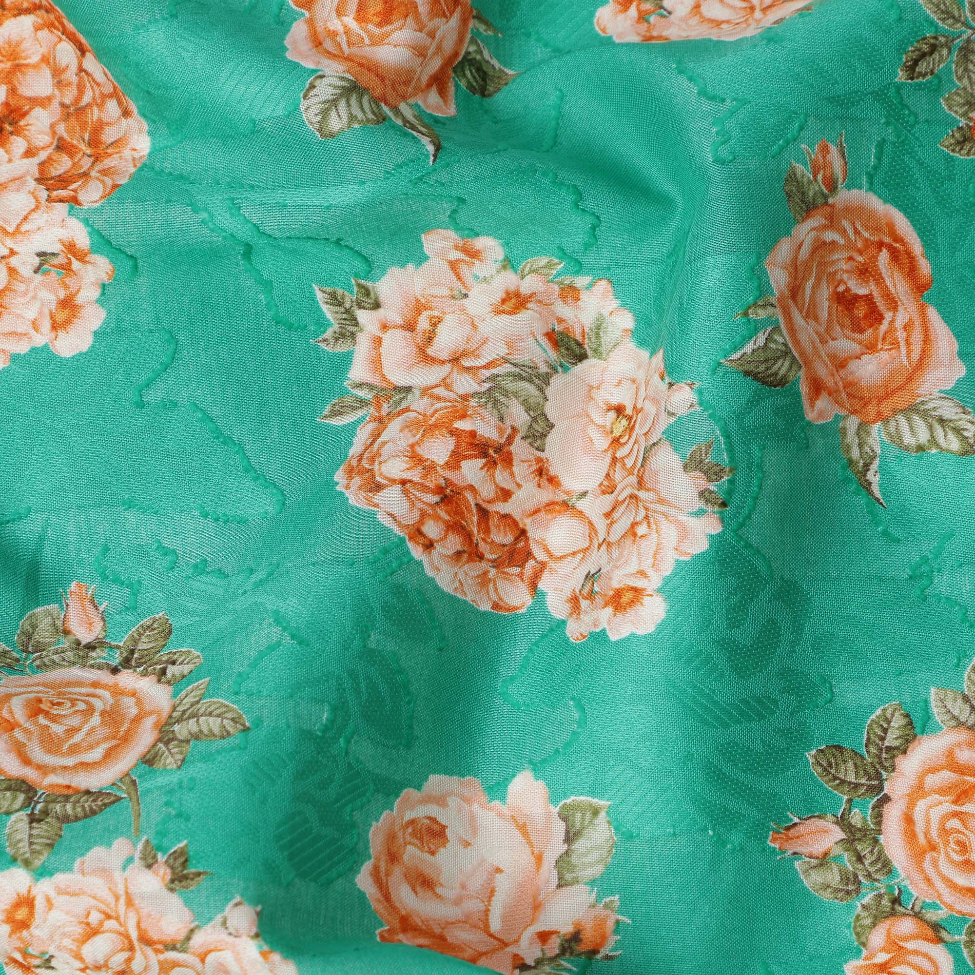 Sea green cotton lawn printed Fabric with peach rose bouquets and olive leaves, 110 Cms Width, India-D25287