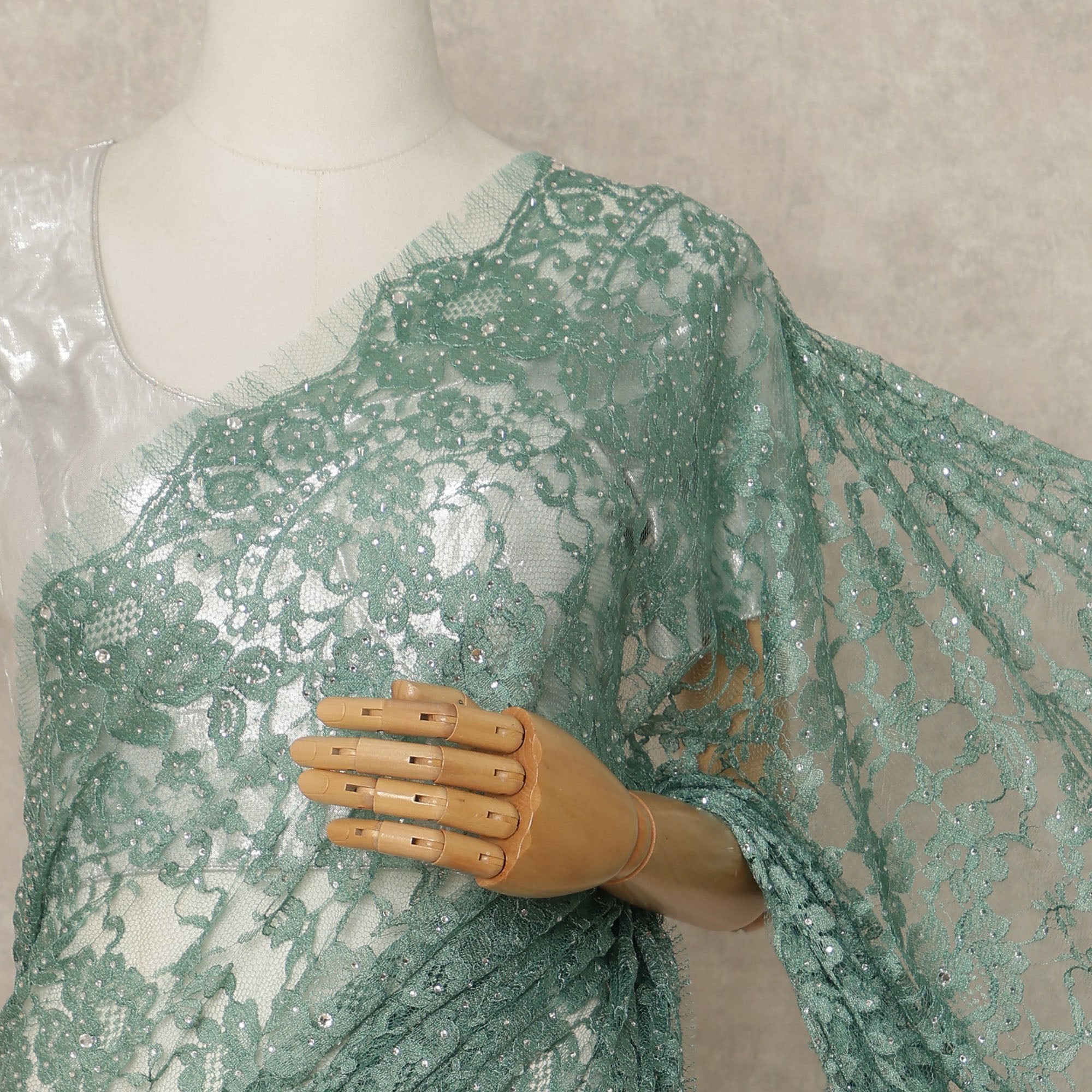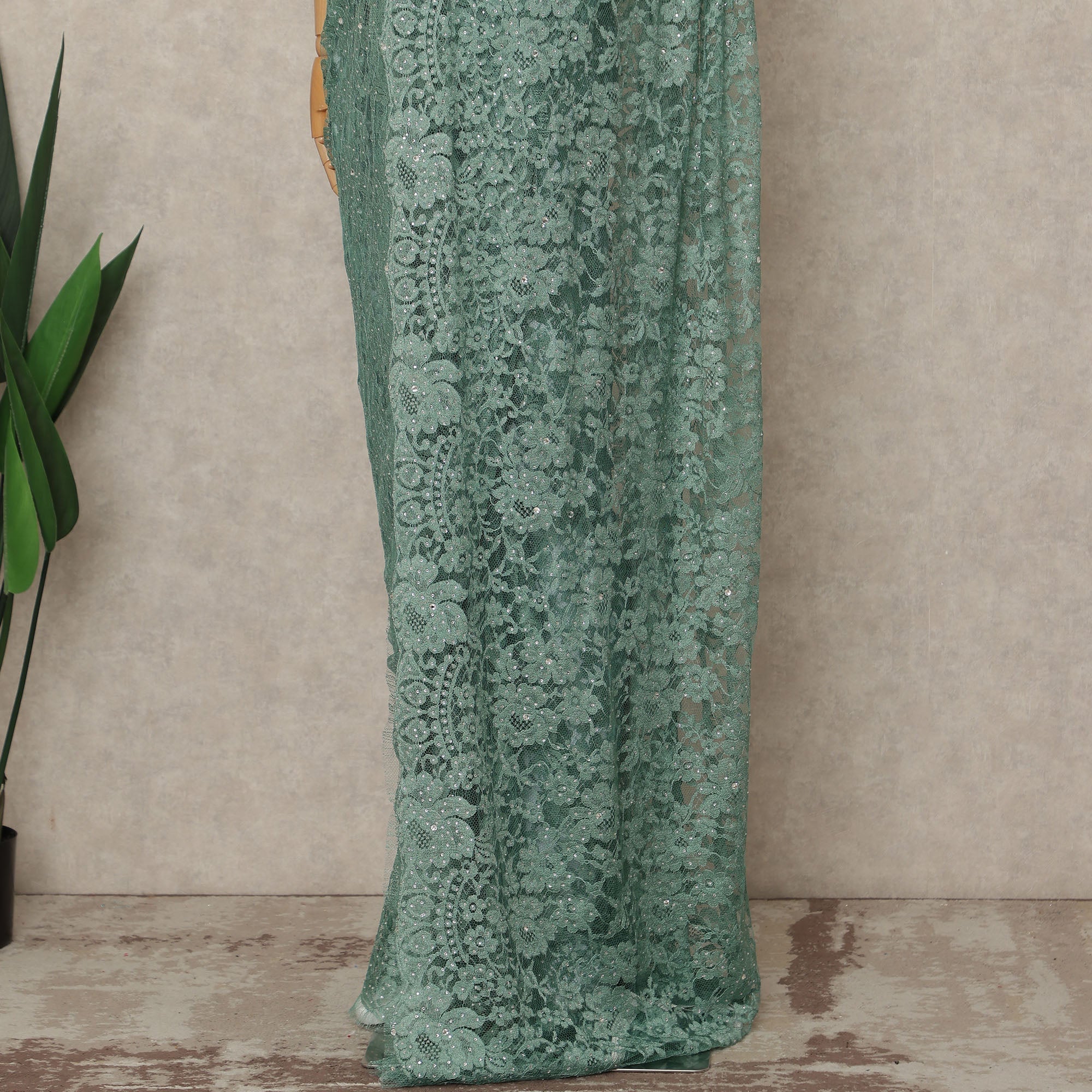 Sea Green Premium French 2 Tone Chantilly Saree Lace With Stone Work Fabric 5.5 Meters Length 110 Cms Width Imported From France Elegant Designer Lace Blouse Not Included-D27368