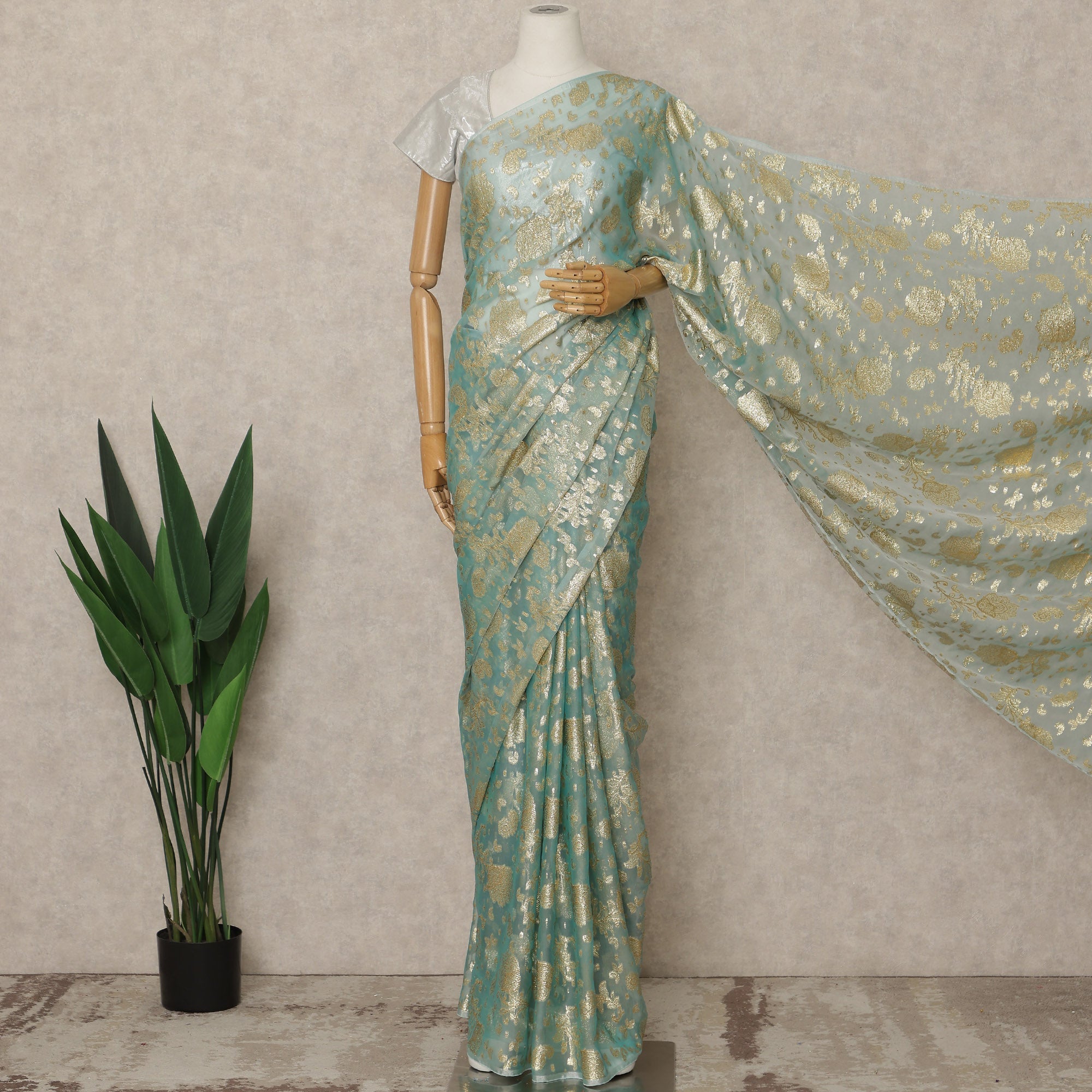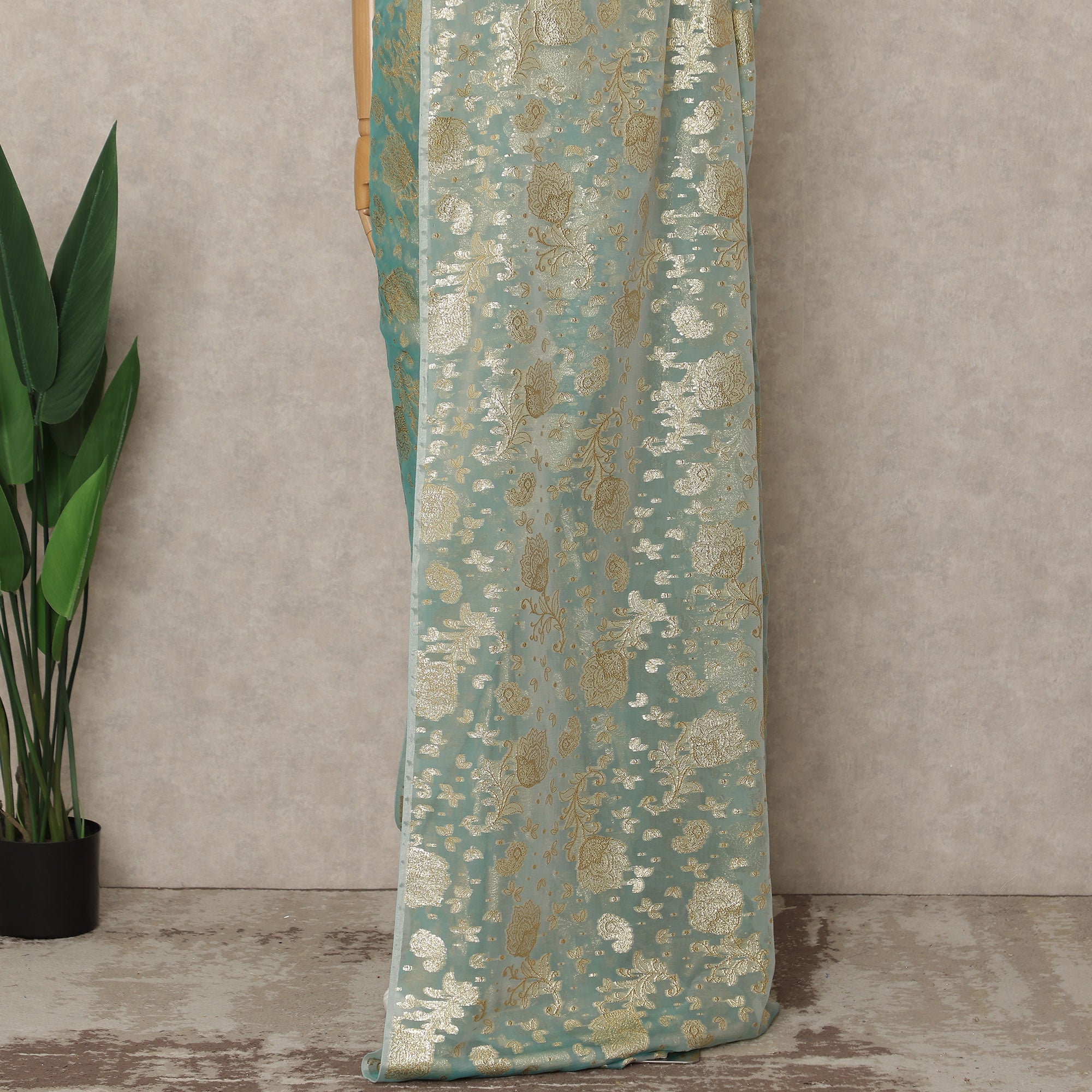 Sea Green Premium French Silk Chiffon Saree With Gold Woven Floral Motifs 5.5 Mtrs Length 110 Cms Width Lightweight Elegant Fabric From France Blouse Not Included-D27232