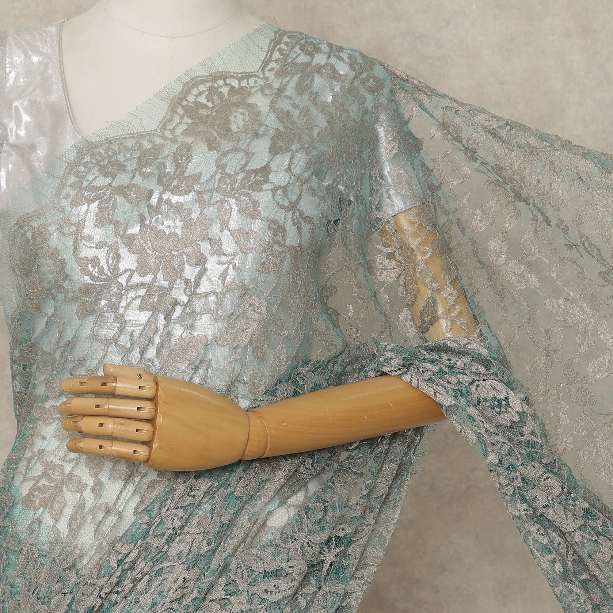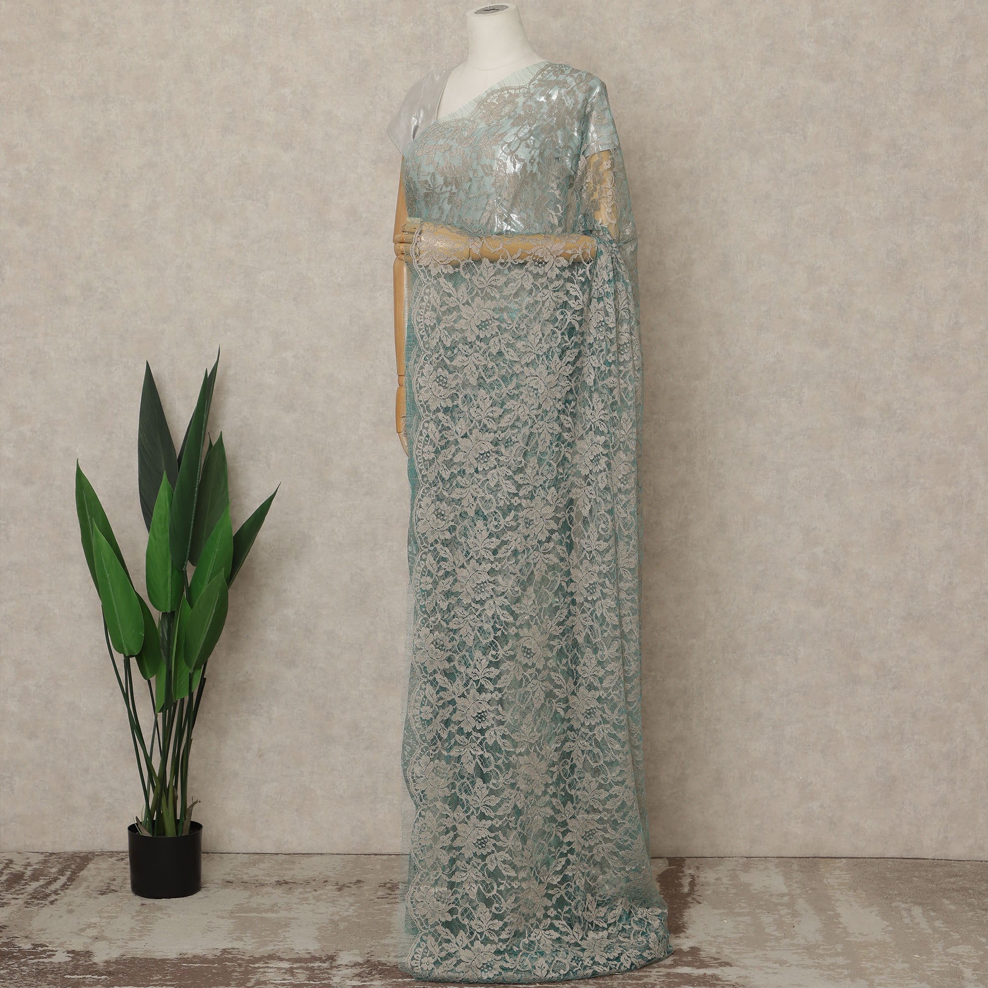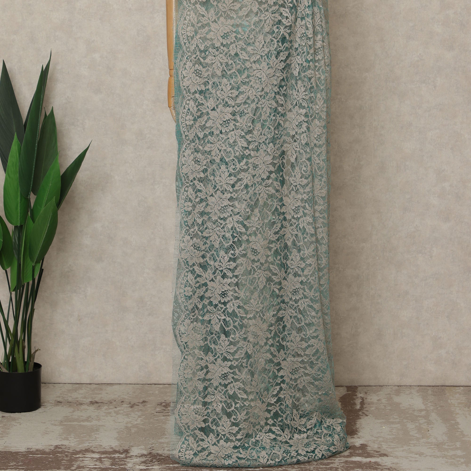 Elevate your wardrobe with this Seafoam Green Premium French 2-Tone Chantilly Lace Saree, exquisitely crafted in France to highlight the ethereal beauty of Chantilly lace enhanced with a subtle two-tone effect that adds depth, dimension, and a soft luminous sheen; the soothing seafoam green shade beautifully accentuates the delicate floral lace patterns, creating a serene yet luxurious appeal ideal for weddings, receptions, festive gatherings, intimate celebrations, and elegant evening occasions; woven using superior Regal Fabrics craftsmanship, the saree drapes gracefully with a feather-light fluidity, ensuring unmatched comfort and refined movement throughout the day or night; measuring approximately 5.5 meters in length and 110 cms in width, it provides versatile draping options for traditional, contemporary, or fusion styling, and with the blouse not included, you have complete freedom to pair it with matching or contrasting fabrics; perfect for shoppers who love to buy exclusive designer sarees online, this French 2-tone Chantilly creation embodies timeless sophistication, European artistry, and modern elegance; to preserve its intricate lace structure and radiant finish, dry clean only and store with care.
