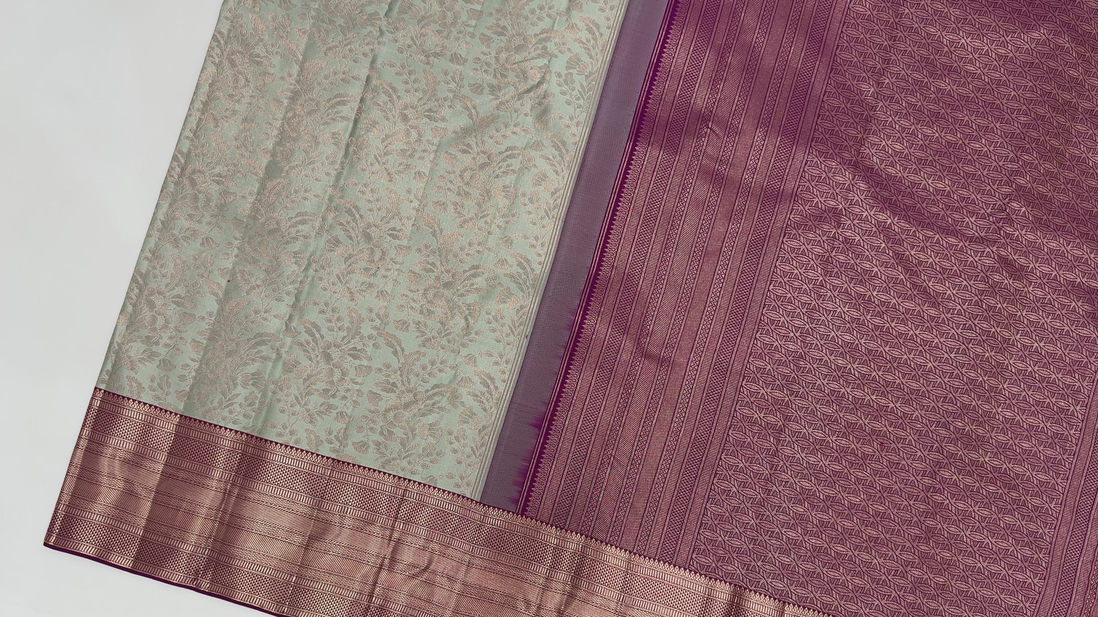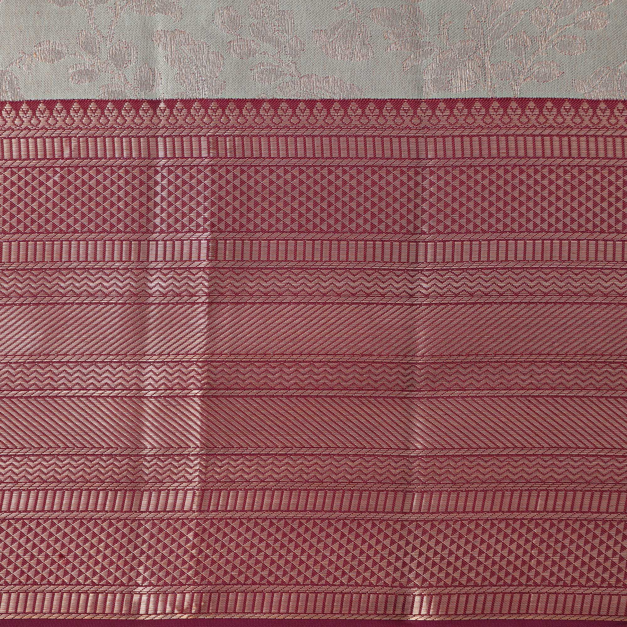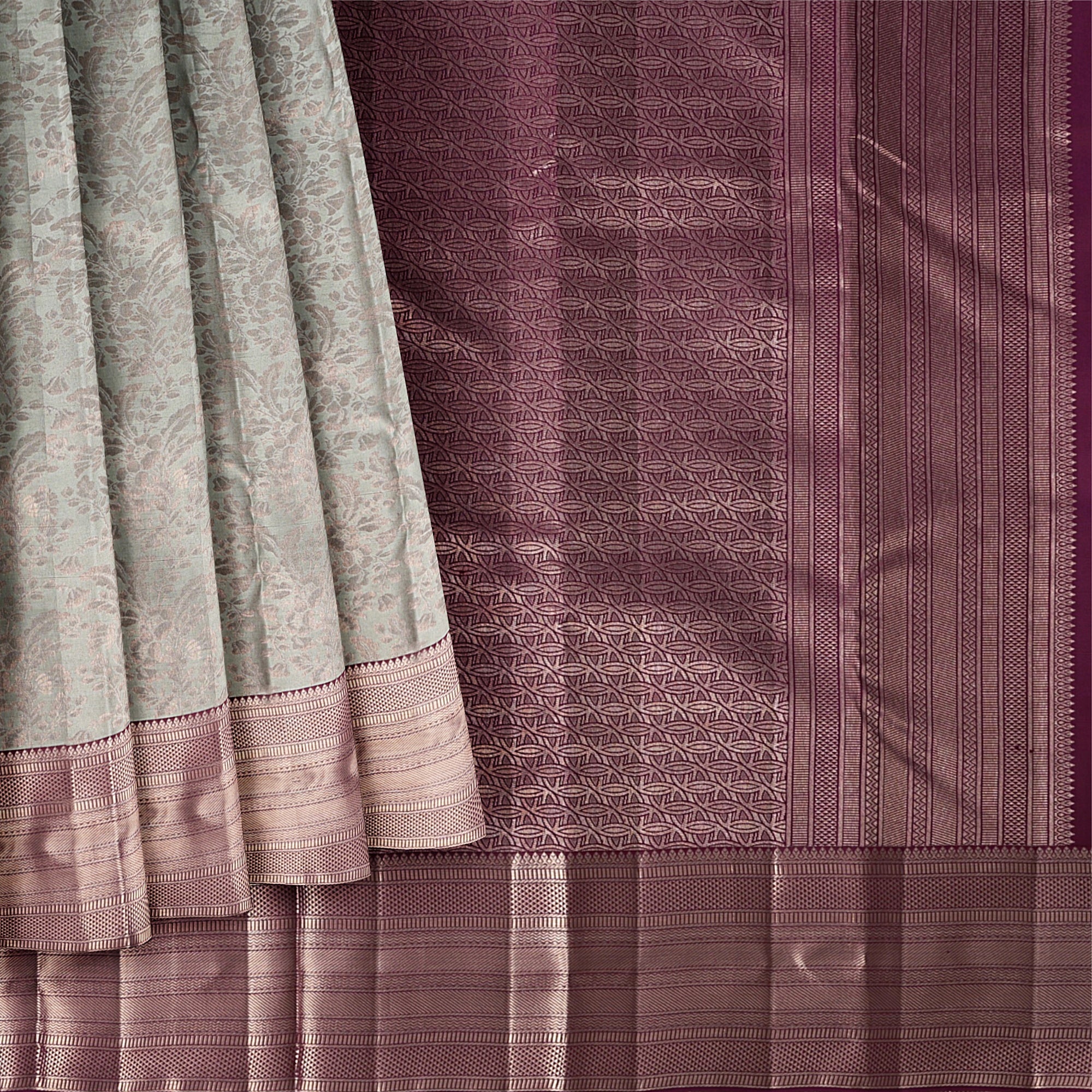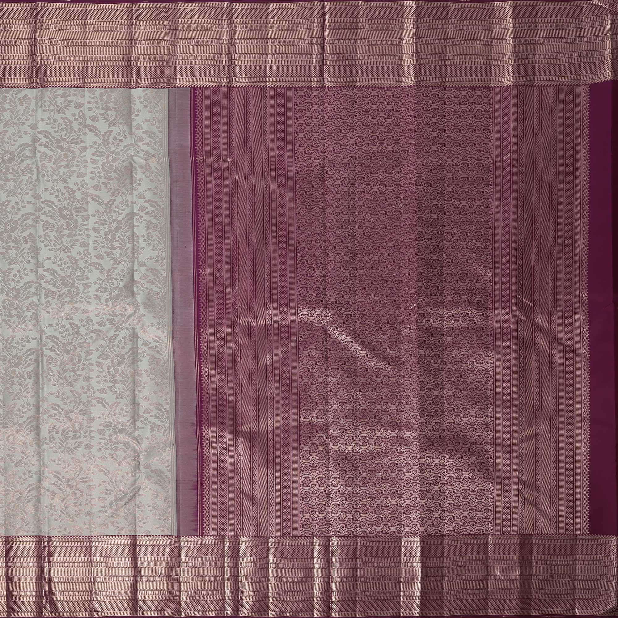 Silver and Mauve Pure Silk Kanjeevaram Saree with Handwoven Floral Vine Design and Rich Contrast Border, 5.5 Meters with Blouse Piece, Originating from India-D22713