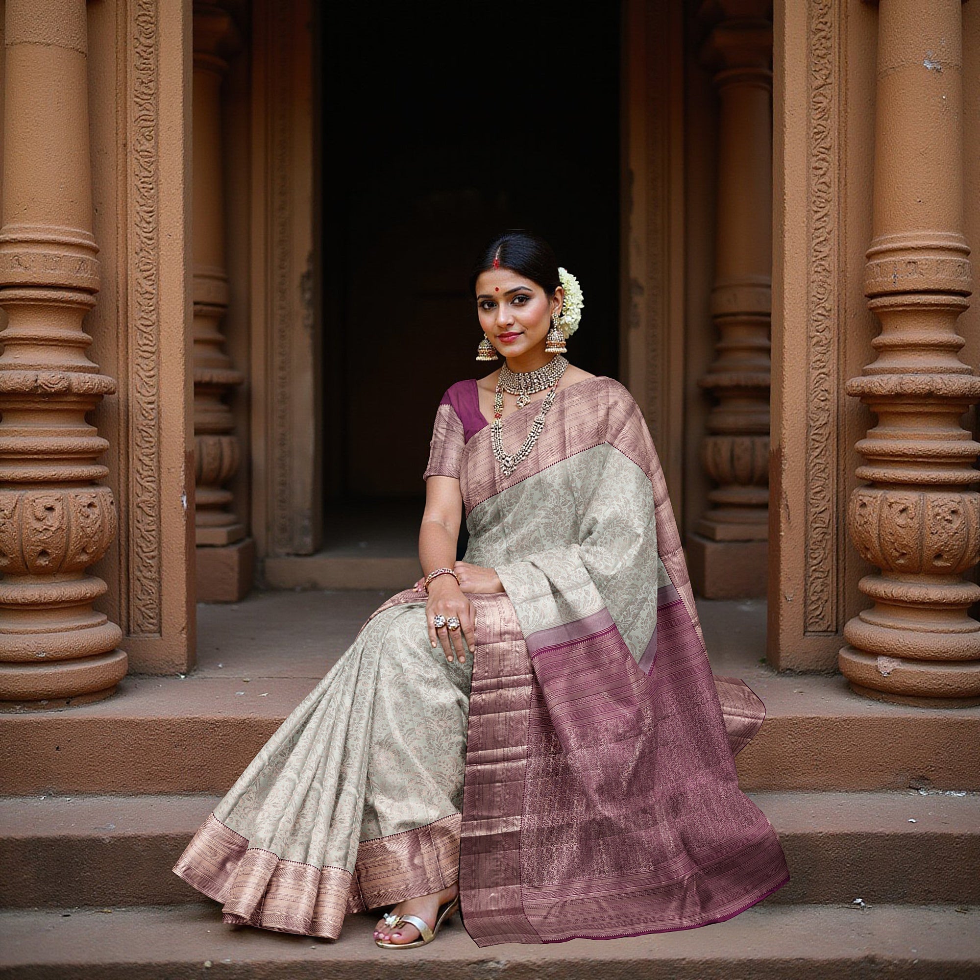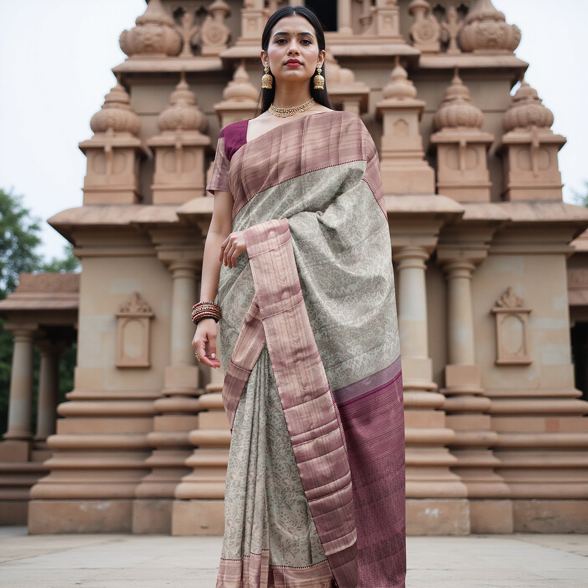 This Silver and Mauve Pure Silk Kanjeevaram Saree is an elegant ode to heritage, crafted with the finesse of age-old South Indian weaving traditions. Woven from premium Regal Fabrics silk, the silver body of the saree is adorned with intricate handwoven floral vine motifs that appear like delicate etchings on temple walls—subtle yet deeply expressive. The contrasting mauve border, enriched with fine zari detailing, offers a regal finish that frames the saree beautifully. Each piece is a result of 48 hours of masterful handloom work by experienced artisans who pass their skill through generations. The combination of cool silver and soft mauve exudes sophistication, making this saree a graceful choice for weddings, traditional functions, and formal occasions. Shop online to bring home this handwoven tale of tradition and elegance. Dry clean only to maintain its luster, detailing, and fine craftsmanship.