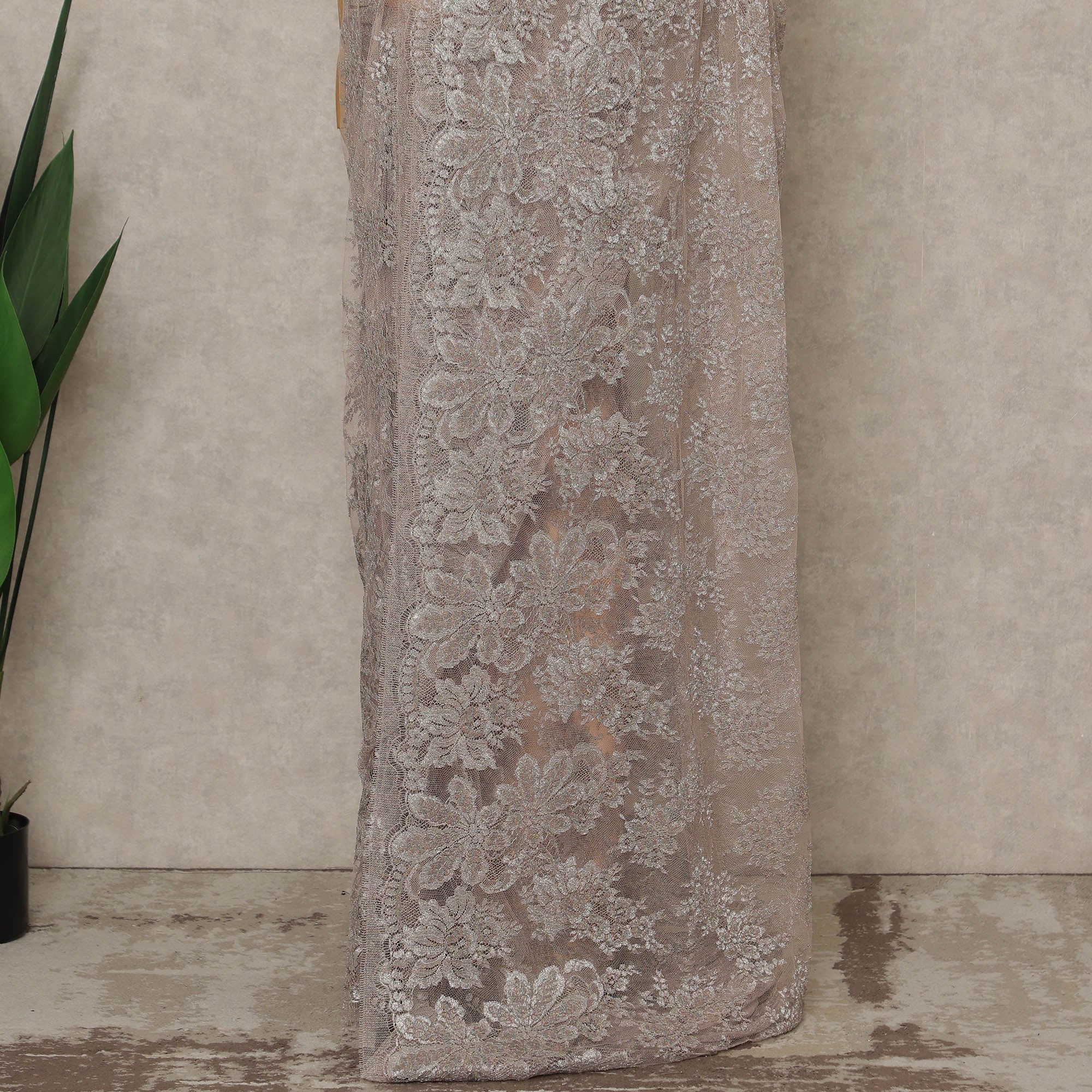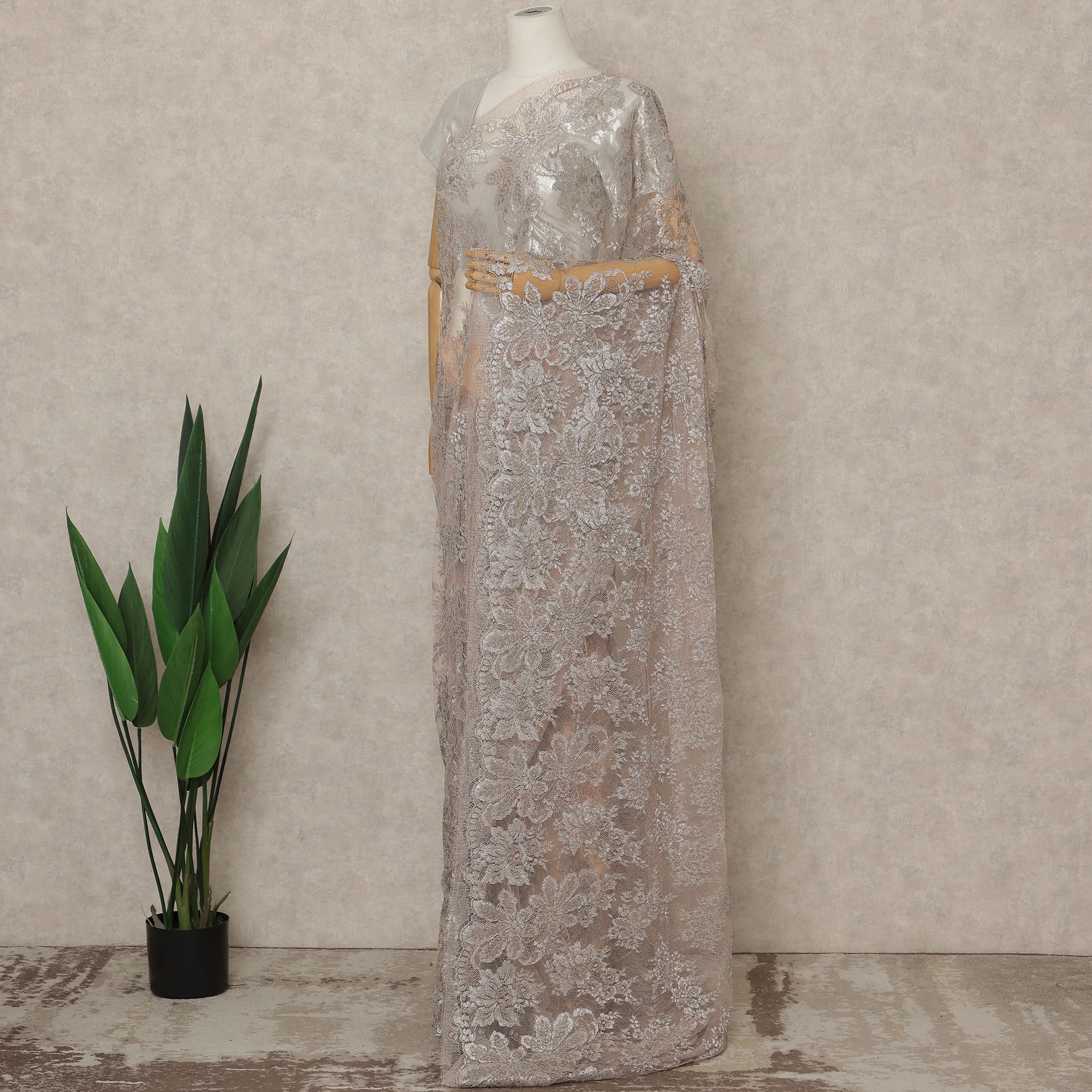 Silver Beige Premium French Metallic Chantilly Saree Lace, 5.5 Mtrs Length, 110 Cms Width, Crafted in France -Blouse Not Included-D26722