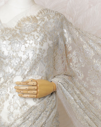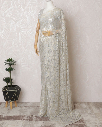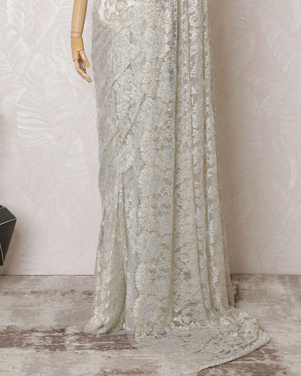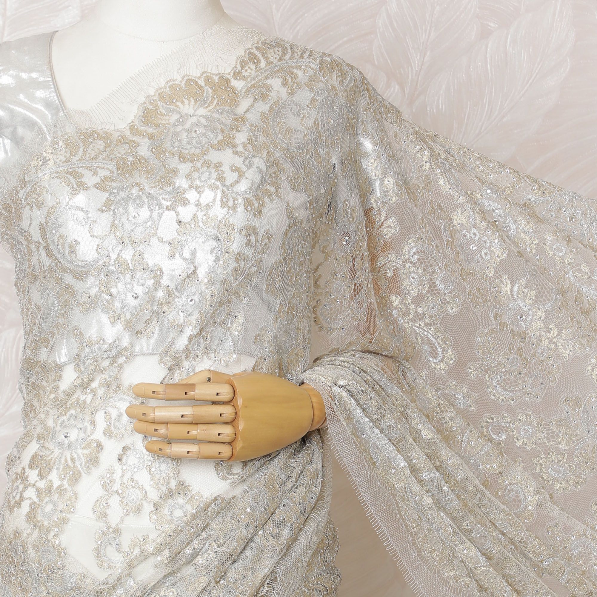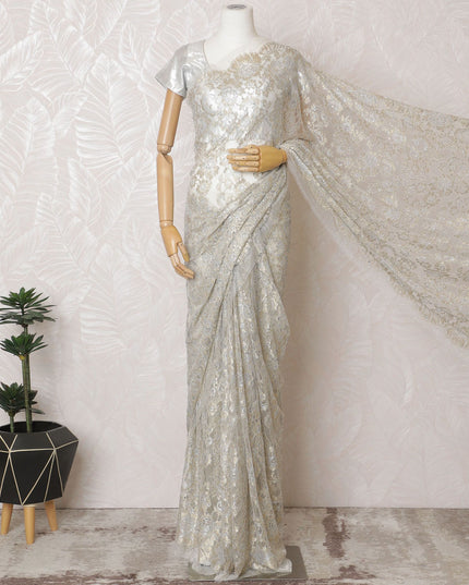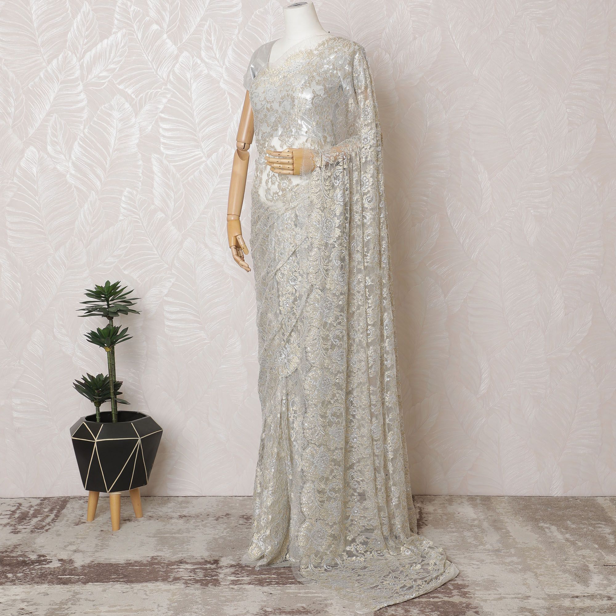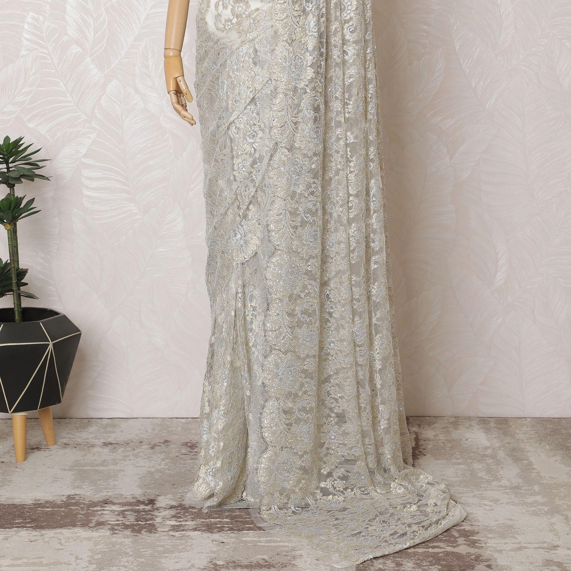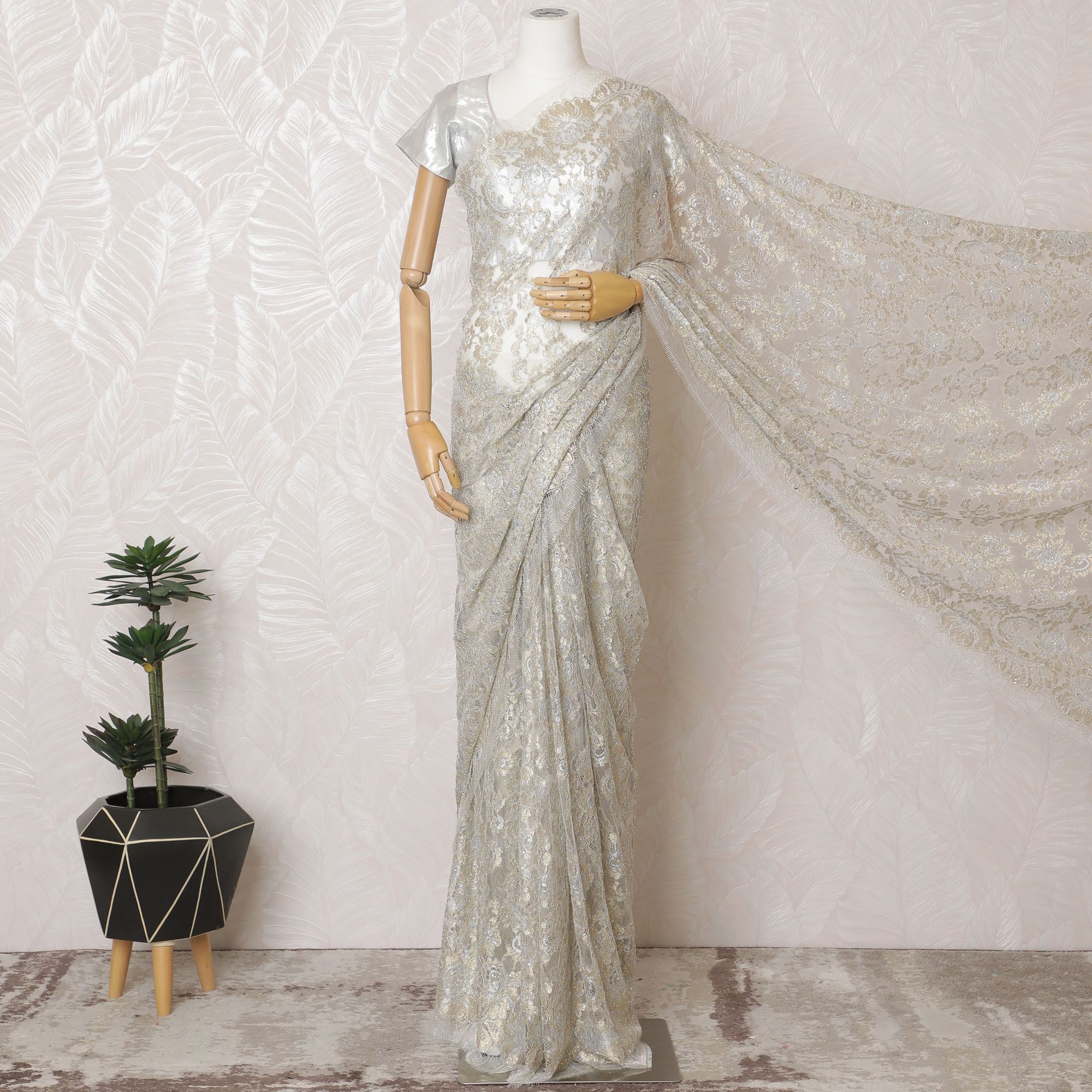 Behold the radiance of our French Chantilly metallic lace saree, where opulence meets classic design in a dance of shimmering beauty. Imported from France, this saree is a celebration of sophistication, featuring a lavish spread of metallic lace over a 5.5-meter expanse. Each twist and fold glimmers with a constellation of hand-placed stones, adding an exquisite dimension to the intricate lace details. The saree's sheer elegance makes it an impeccable choice for gala events and exclusive receptions. While the saree is a statement in itself, please be advised that it does not come with a blouse, offering you the creative space to pair it with a piece as unique as your style.