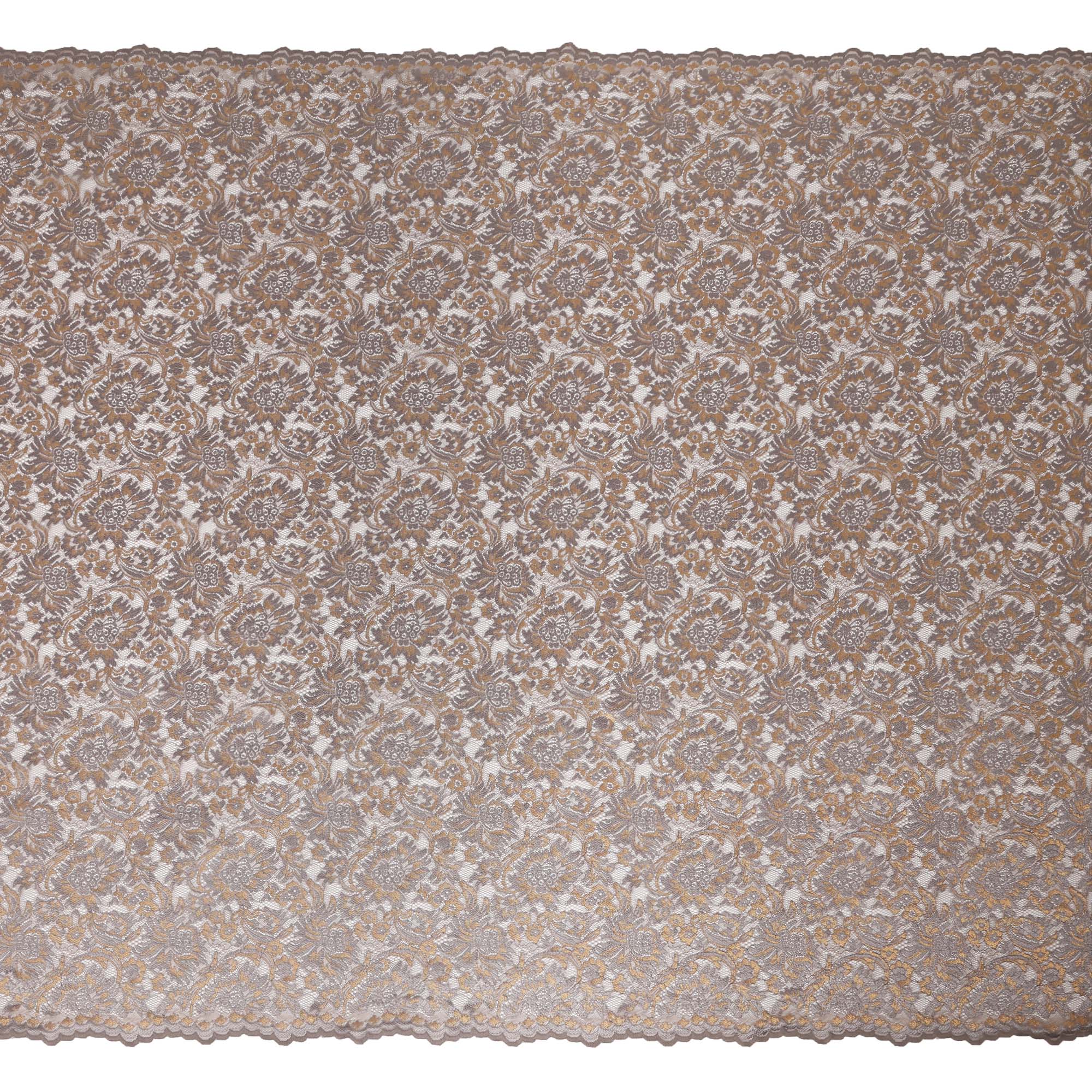 This silver grey synthetic metallic lace fabric features an intricate floral embroidery pattern highlighted with subtle metallic accents that create a refined shimmer and luxurious depth. The elegant grey base offers a soft neutral tone, making the fabric versatile and timeless while the metallic detailing enhances its premium appeal. Crafted on a delicate lace net, it provides a graceful drape with lightweight comfort, allowing ease of movement and a flattering finish. Ideal for designer gowns, cocktail dresses, blouses, saree overlays, lehenga panels, jackets, and occasion wear, this fabric blends durability with sophistication. Its fine texture ensures smooth stitching and structured results, making it a reliable choice for festive, evening, and high fashion creations that demand elegance and visual impact.