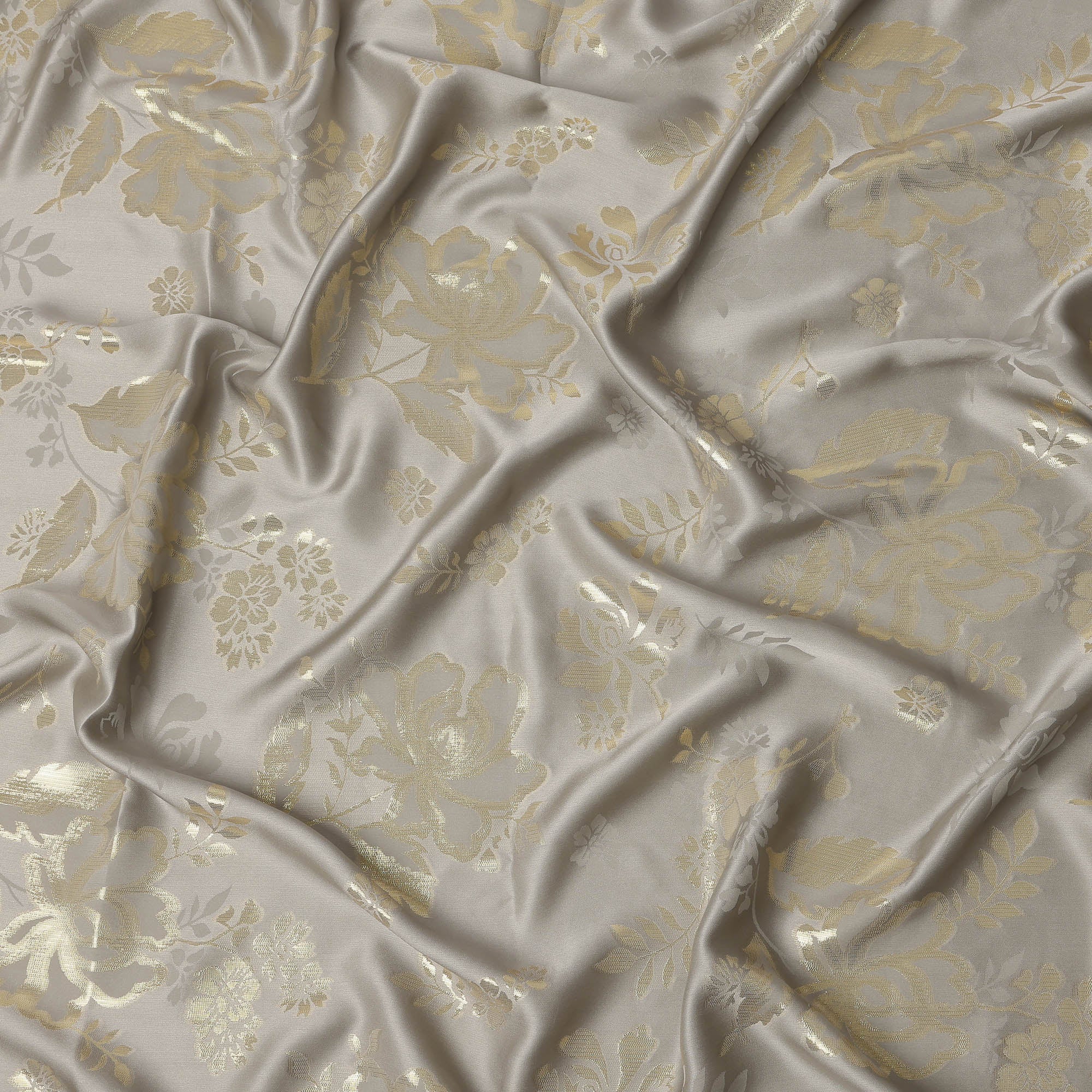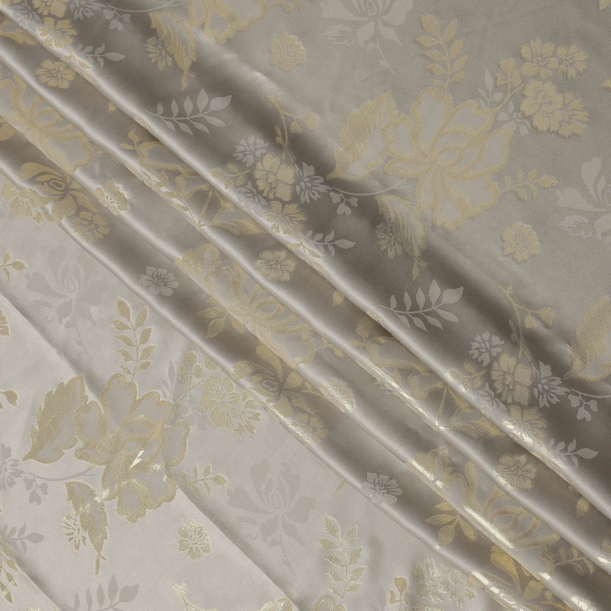 Premium silver grey silk satin fabric with delicate metallic floral jacquard weaving.