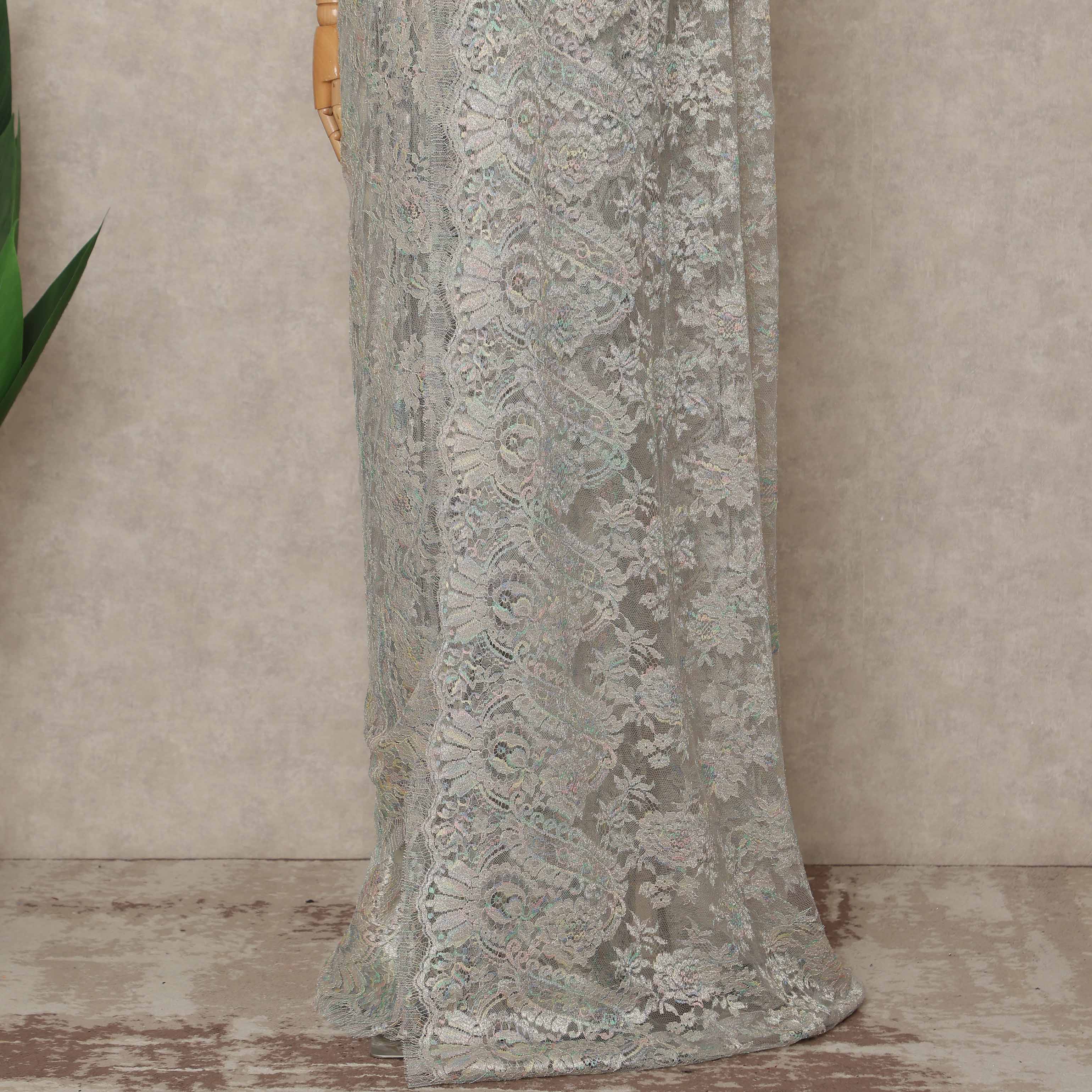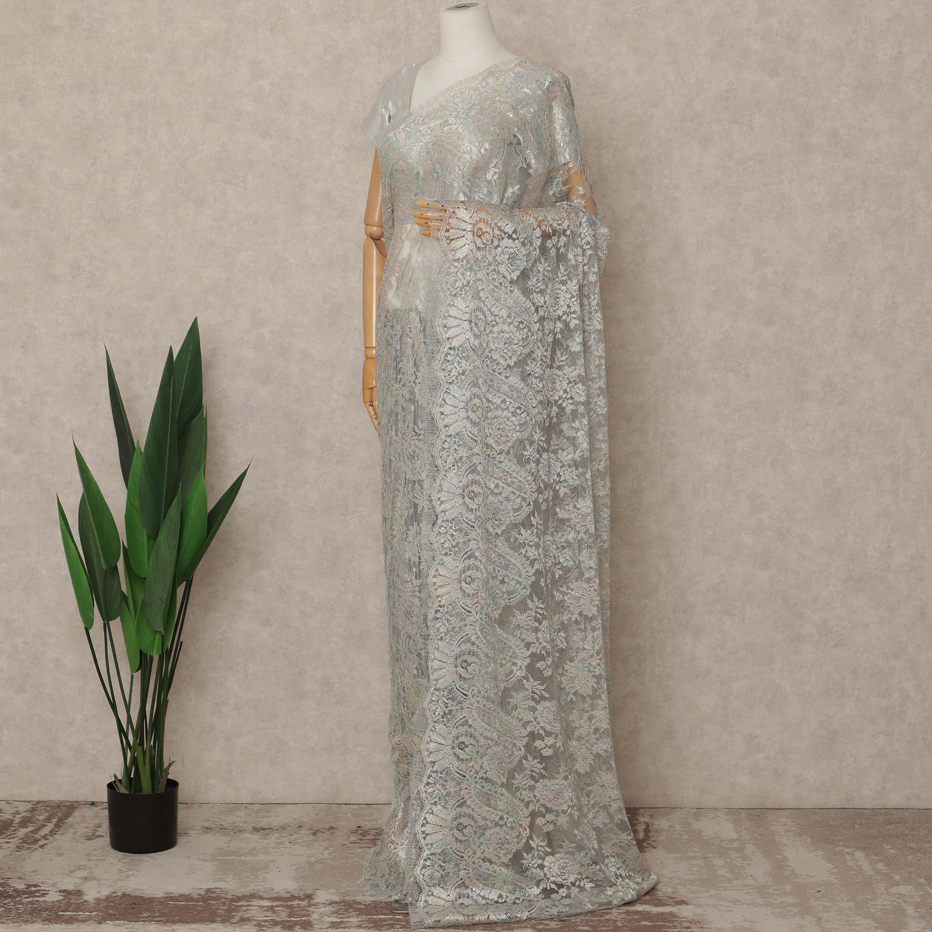 Silver Iridescent Premium French Metallic Chantilly Saree Lace 5.5 Mtrs Length 110 Cms Width Designer Net Fabric Made In France, Blouse Not Included-D28125