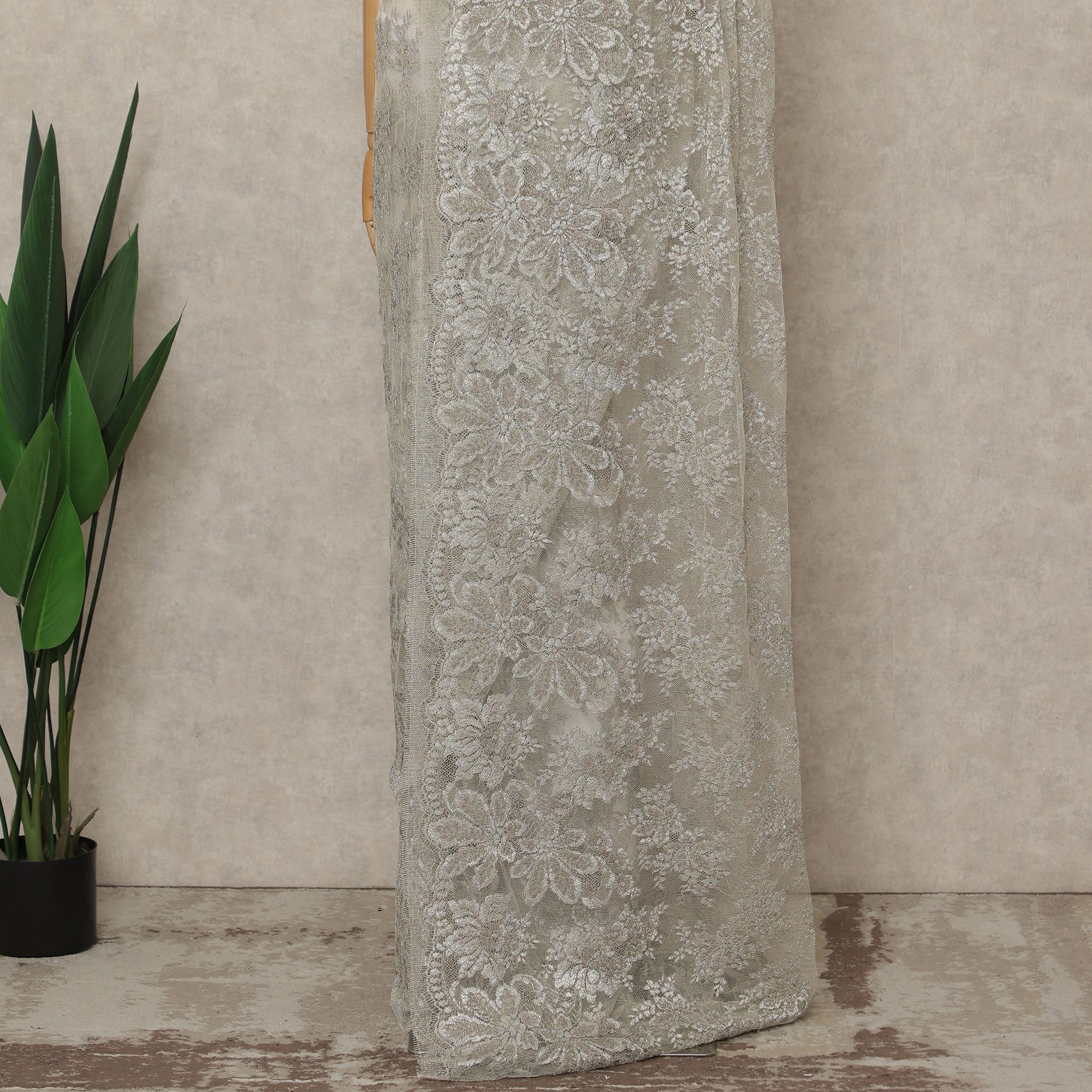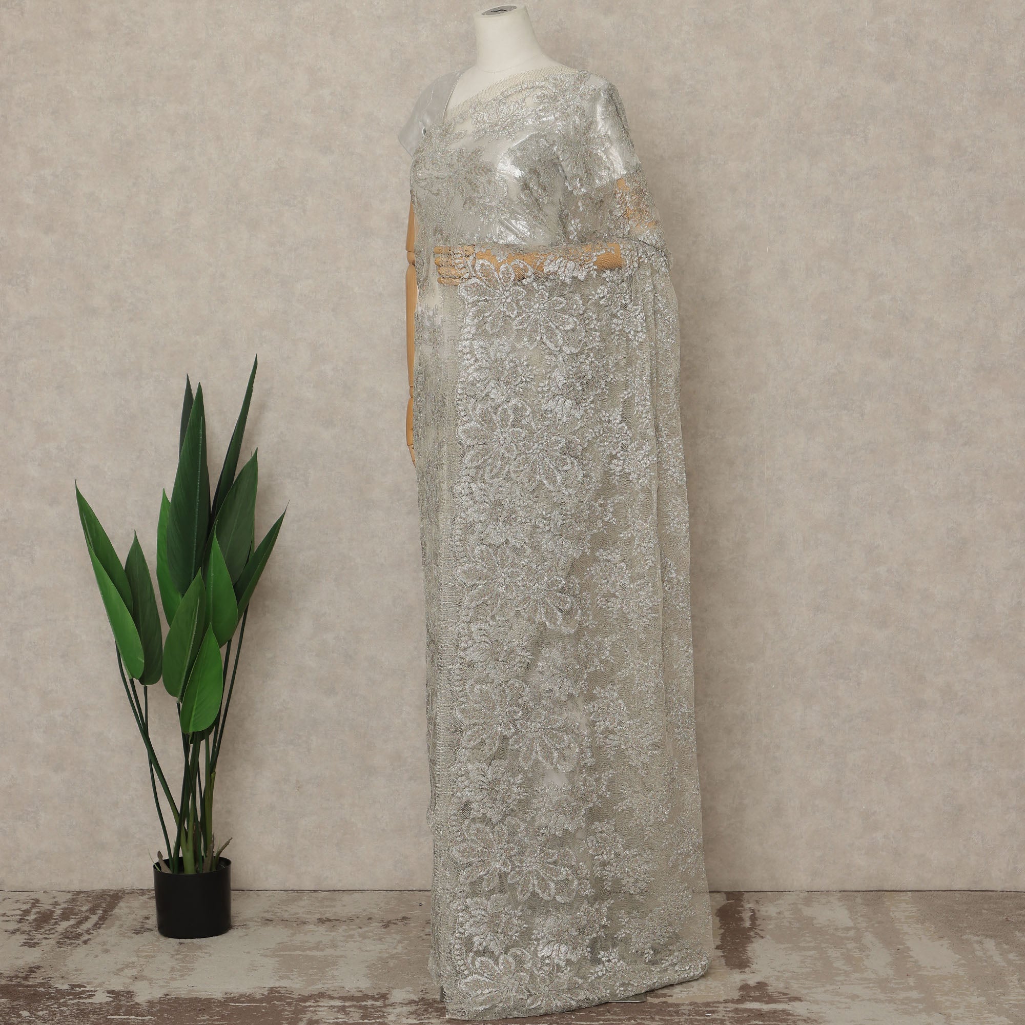 Silver Premium French Metallic Chantilly Saree Lace, 5.5 Mtrs Length, 110 Cms Width, Crafted in France -Blouse Not Included-D26723