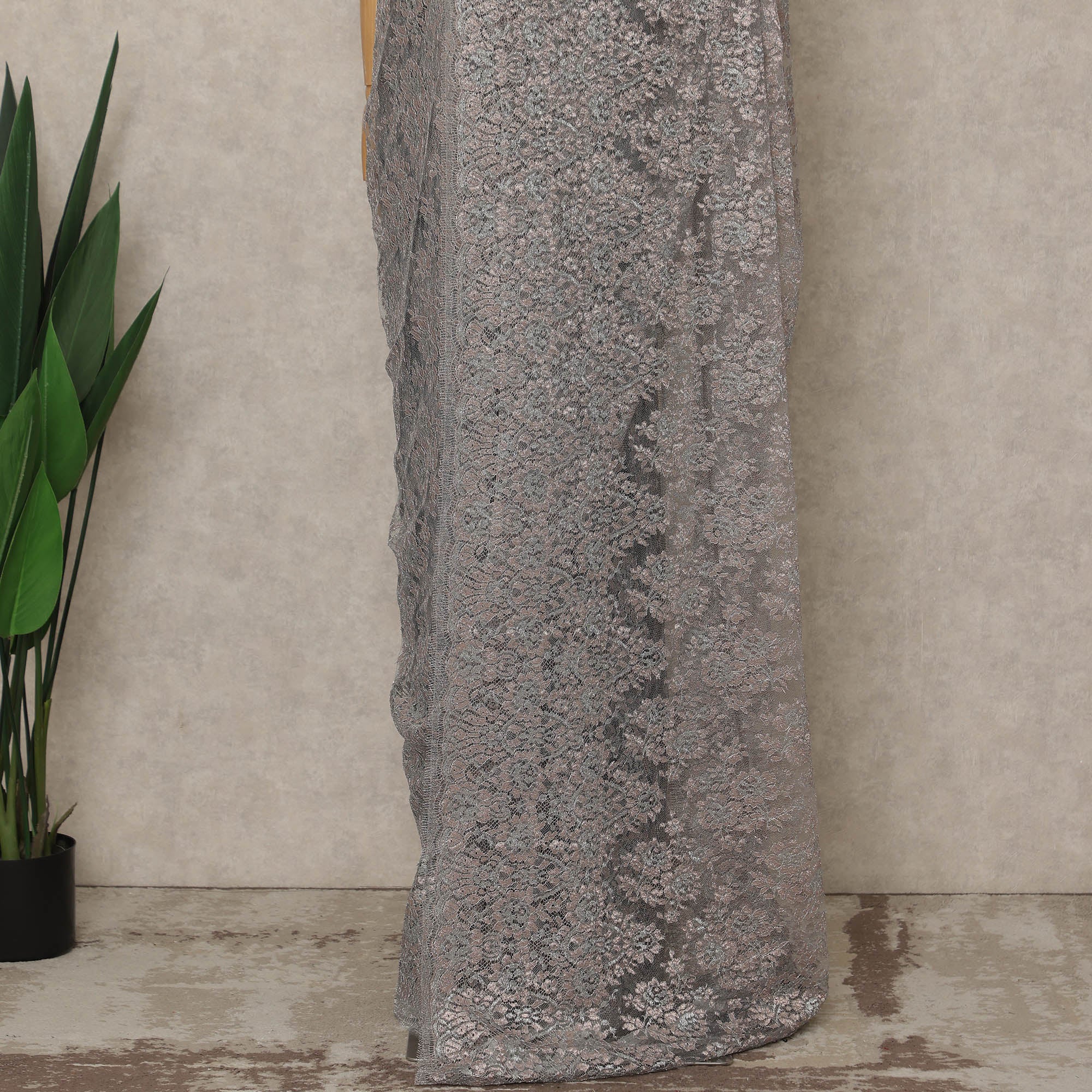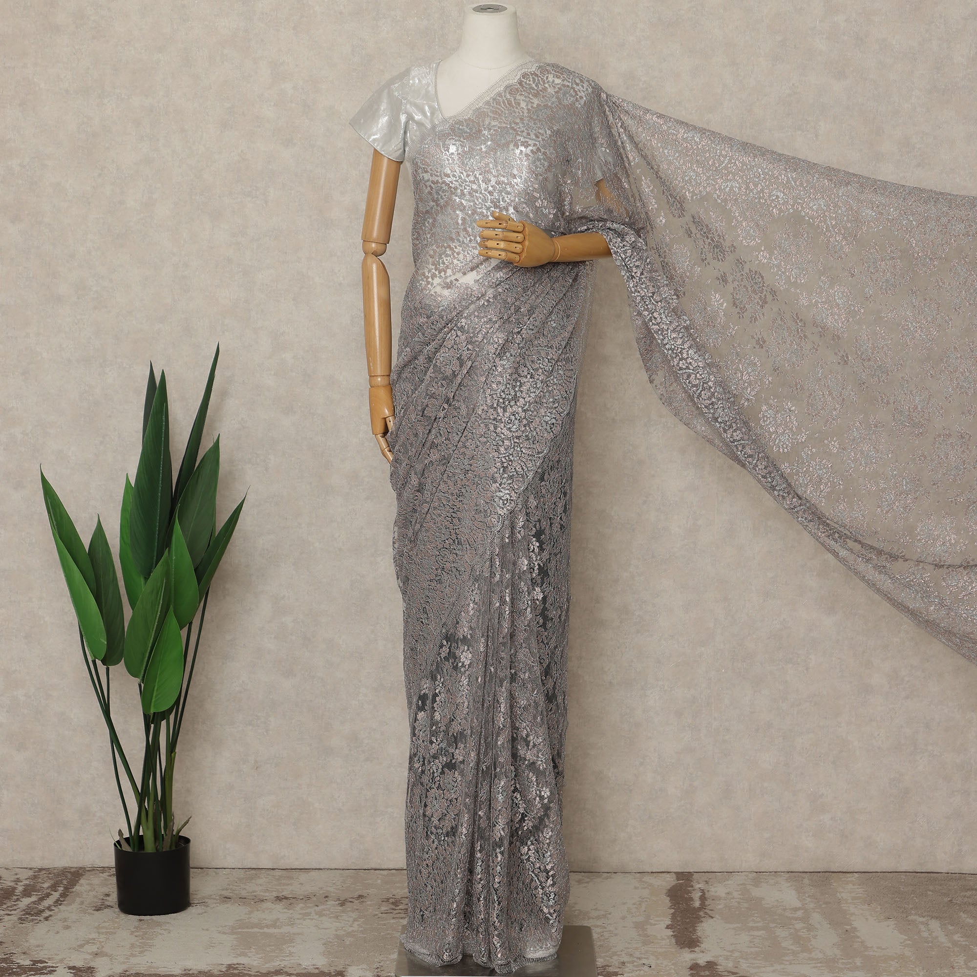 Silver Premium French Metallic Chantilly Saree Lace, 5.5 Mtrs Length, 110 Cms Width, Crafted in France -Blouse Not Included-D26728