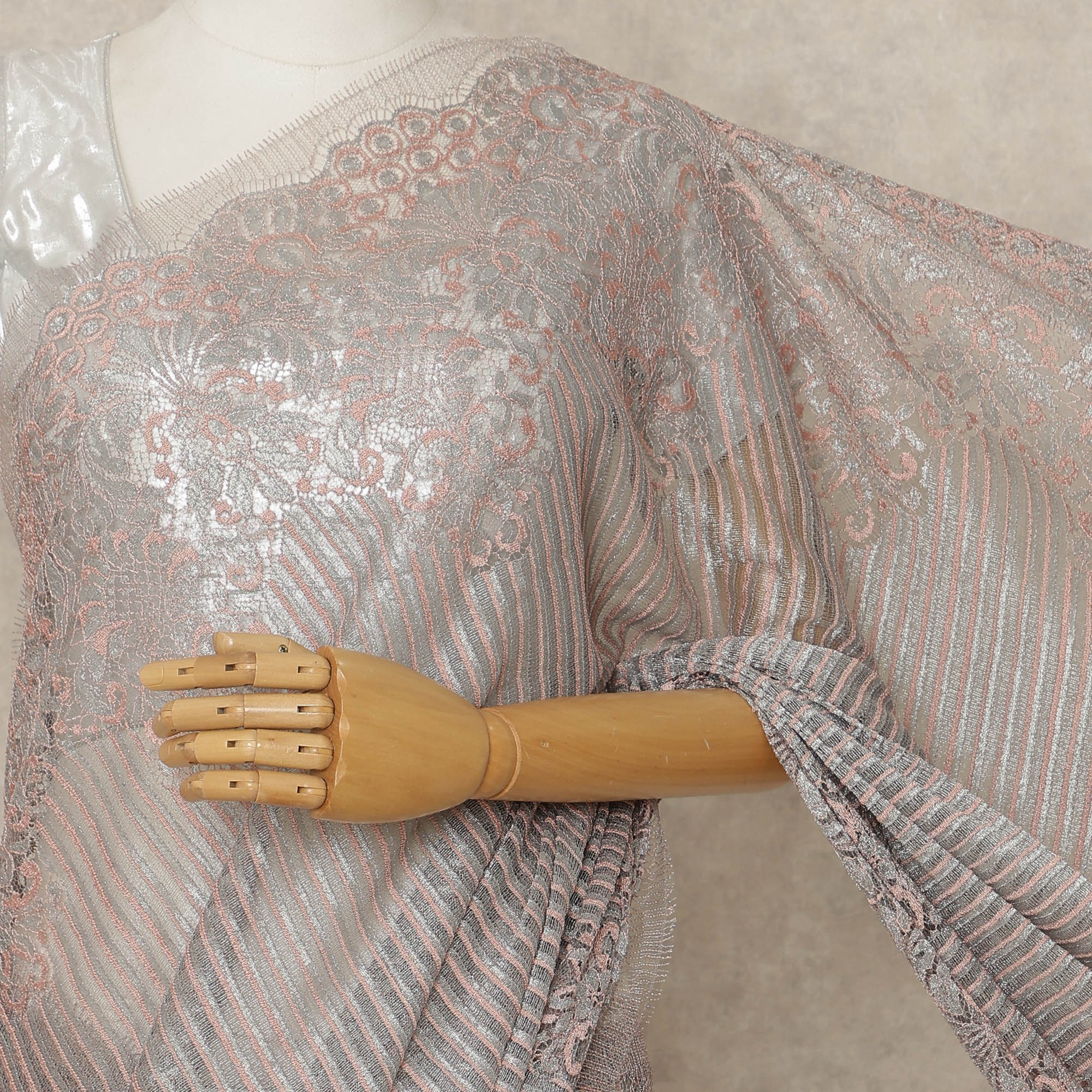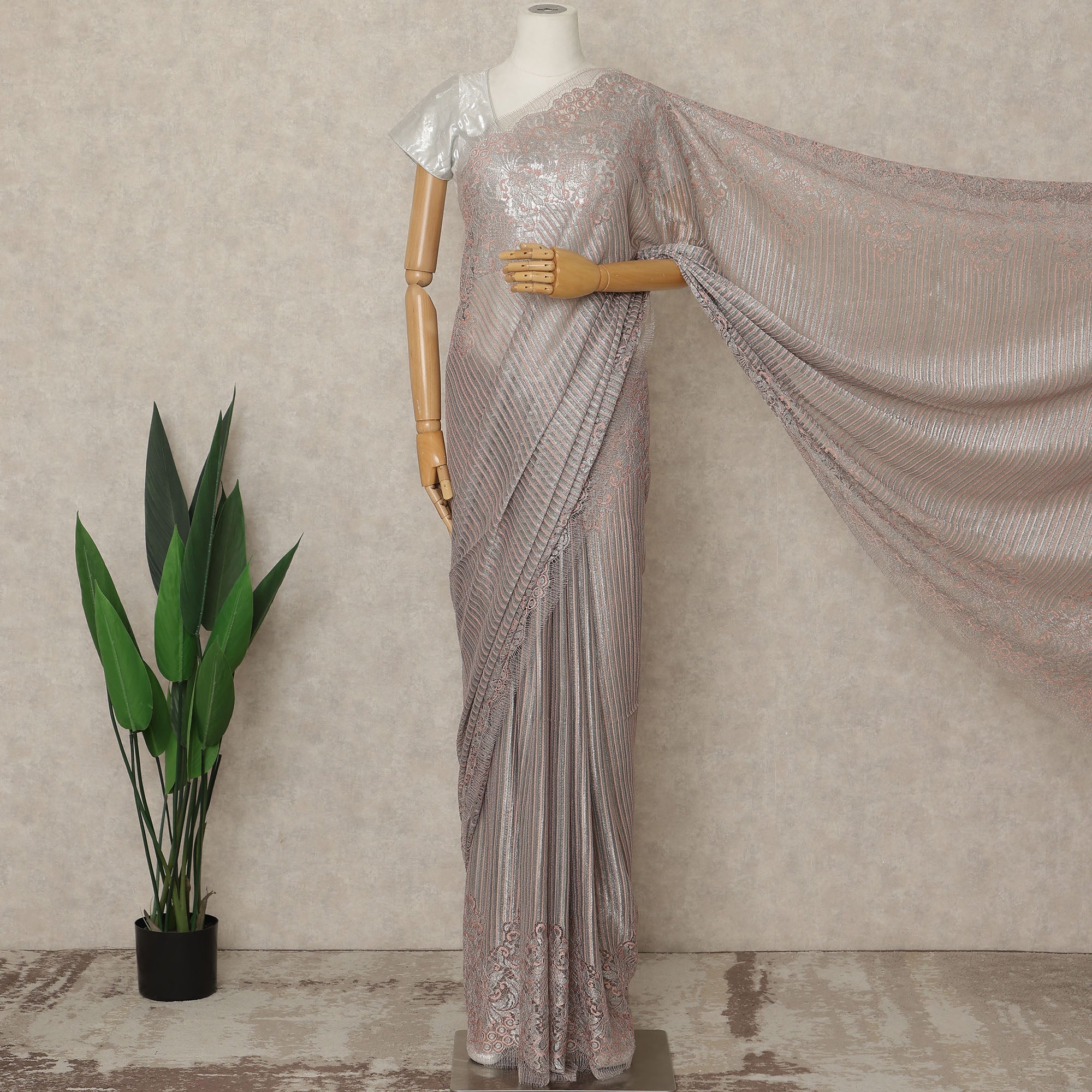Indulge in modern elegance with this Silver Rose Premium French Metallic Chantilly Lace Saree, exquisitely crafted in France to blend contemporary metallic brilliance with timeless Chantilly lace artistry; the soft silver-rose hue highlights the saree’s unique striped metallic texture, while delicate floral lace motifs woven along the border and pallu bring a refined feminine charm, making it the perfect choice for weddings, receptions, cocktail evenings, festive gatherings, and high-fashion events; woven with superior Regal Fabrics craftsmanship, this saree features a feather-light, graceful drape that ensures comfort and fluid movement throughout the day or night; measuring approximately 5.5 meters in length and 110 cms in width, it offers ample flexibility for versatile draping styles, and since the blouse is not included, it allows complete creative freedom to pair with complementing or contrasting fabrics to achieve your desired ensemble; ideal for fashion enthusiasts who love to shop online for exclusive luxury ethnic wear, this French Chantilly lace saree beautifully captures the synergy of heritage craftsmanship and modern sophistication; to preserve its lustrous finish and intricate lace detailing, dry clean only and store carefully.