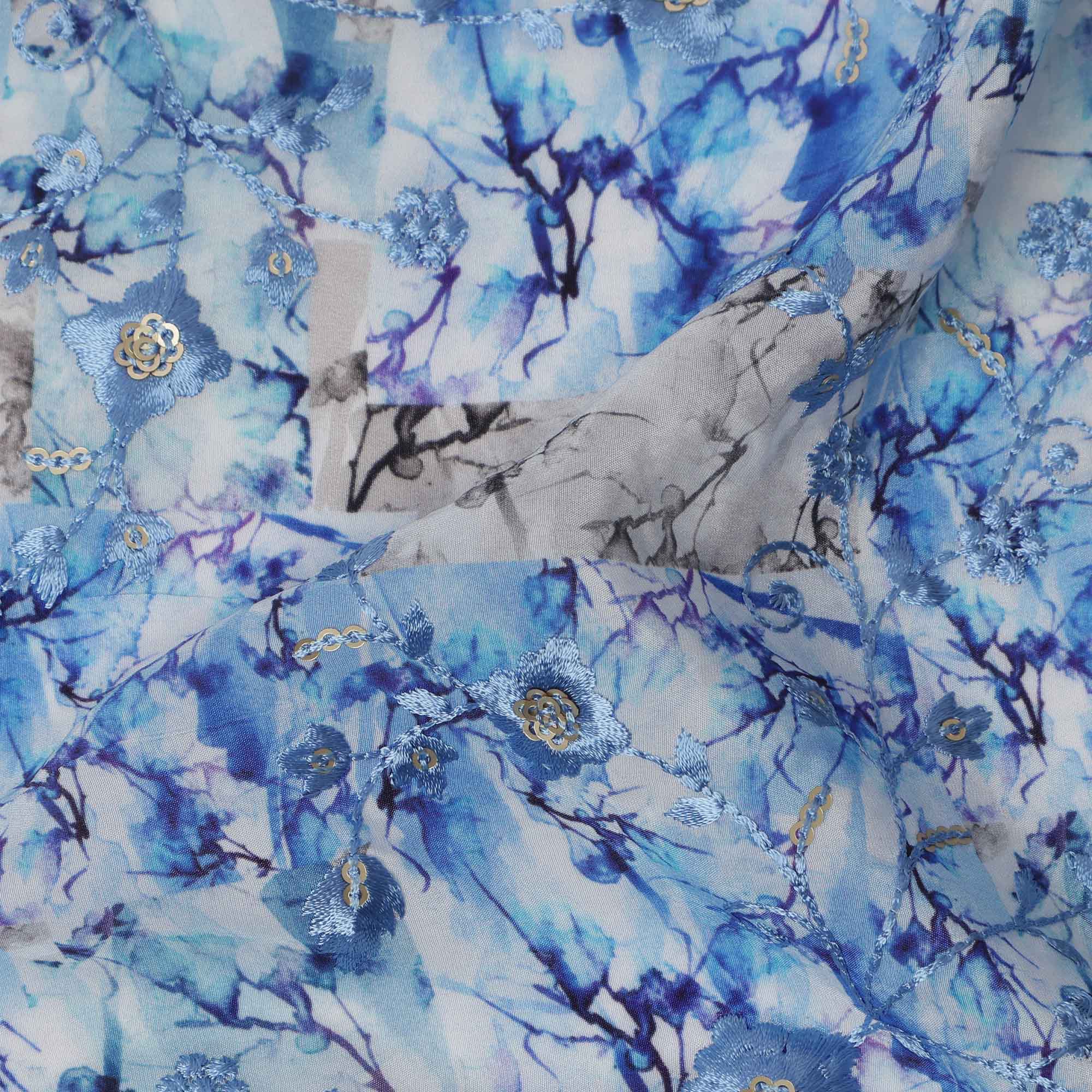 Delicate and refreshing, this sky blue and white floral digital print viscose crepe fabric captures the essence of breezy elegance.... Read more Read more