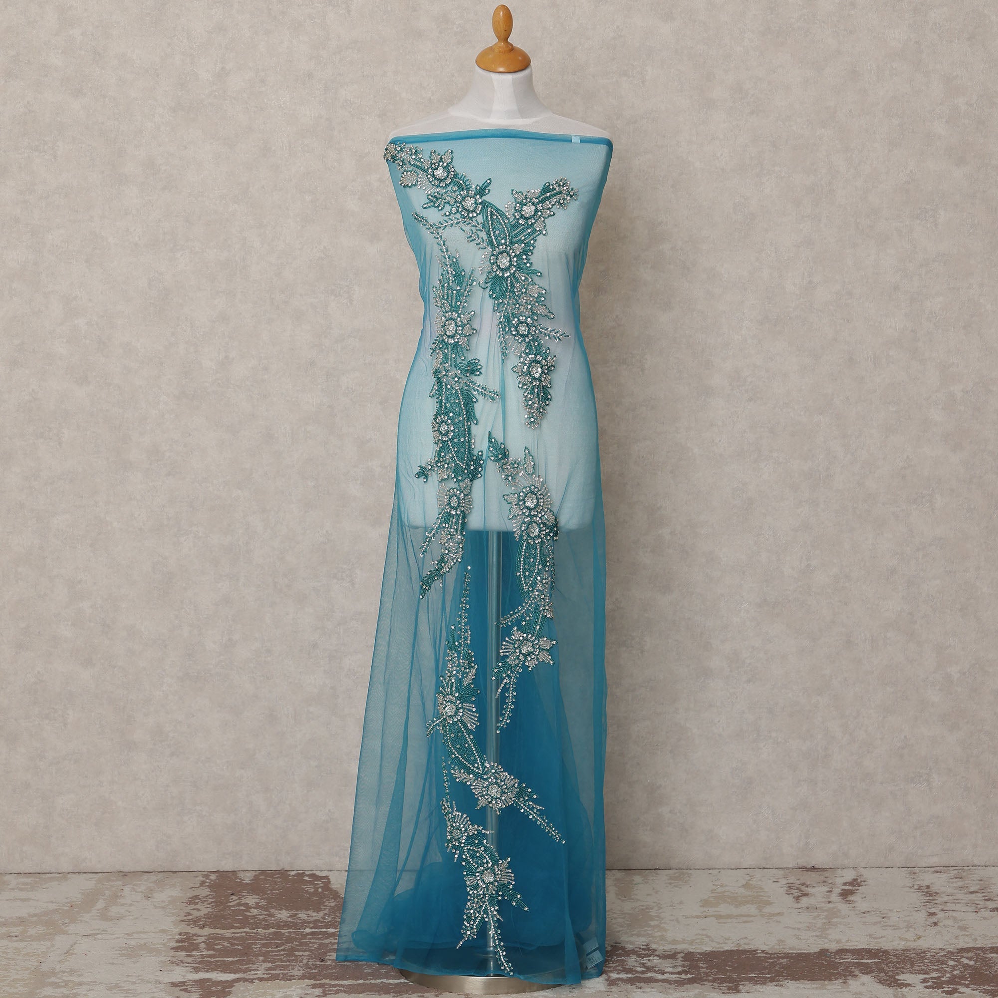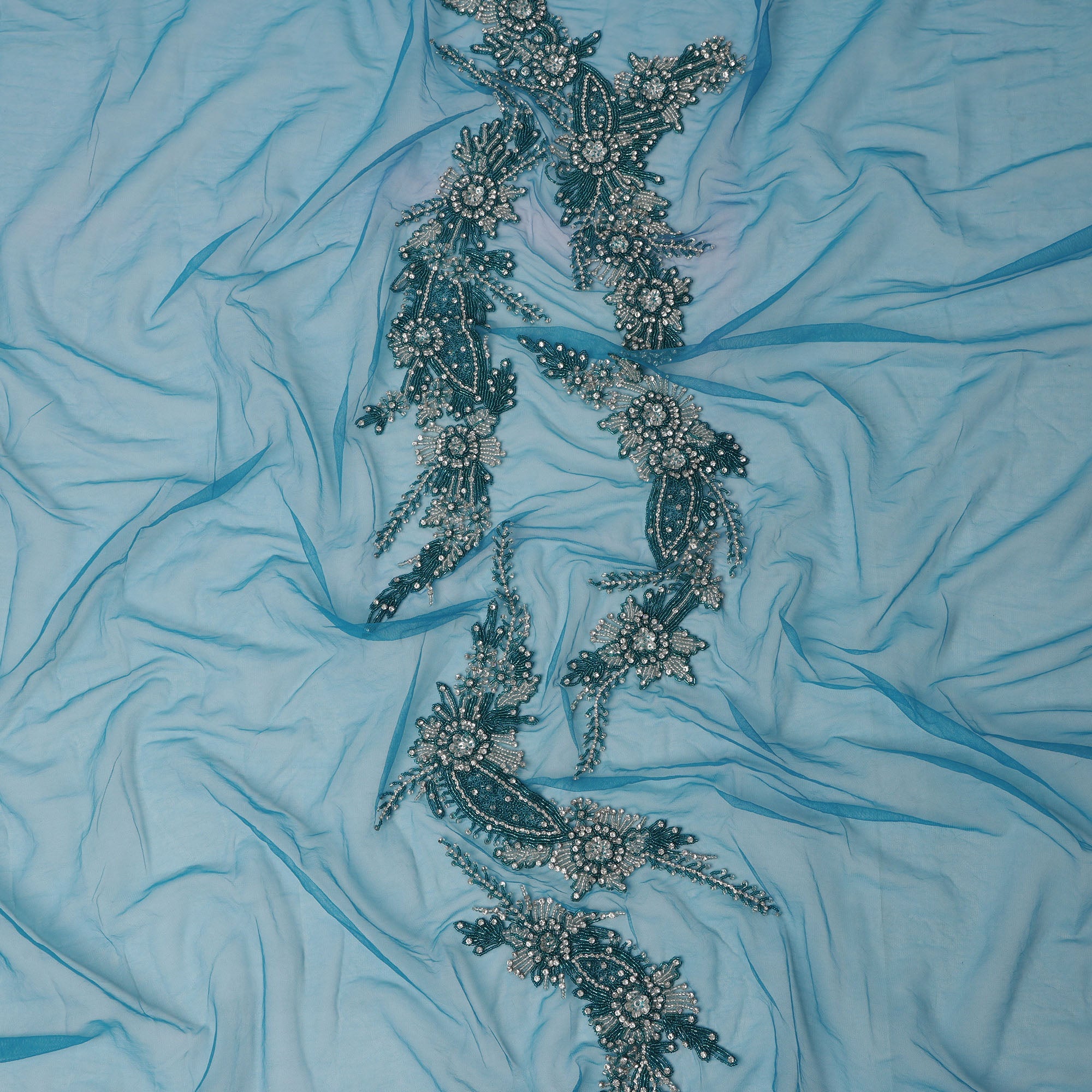 Radiant and refreshing, this sky blue nylon tulle fabric features exquisite floral embroidery in silver sequins and blue beadwork, gracefully arranged in a cascading vine layout. Designed in a 3-meter length with a width of 140 cm, this fabric is perfect for elegant Fustaann dresses or ethnic couture garments. The vivid blue base contrasts beautifully with the detailed embellishments, adding depth and vibrance without compromising on lightness. Crafted by skilled artisans in India, the embroidery showcases rich floral motifs with precision and dimension, ideal for bridal receptions, festive wear, or custom evening ensembles. The sheer tulle allows for breathable structure and effortless drape, making this a premium choice for designers seeking both tradition and trend. Shop online to elevate your statement pieces with this stunning fabric.