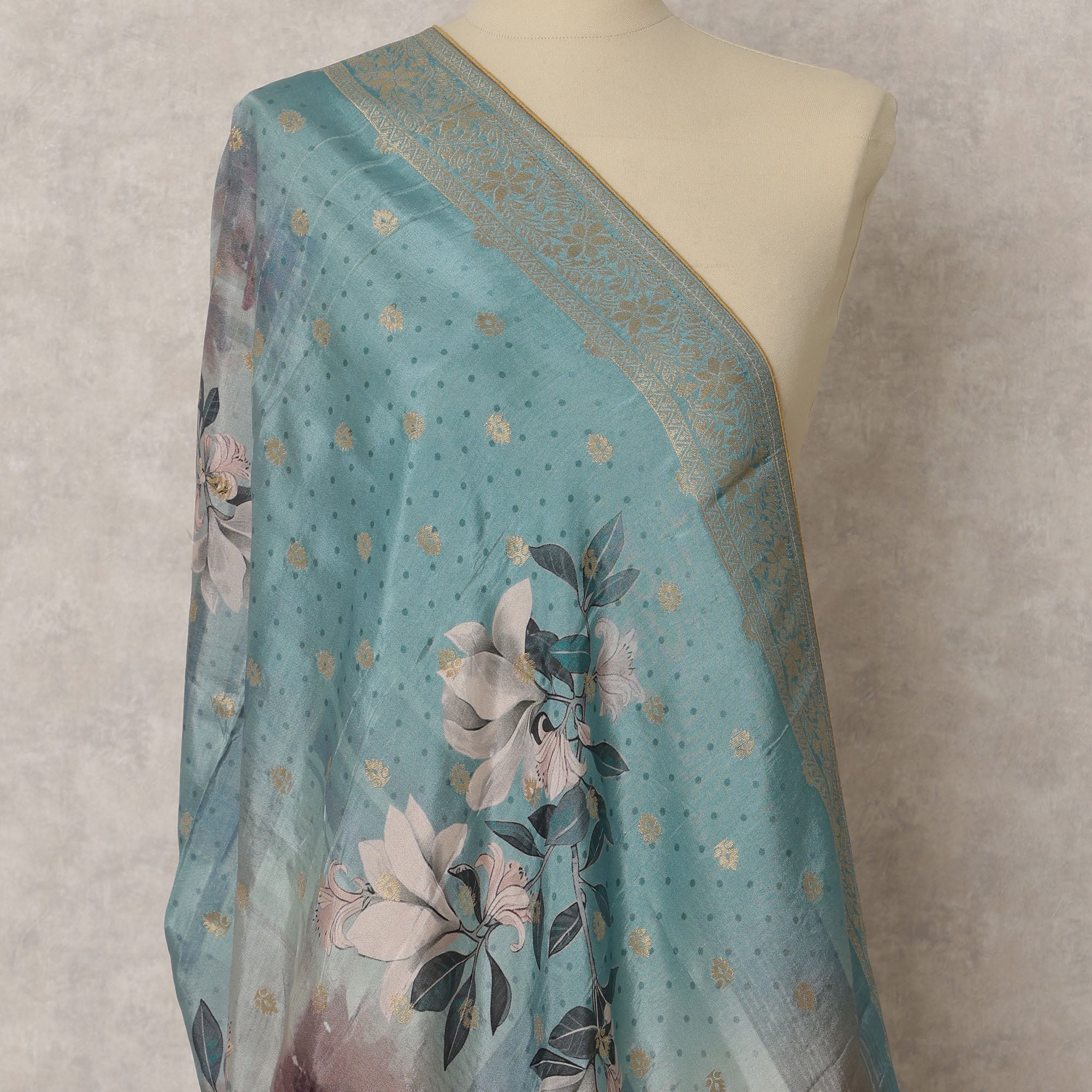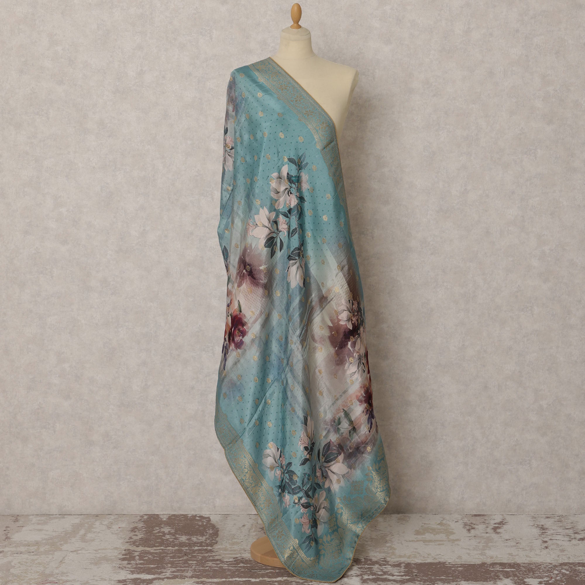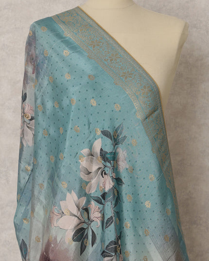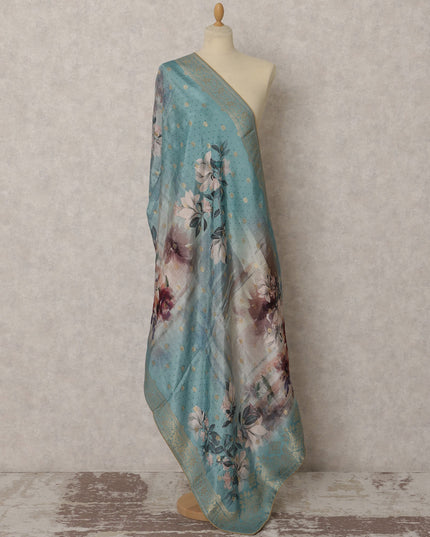 Sky Blue Floral & Gold Woven Synthetic Brocade Dupatta, Elegant Ethnic Stole, 230X85 CMS, India-D22369