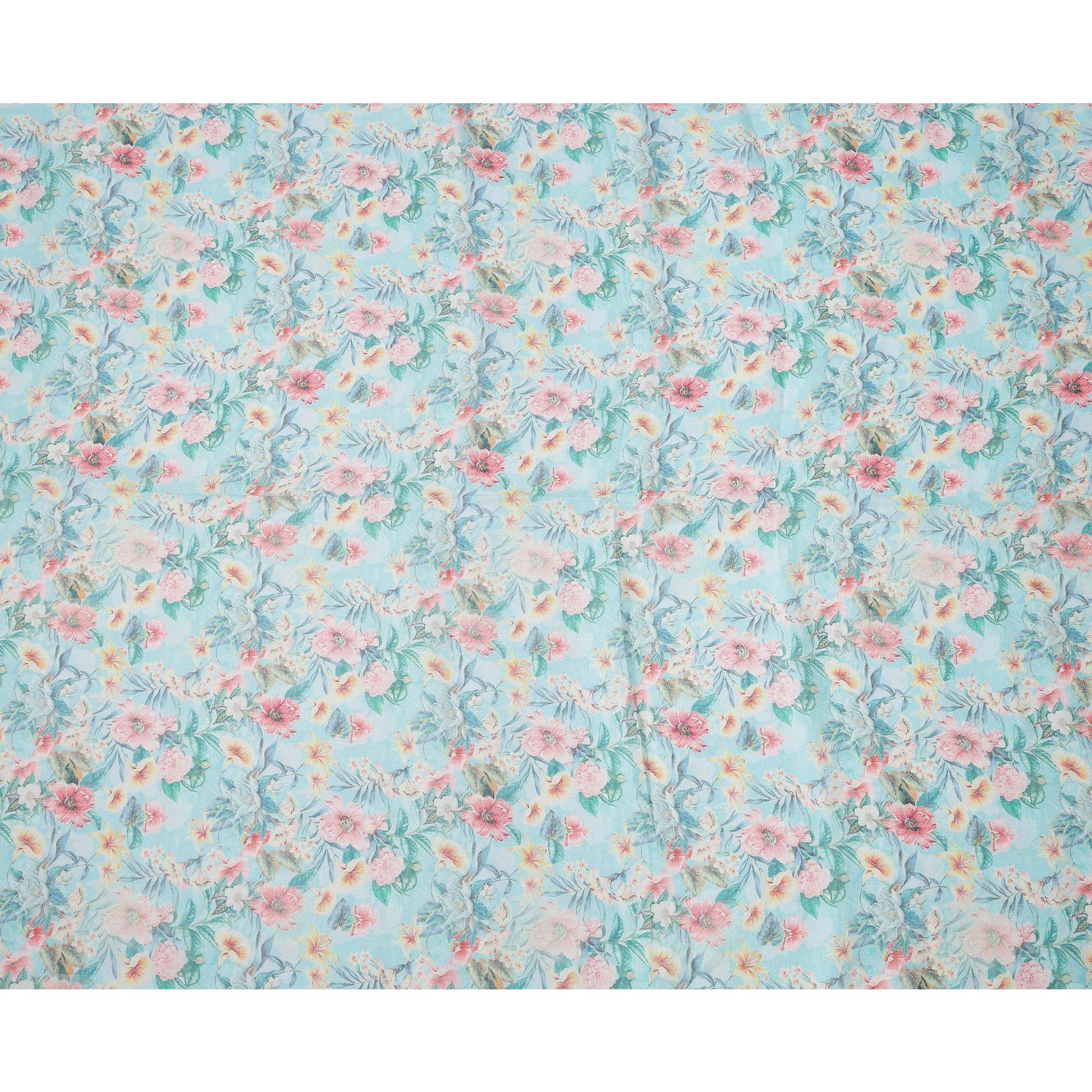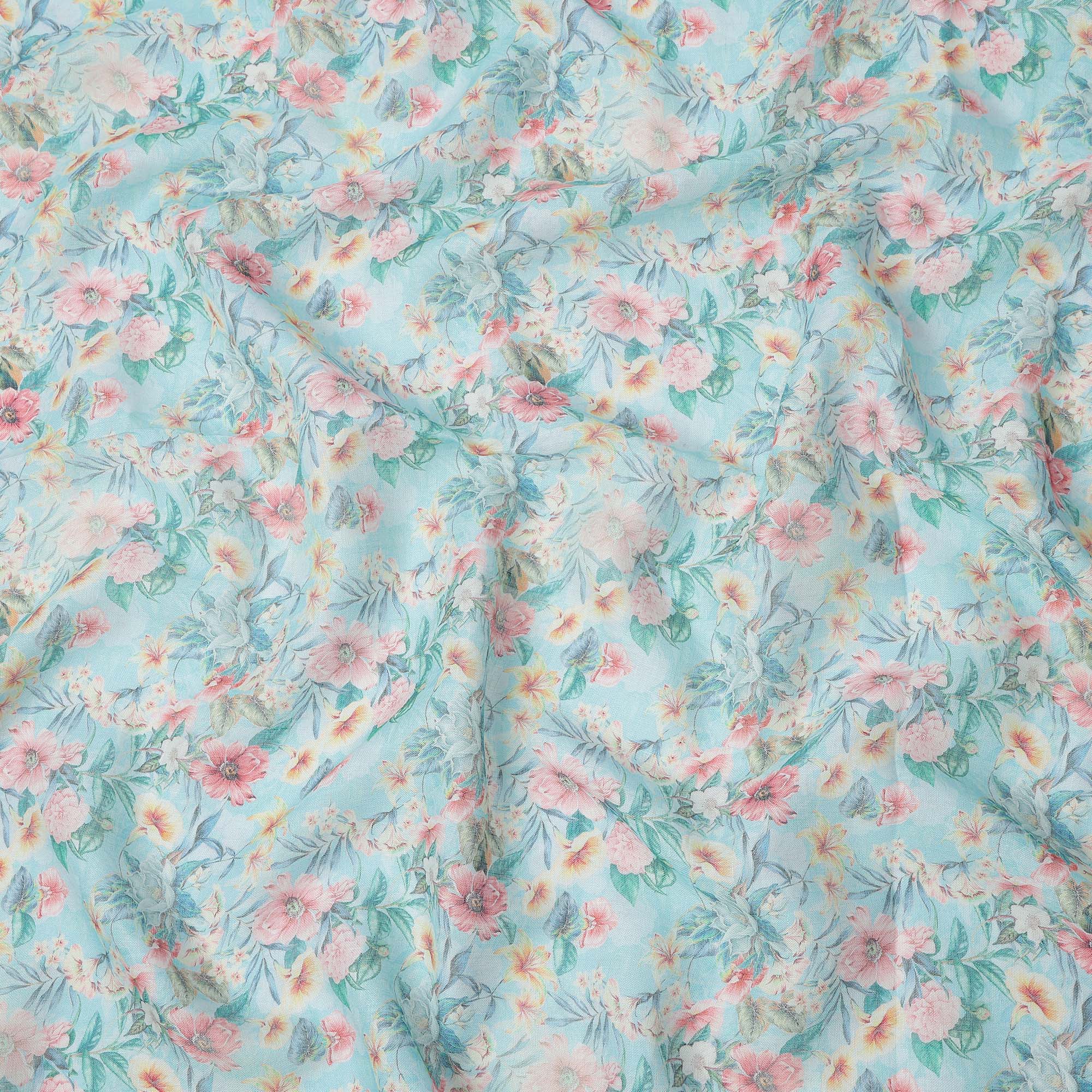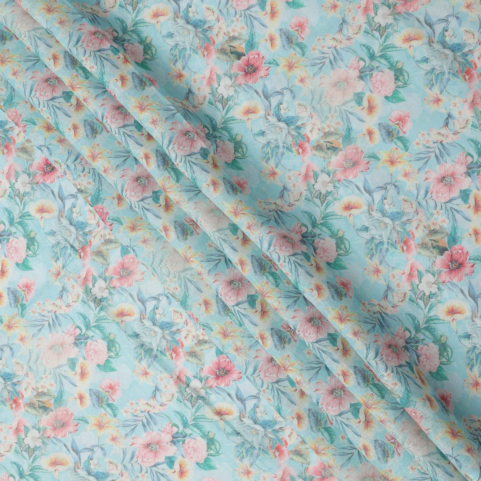 Sky Blue Floral Printed Blended Cotton Linen Fabric, 110 Cms Width, India-D25165