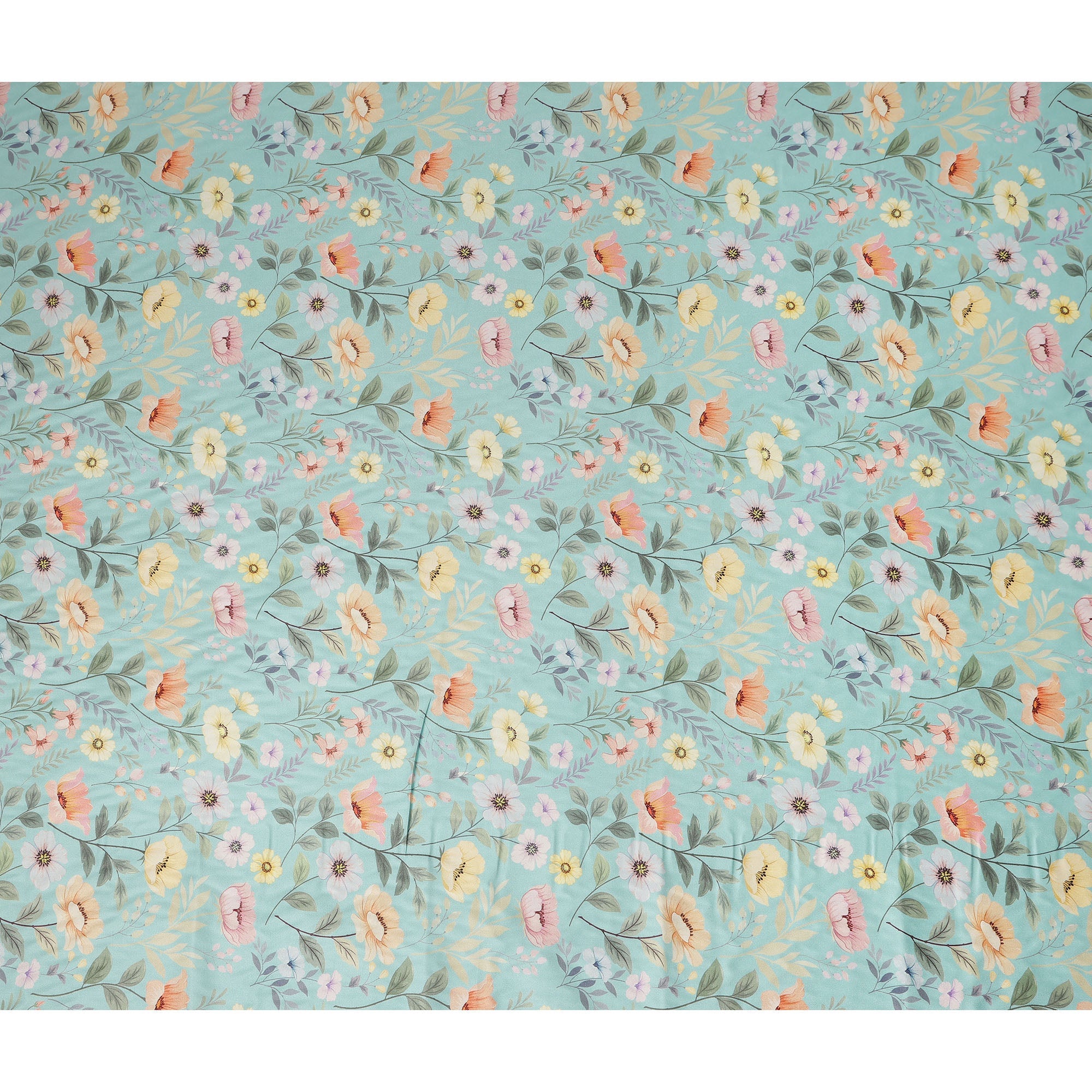 Sky blue base with delicate multicolor botanical floral print creates a fresh and graceful look for stylish apparel designs.