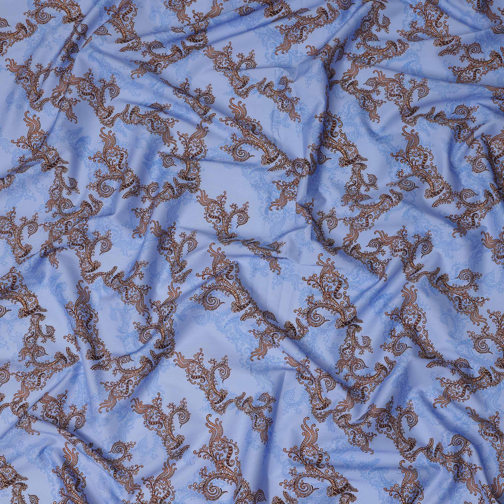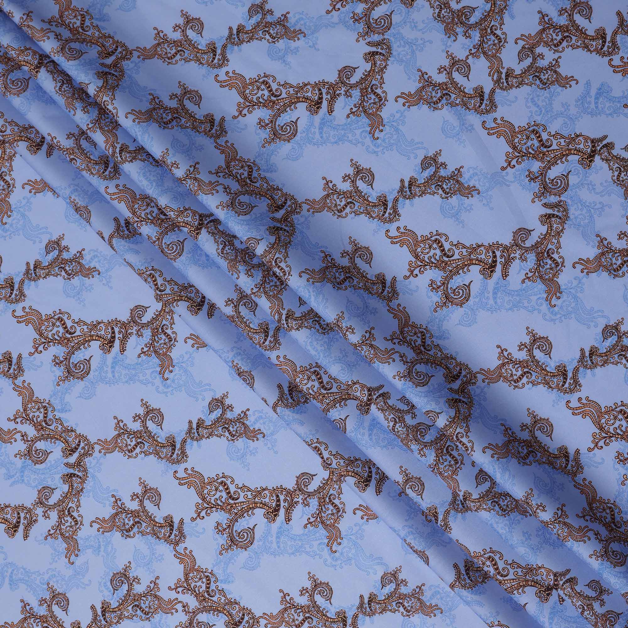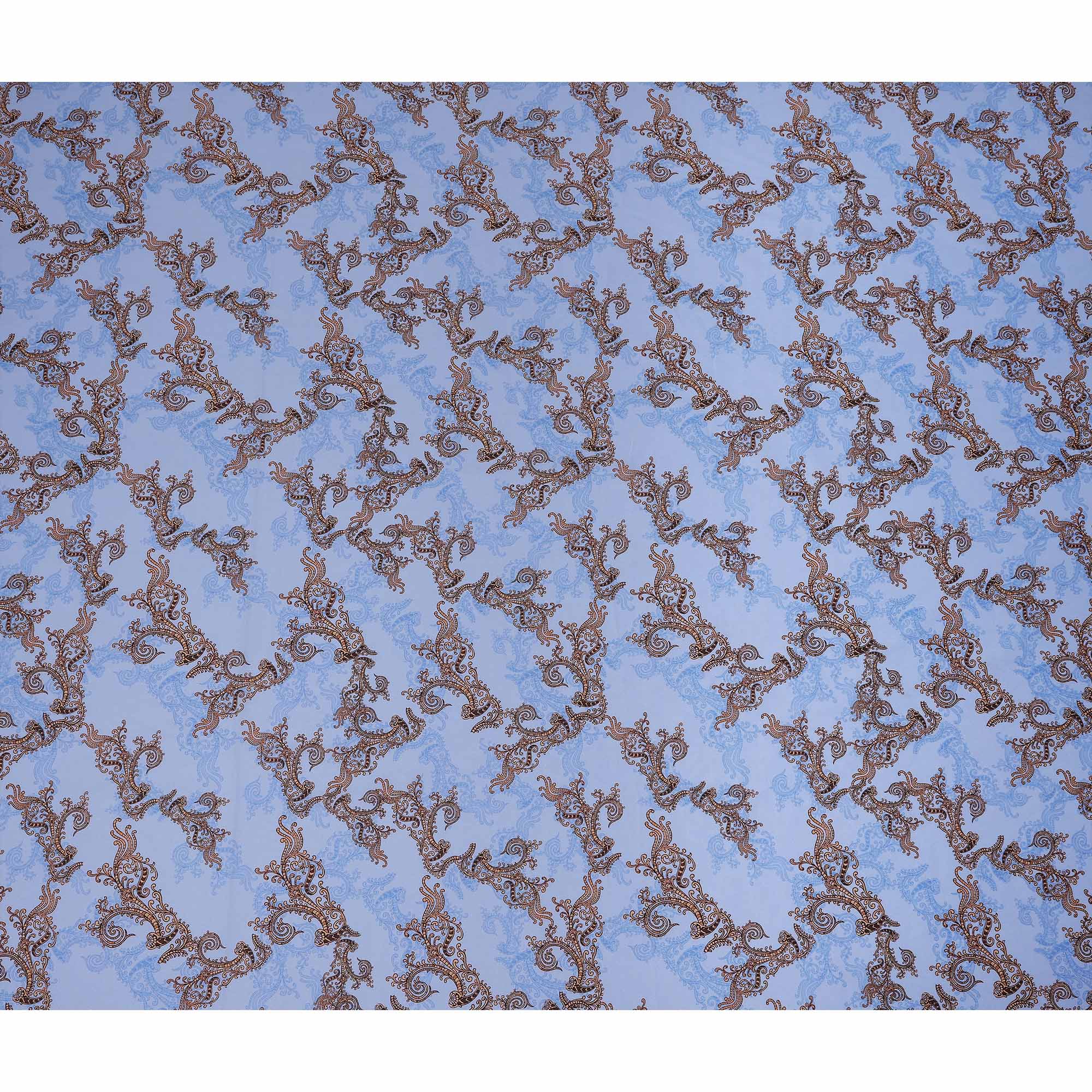 This sky blue paisley ornamental printed cotton satin fabric features a soft sky blue base beautifully enhanced with intricate brown... Read more Read more