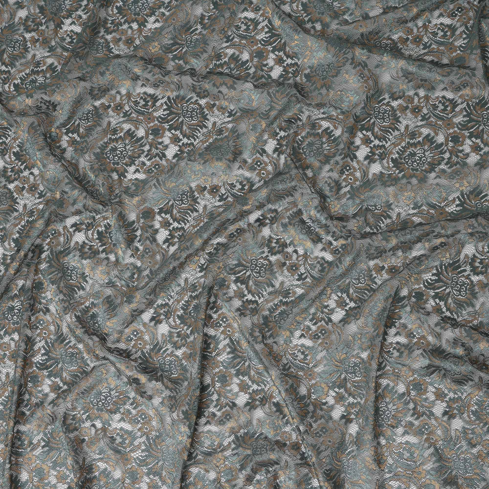 This slate grey synthetic metallic lace fabric features intricate floral embroidery enhanced with subtle metallic accents that add depth, texture,... Read more Read more