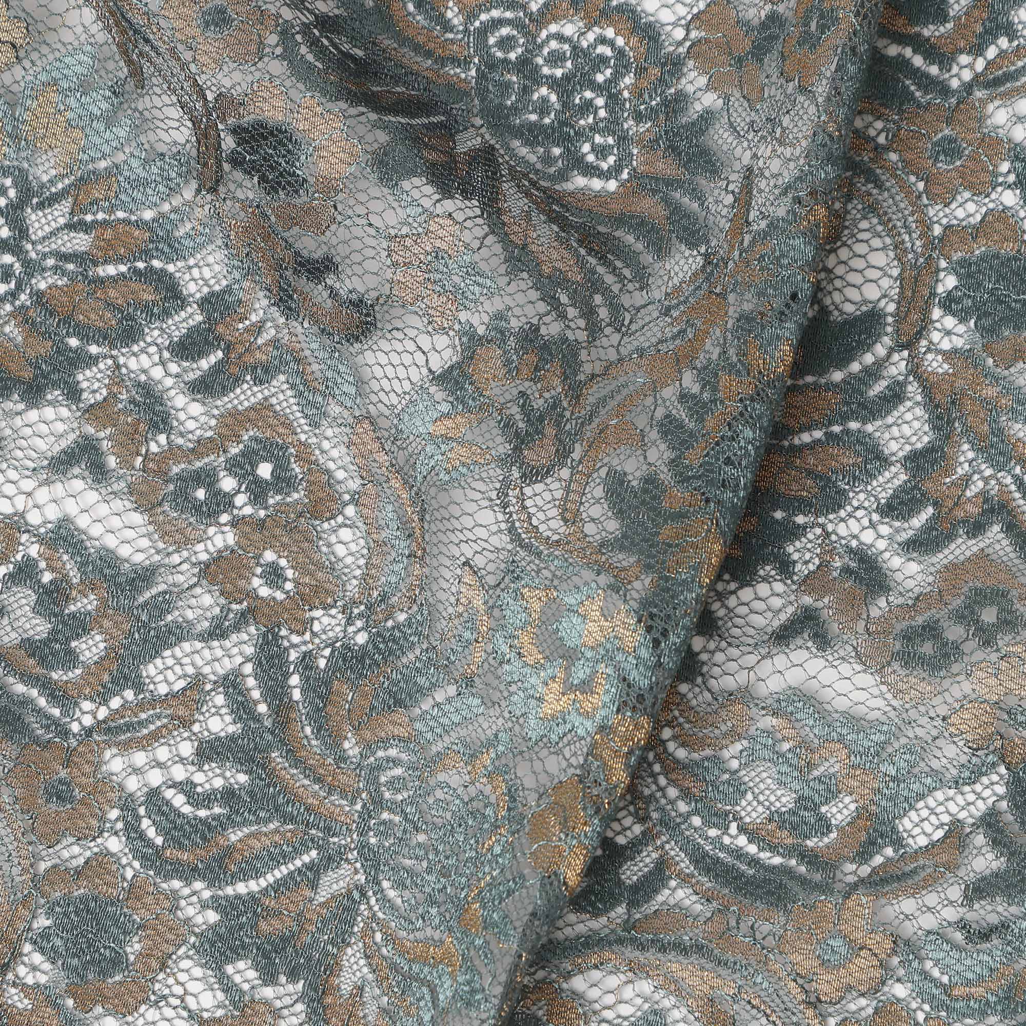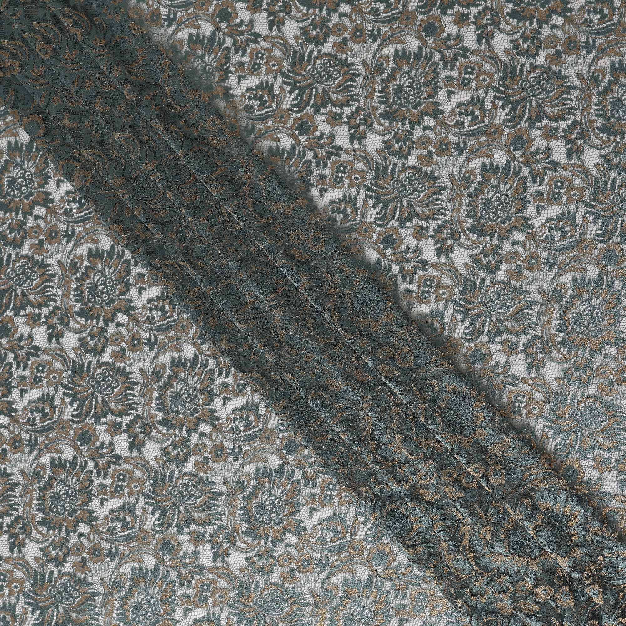 This slate grey synthetic metallic lace fabric features intricate floral embroidery enhanced with subtle metallic accents that add depth, texture, and a refined contemporary elegance. The muted grey base paired with soft metallic highlights creates a sophisticated balance, making the fabric suitable for both modern and classic designs. Crafted on a fine lace net, it offers a graceful drape while maintaining durability and shape for structured as well as flowing silhouettes. Ideal for evening gowns, cocktail dresses, reception outfits, fusion wear, blouses, lehengas, saree borders, and couture overlays, this fabric elevates garments with understated luxury. Lightweight and breathable, it ensures comfort during extended wear while delivering a premium finish, making it a versatile choice for designers seeking elegance without excess shine.