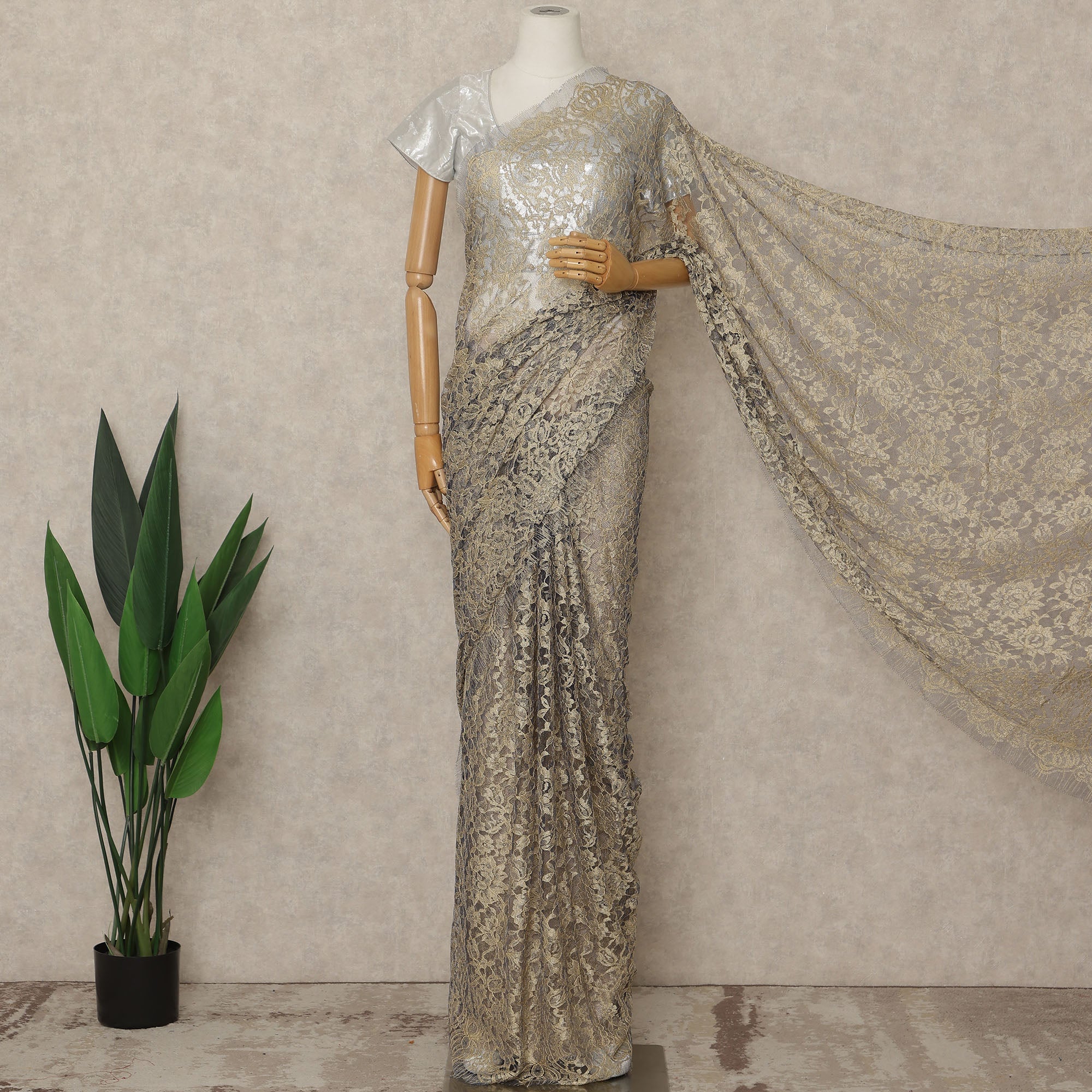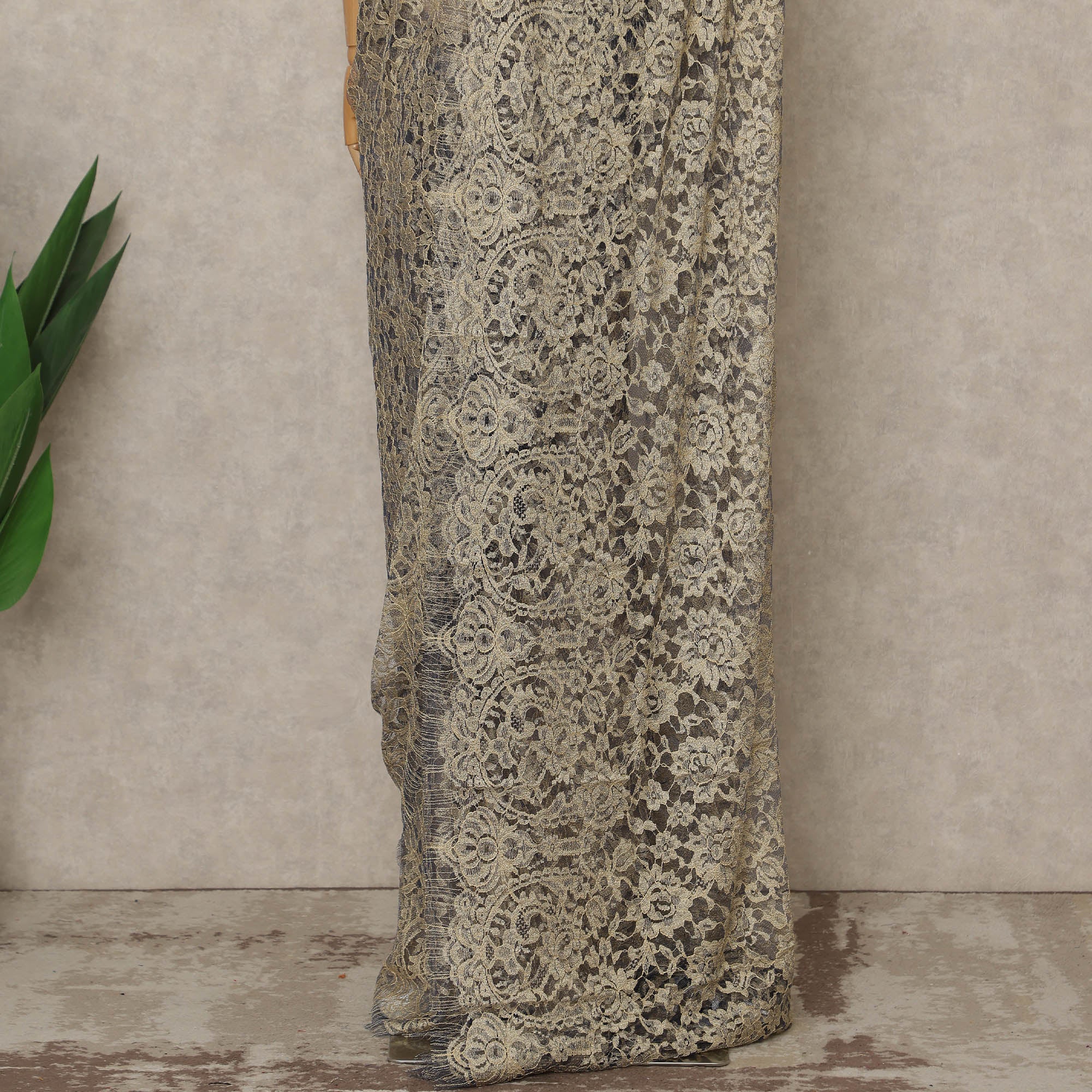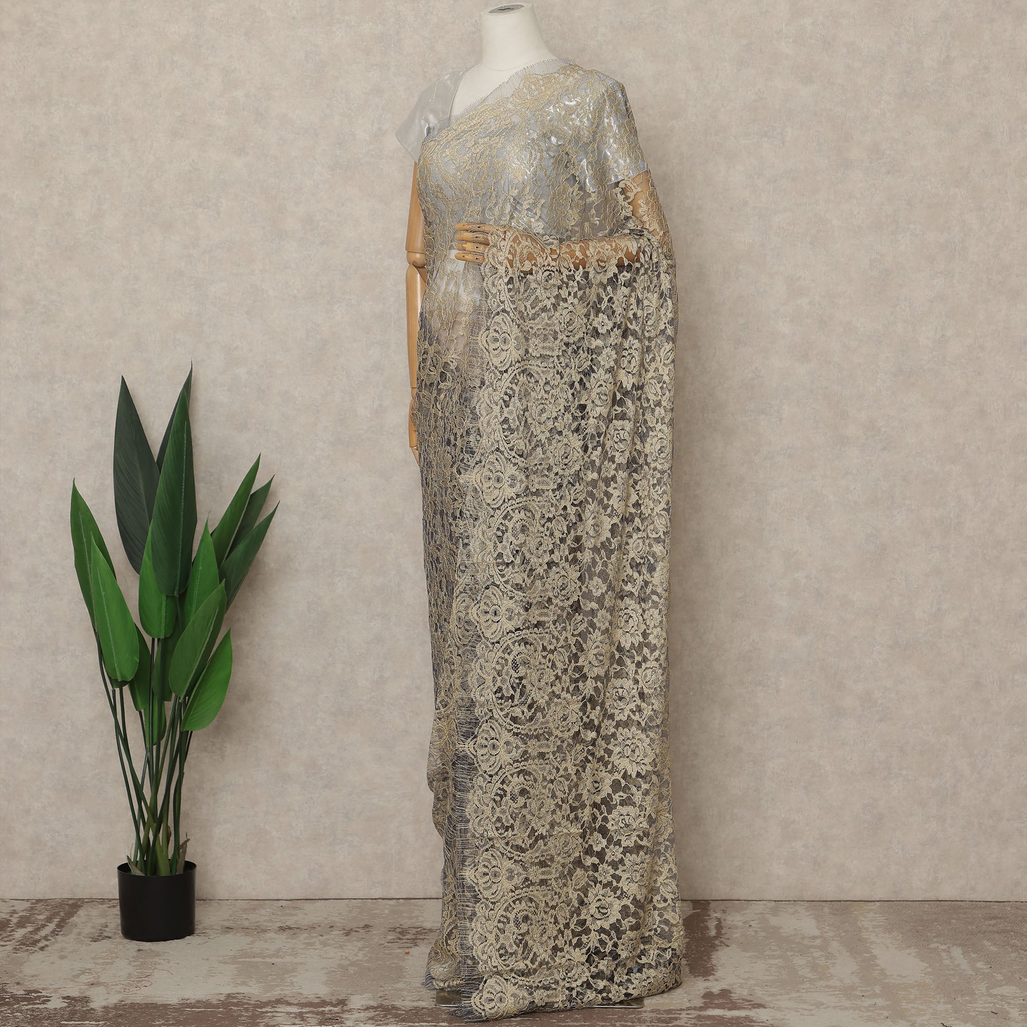 Elegant and effortlessly luxurious, this Soft Beige Blue Premium French 2-Tone Chantilly Lace Saree showcases a refined blend of soft Beige and subtle Blue tones that create a graceful two-tone effect, highlighting the delicate floral Chantilly lace patterns crafted with exceptional French artistry, presented as a premium lace fabric piece measuring approximately 5.5 meters in length with a wide 110 cms width, making it ideal for creating statement sarees for evening wear, receptions, formal occasions, and festive celebrations, where the sheer texture and fluid drape enhance sophistication while allowing versatile styling options, and as a pure lace saree fabric sourced from France, it reflects timeless elegance and couture appeal, with blouse not included to offer complete freedom for customized blouse design, and gentle hand wash or professional dry clean is recommended to maintain the intricate lace detailing and color finesse.