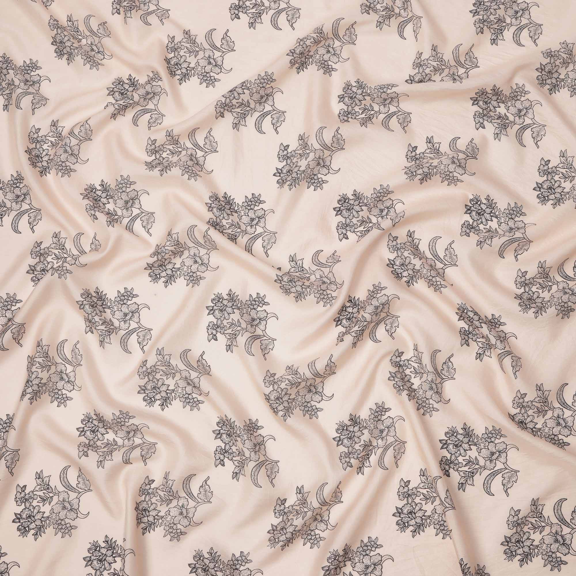 Soft Beige with Black Floral Outline Print Viscose Crepe Fabric, 110 Cms Width, Made in India-D23601