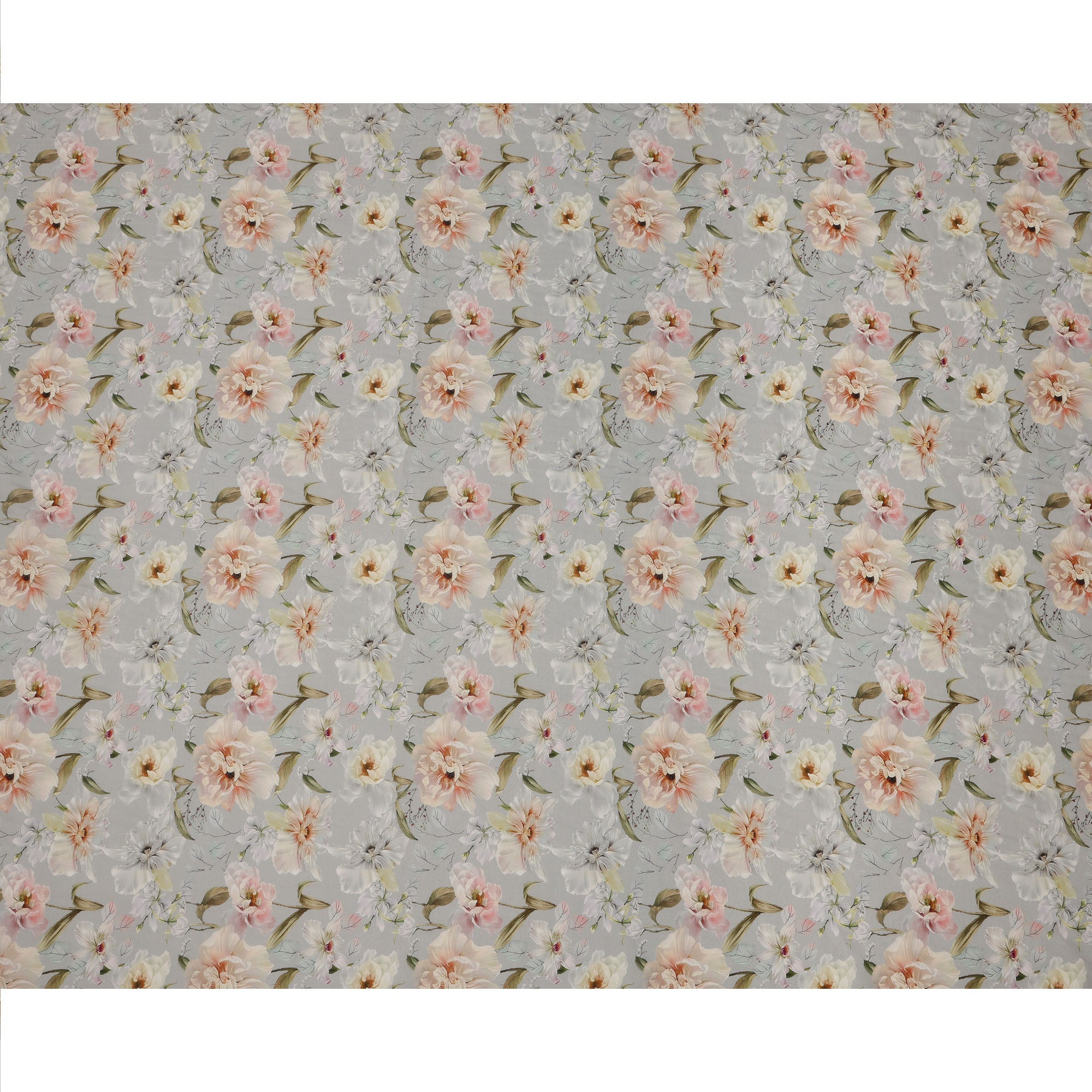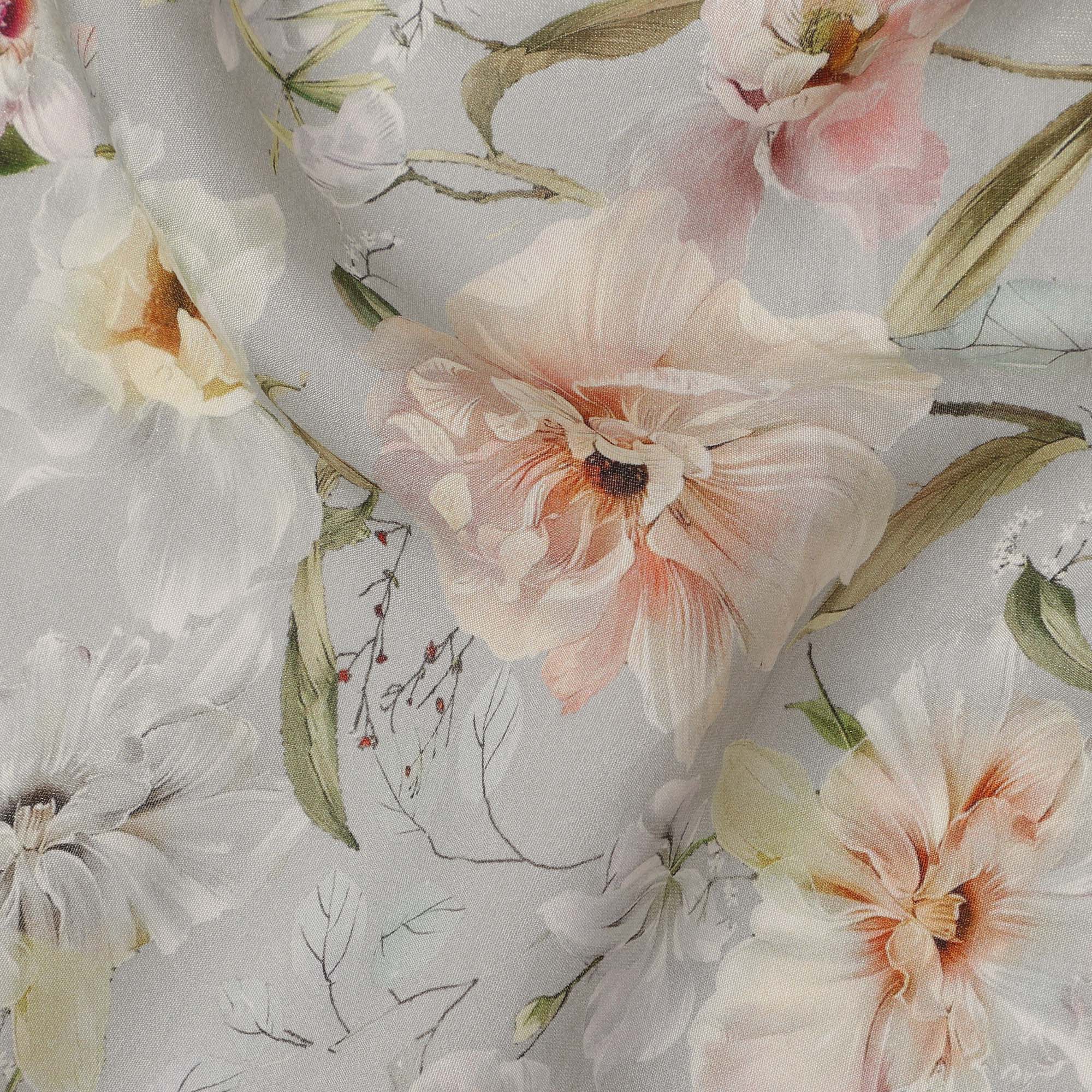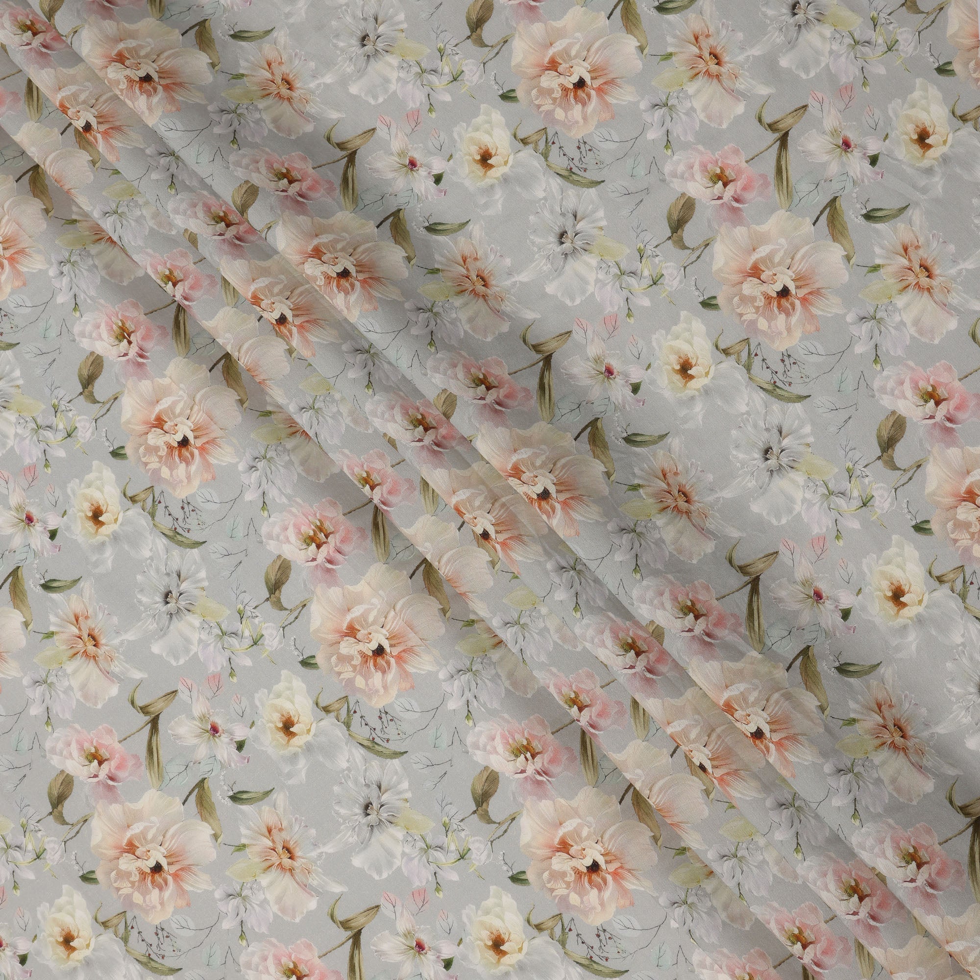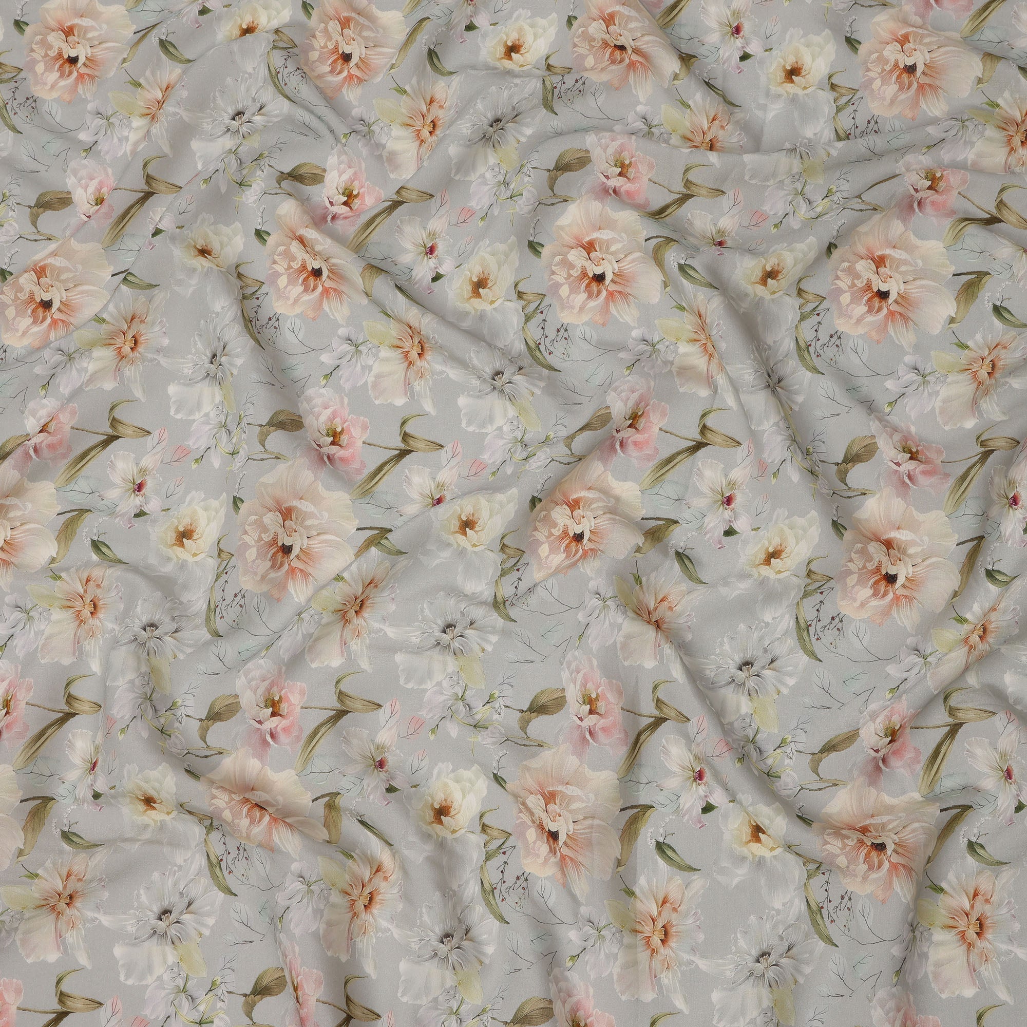 Soft Grey Base Peach and Ivory Floral Printed Viscose Crepe Fabric, 110 Cms Width, Made in India-D23985
