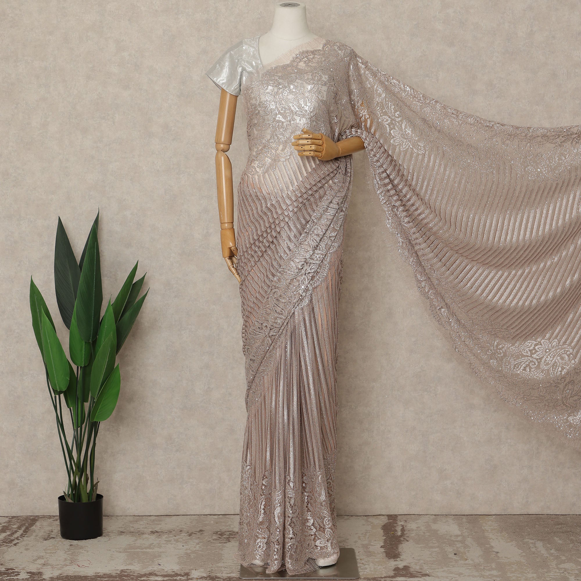 Elegant soft taupe rose metallic Chantilly lace saree fabric with delicate stone work detailing.