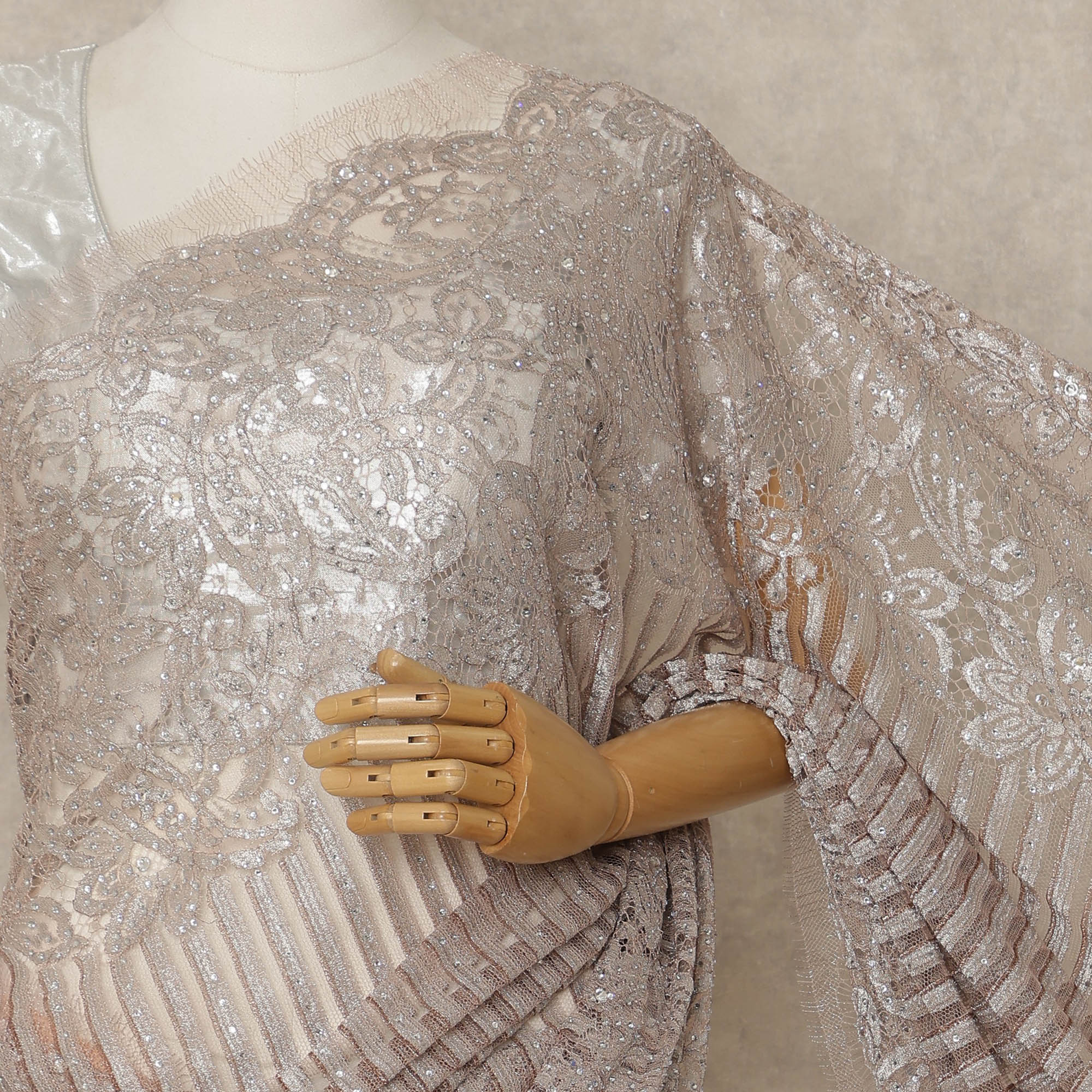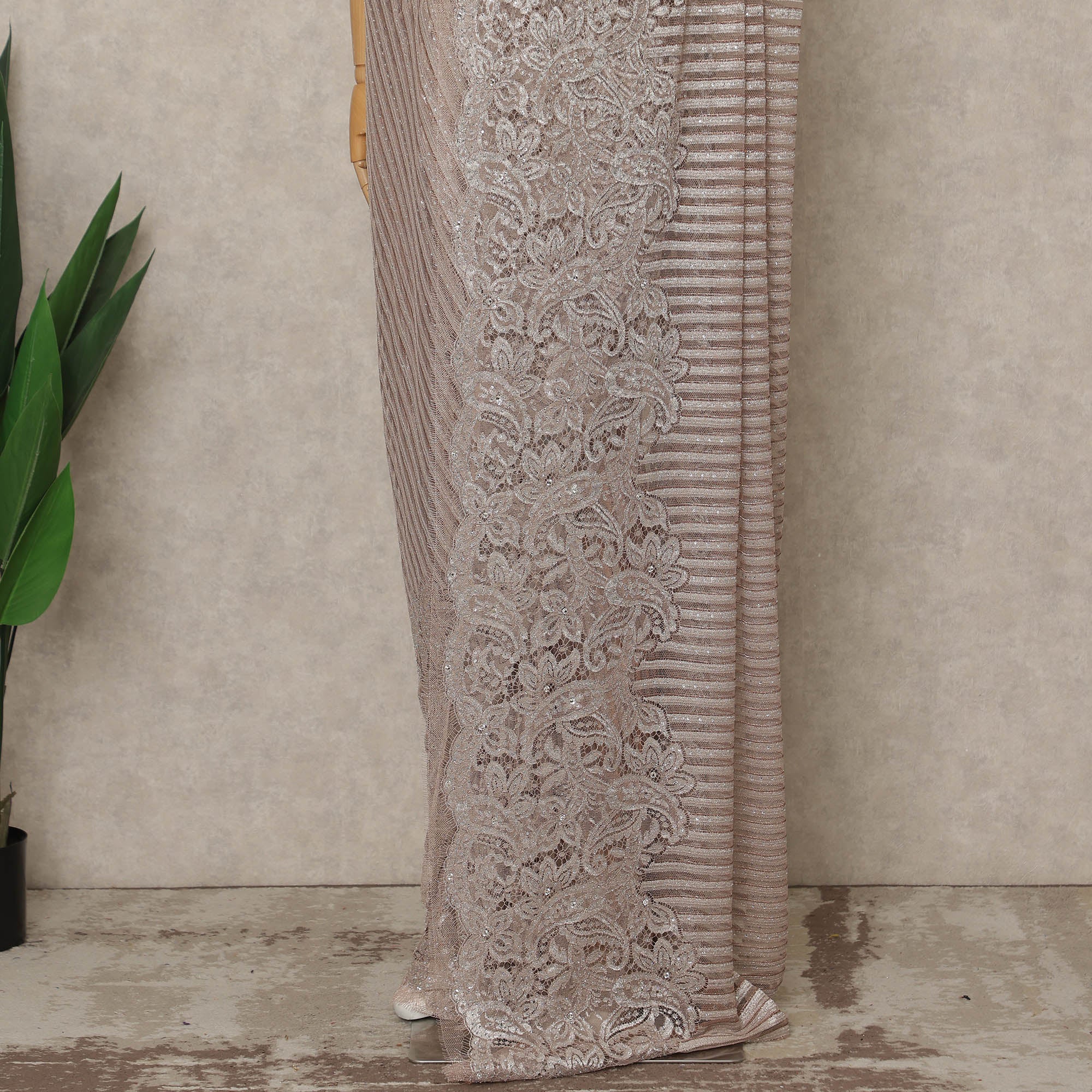 Soft Taupe Rose Premium French Metallic Chantilly Lace Saree with Stone Work, 5.5 Mtrs Length, 110 Cms Width, Made in France-D27137