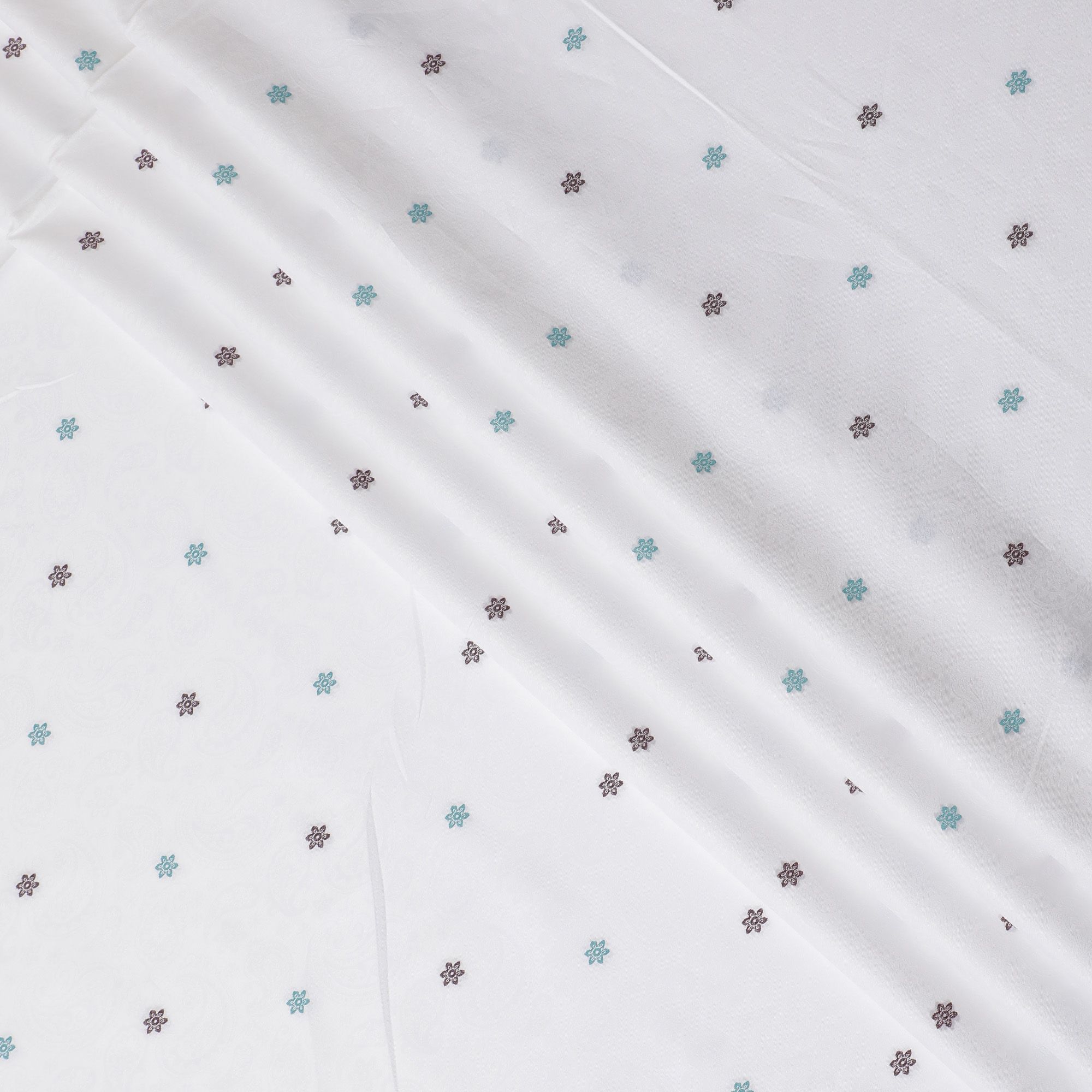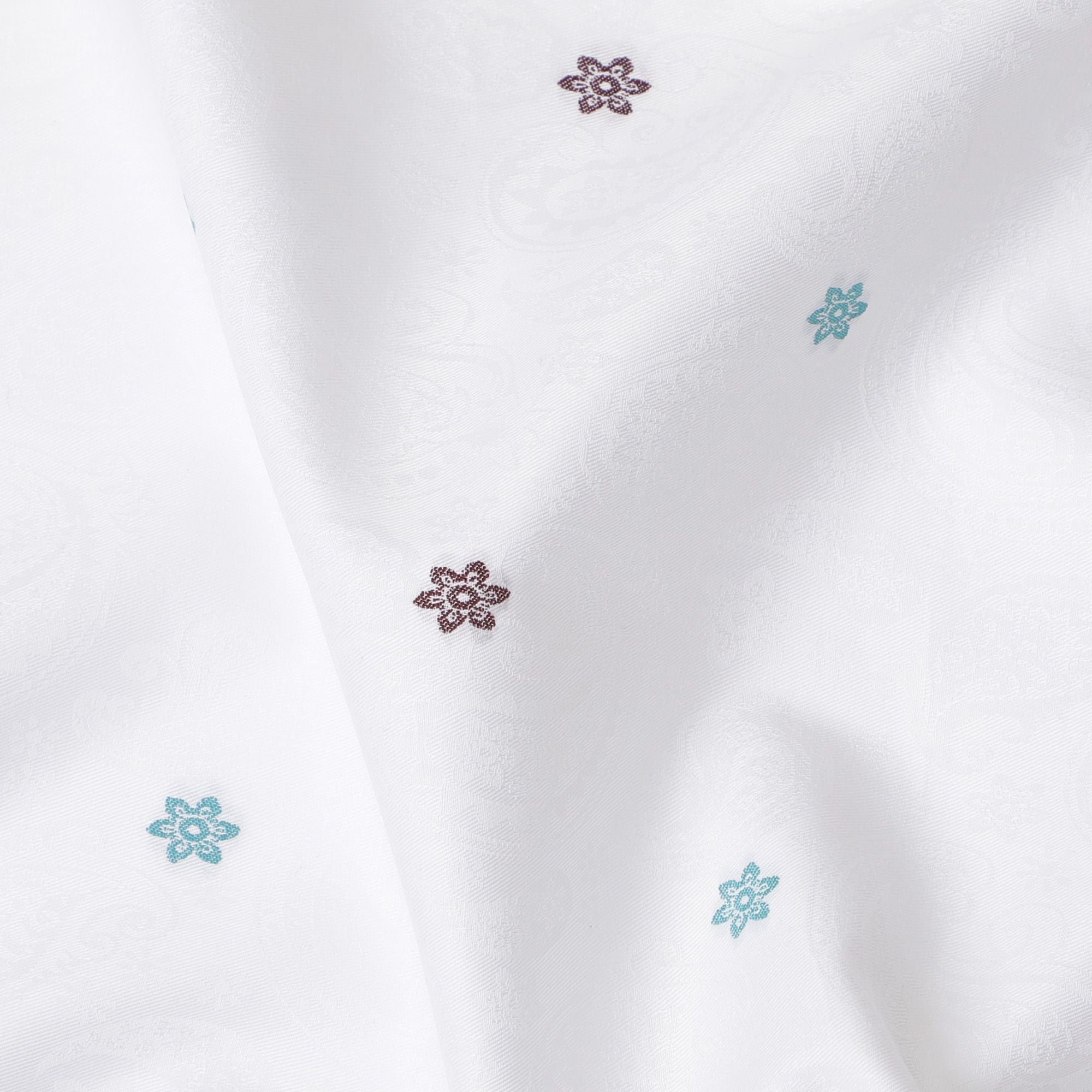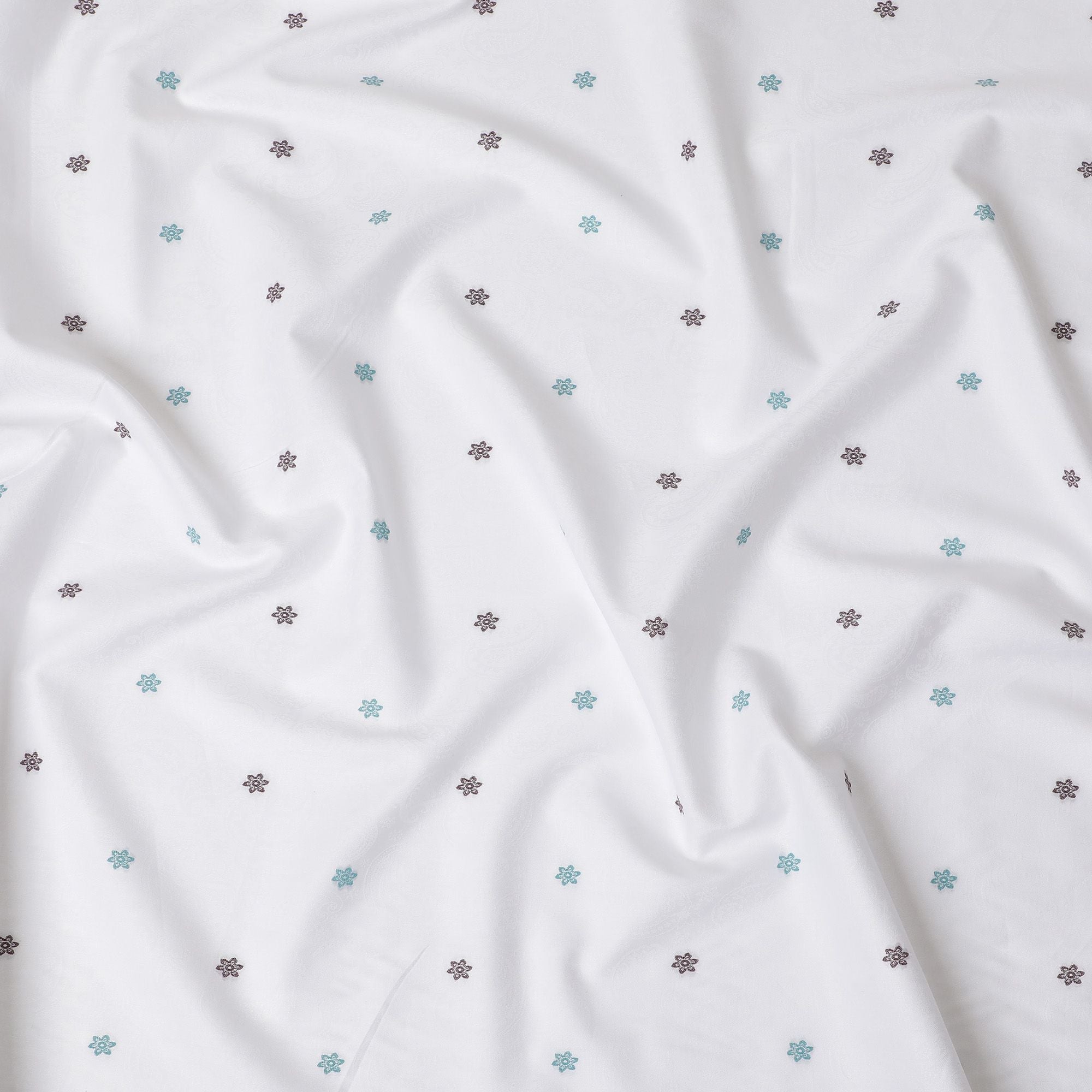 Our Sophisticated Floral Embellished Cotton Shirting Fabric exudes a classic charm with a modern twist. This 100% cotton fabric, carefully woven in India, boasts a generous width of 150 cm, ideal for crafting premium shirts. The white base is elegantly punctuated with intricate maroon and teal floral motifs, adding a hint of color and character to your wardrobe. Designed for those who seek quality and style, this fabric provides a smooth, comfortable feel against the skin, with the breathability needed for daily wear. Perfect for custom shirts that require a touch of elegance, it offers the perfect canvas for both casual and formal designs.