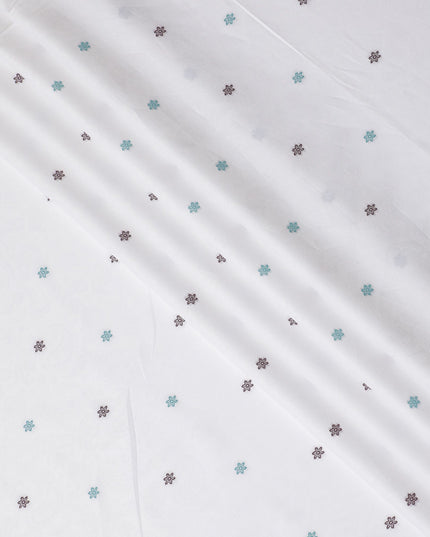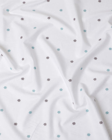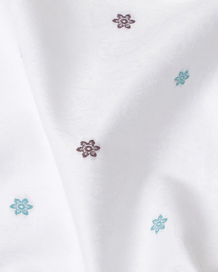 Sophisticated Floral Embellished Cotton Shirting Fabric, 150 cm Width - White with Maroon & Teal Accents-D18737