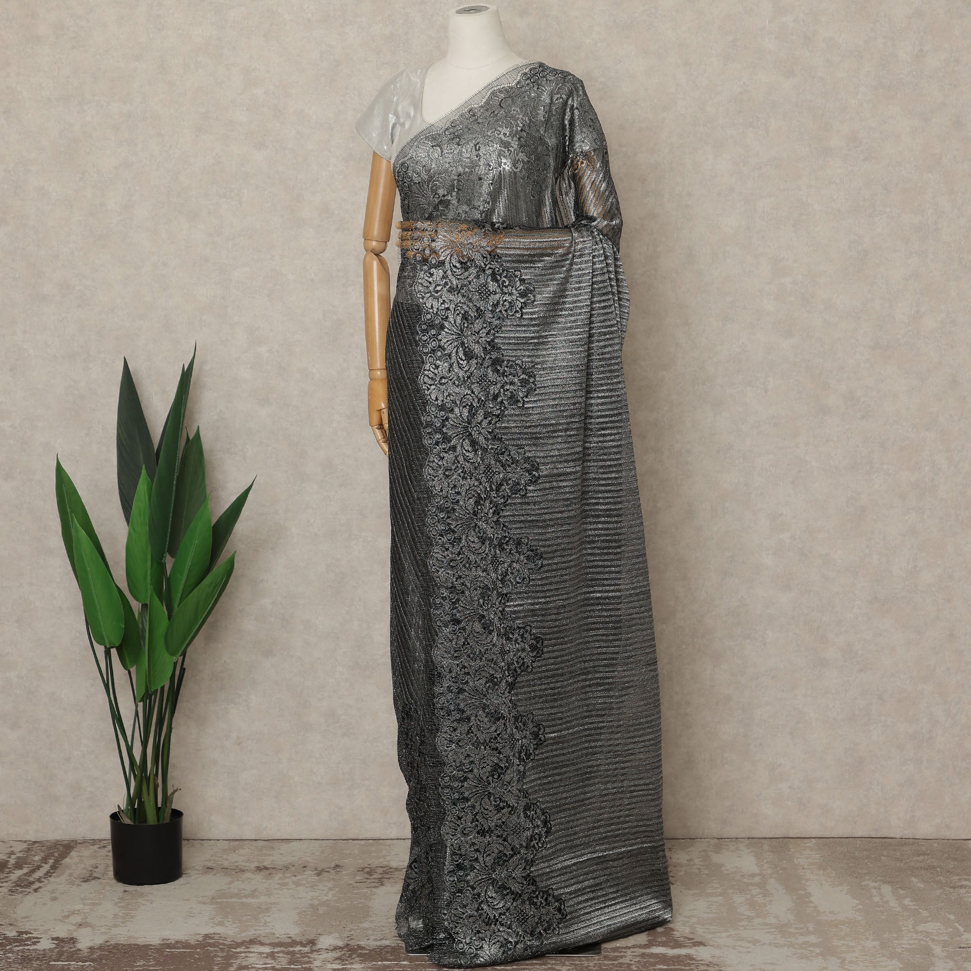 Steel Black Premium French Metallic Chantilly Lace Saree, 5.5 Mtrs Length, 110 Cms Width, Crafted in France-Blouse Not Included-D26689