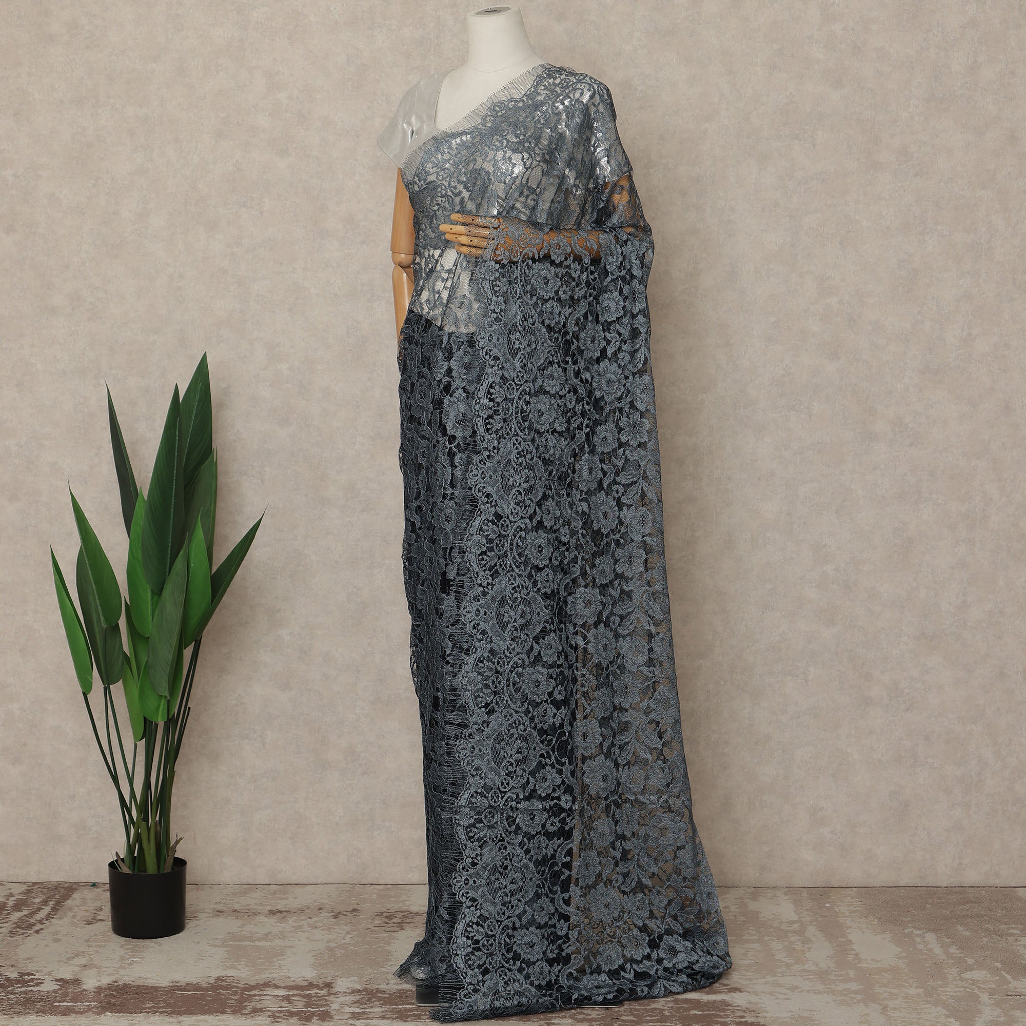 Steel Grey Black Premium French 2 Tone Chantilly Saree Lace Fabric 5.5 Meters x 110 Cms Width Elegant Floral Net Material From France Unstitched Blouse Not Included-D28154