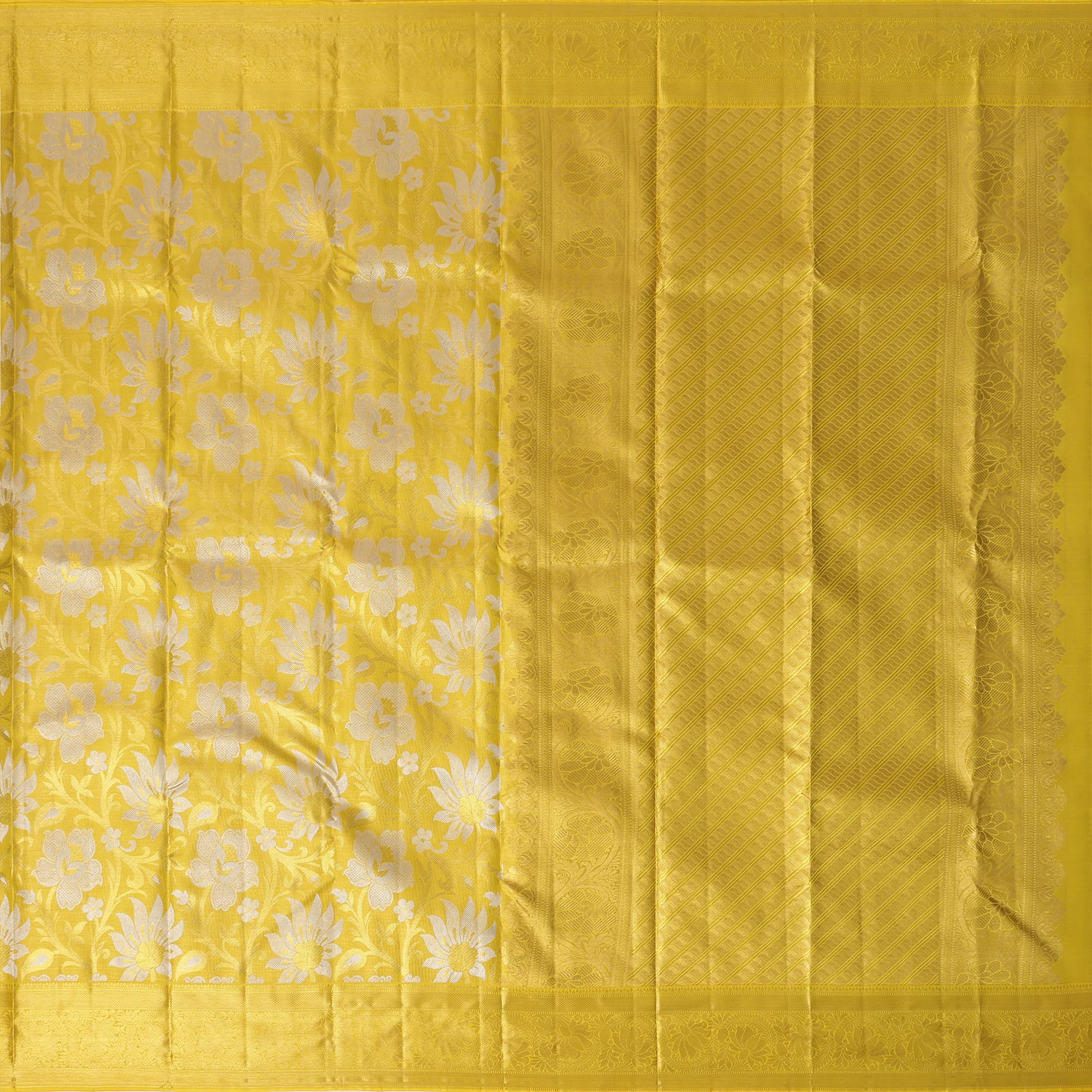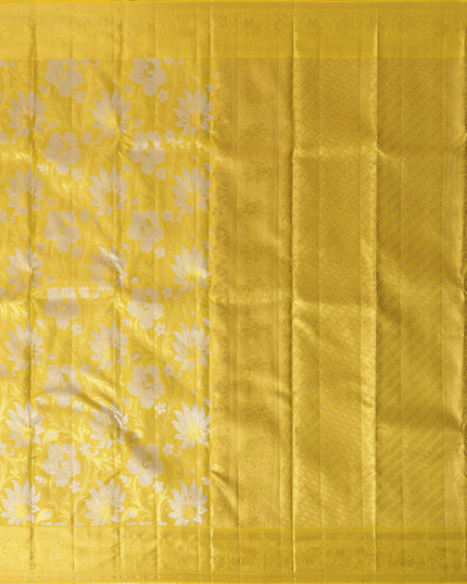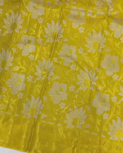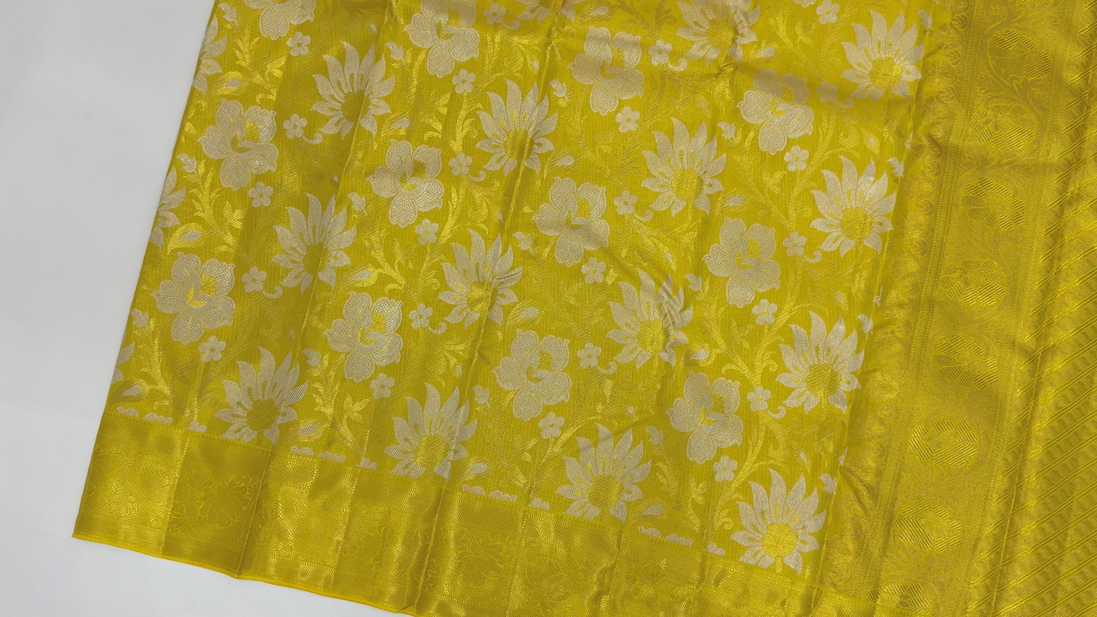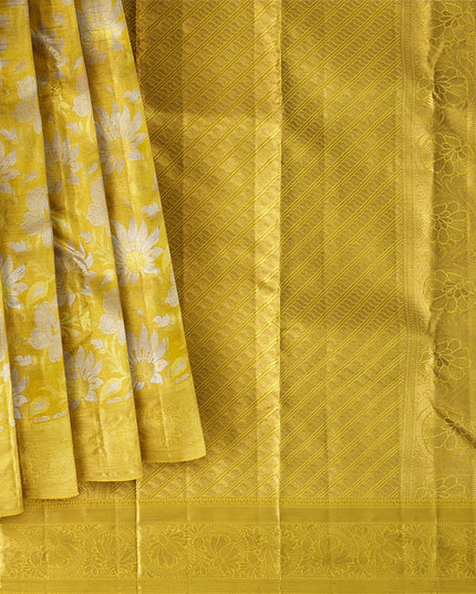 Sunflower Yellow Gold and Silver Floral Brocade Kanjeevaram Pure Silk Bridal Saree, All-Over Zari Weave with Classic Border, 110 cm Width, Made in India-D22775