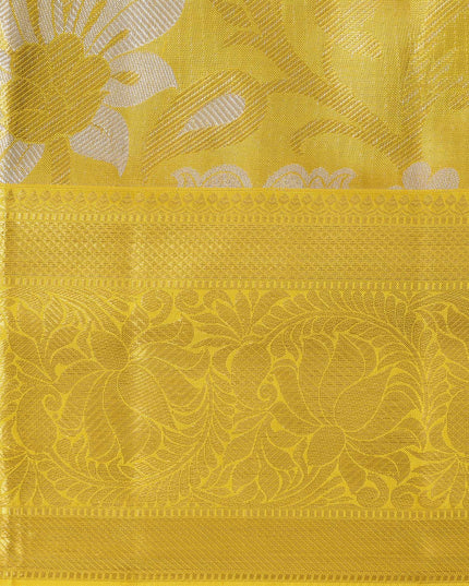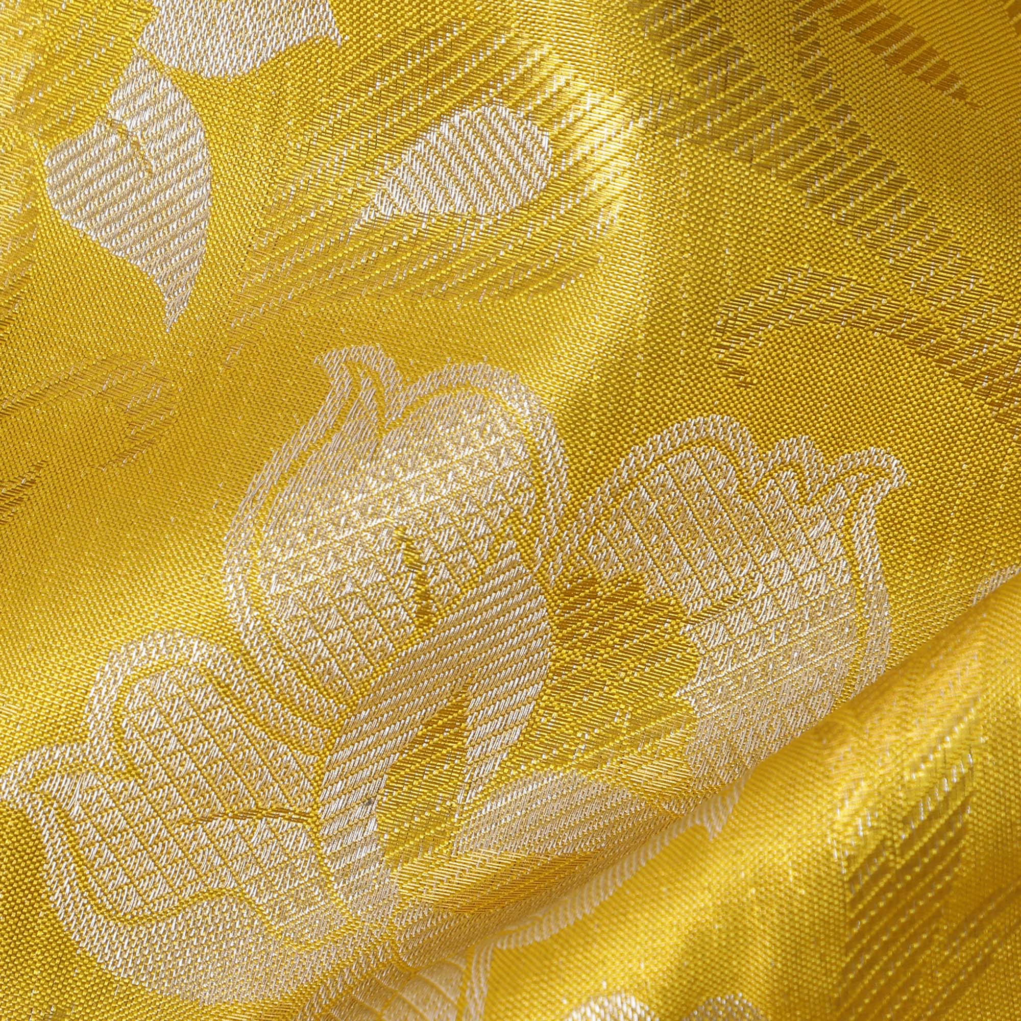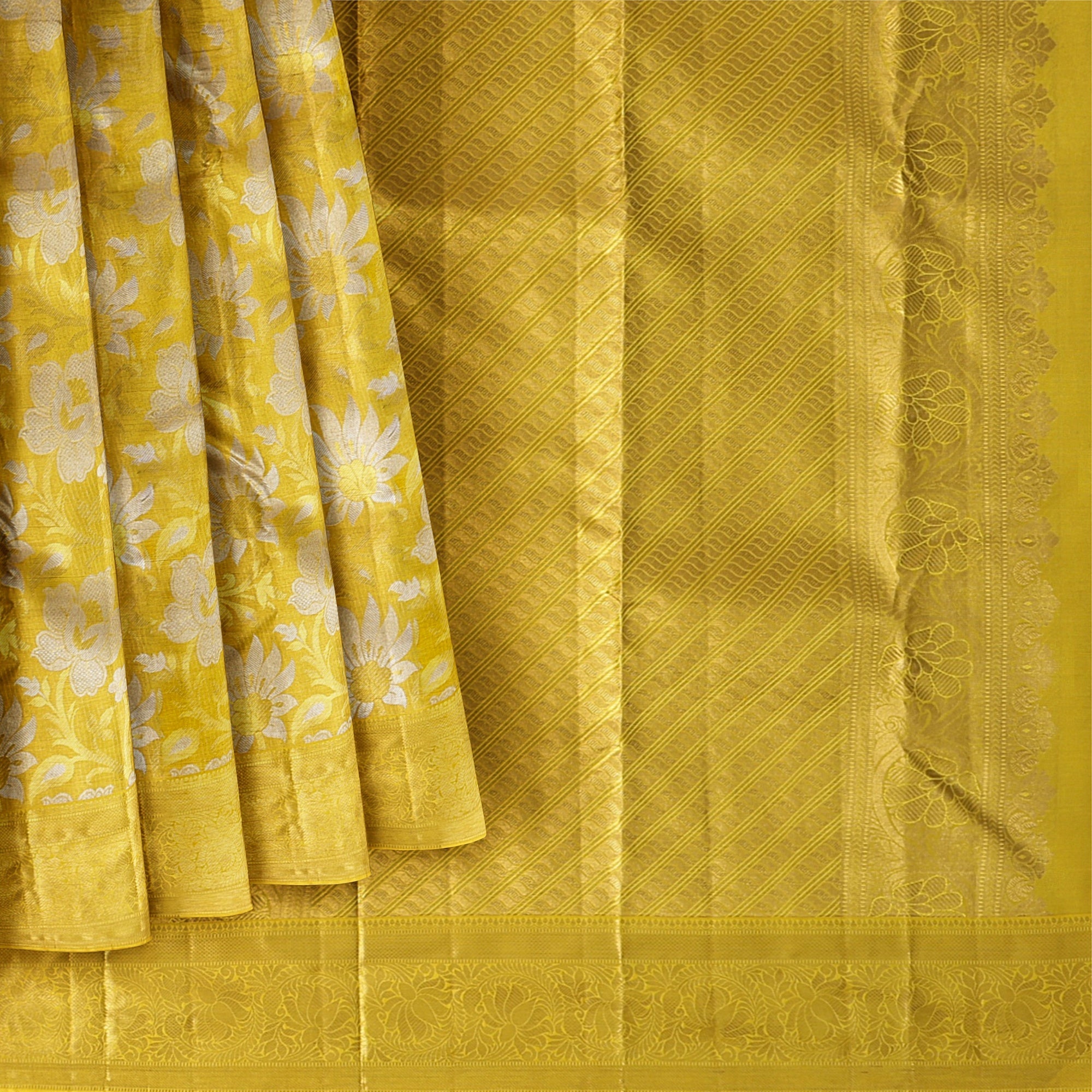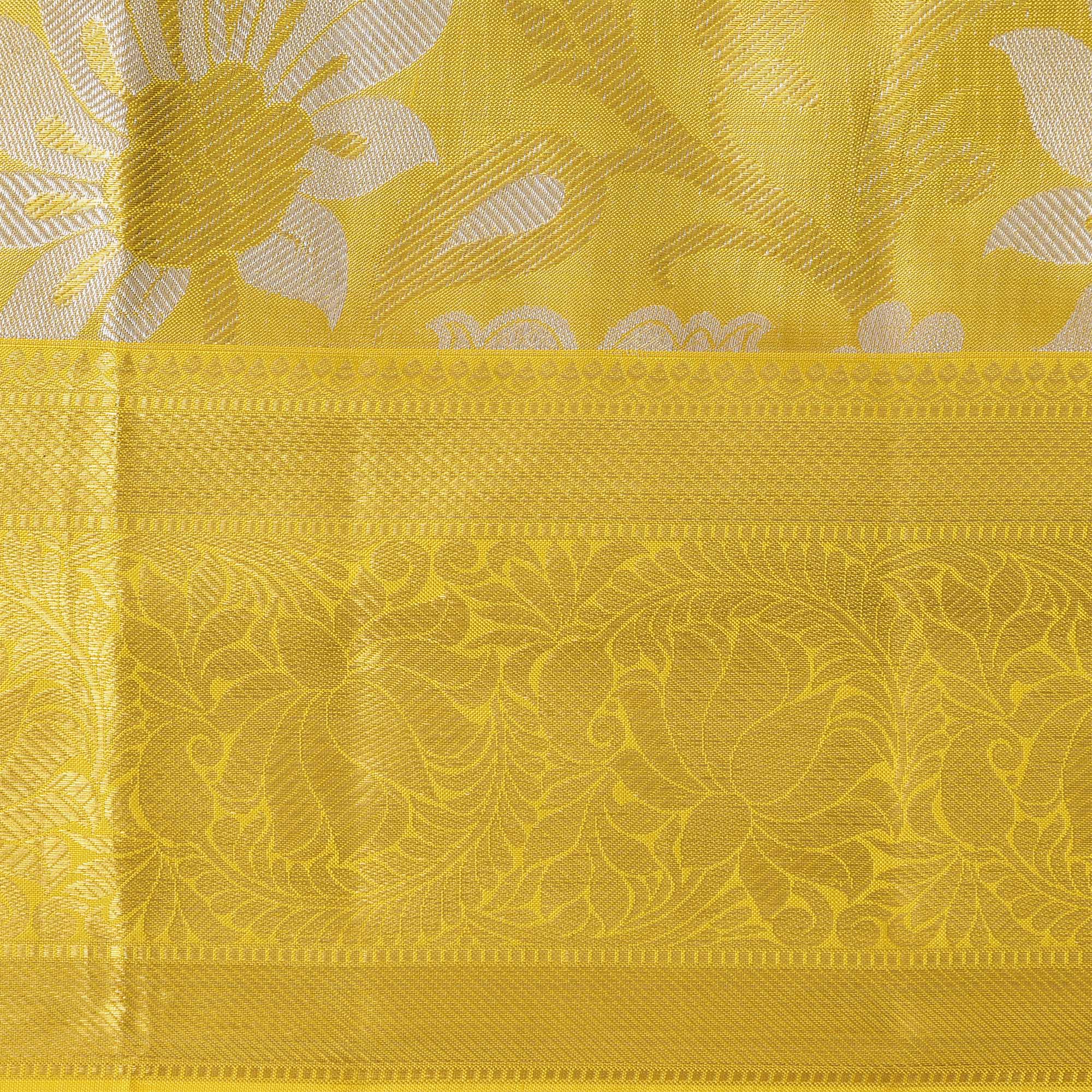 Sunflower Yellow Gold and Silver Floral Brocade Kanjeevaram Pure Silk Bridal Saree, All-Over Zari Weave with Classic Border, 110 cm Width, Made in India-D22775