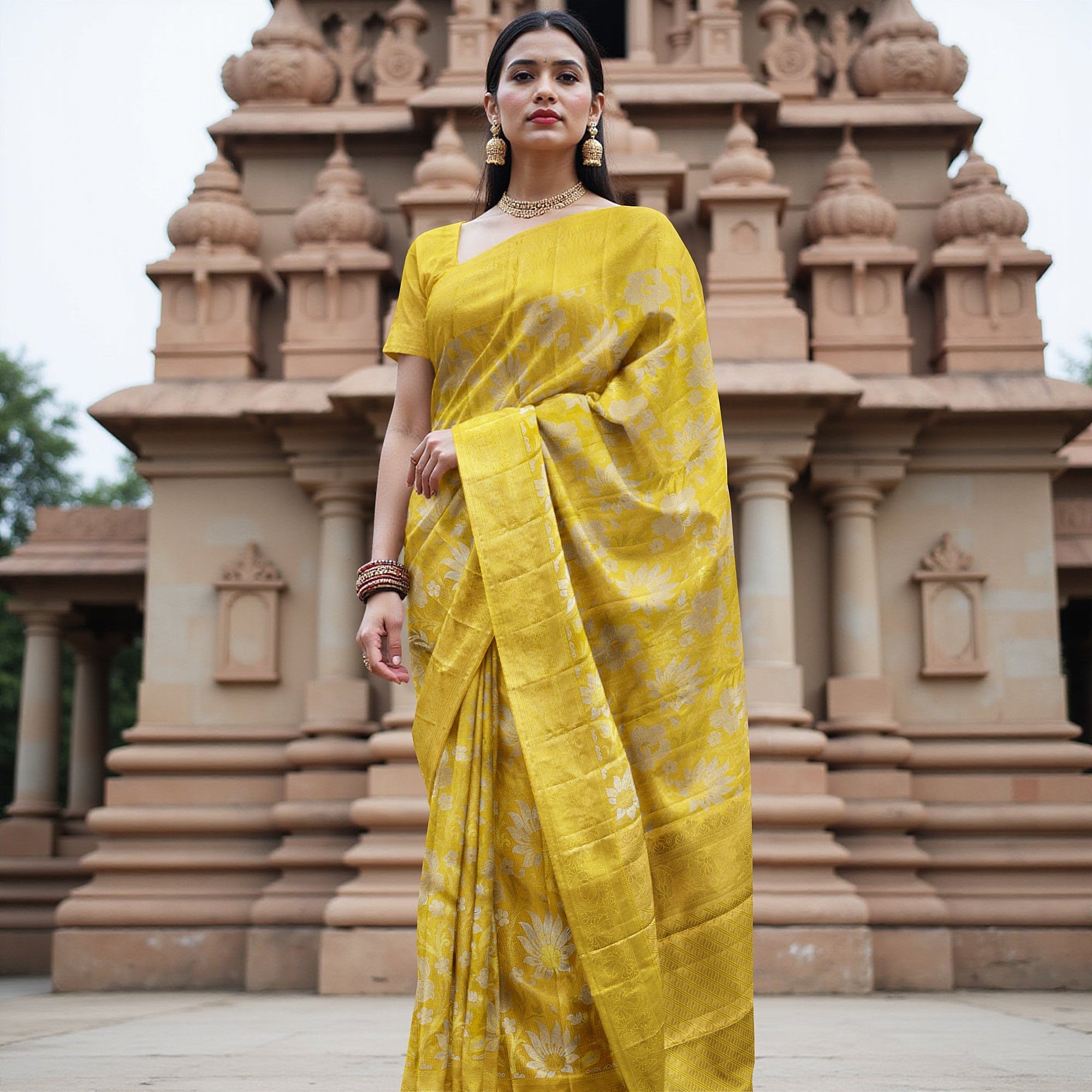 Glowing like morning sunrays across temple domes, this Sunflower Yellow Gold and silver Kanjeevaram pure silk bridal saree captures the joyful essence of South Indian celebration and sacred art. The body is intricately woven with all-over silver floral brocade motifs that echo the ornamental blooms seen in traditional ceiling frescoes and divine iconography. Framed with a self-toned classic border, the saree balances richness and radiance with elegance. Crafted from Regal Fabrics, each saree takes 48 hours of precise, handwoven artistry by master weavers to achieve its flawless composition. The silk falls luxuriously, enveloping the bride in grace and brilliance. It comes complete with a matching blouse piece for perfect pairing. Shop online to own this sunshine-wrapped heirloom, where heritage meets vivid beauty.
